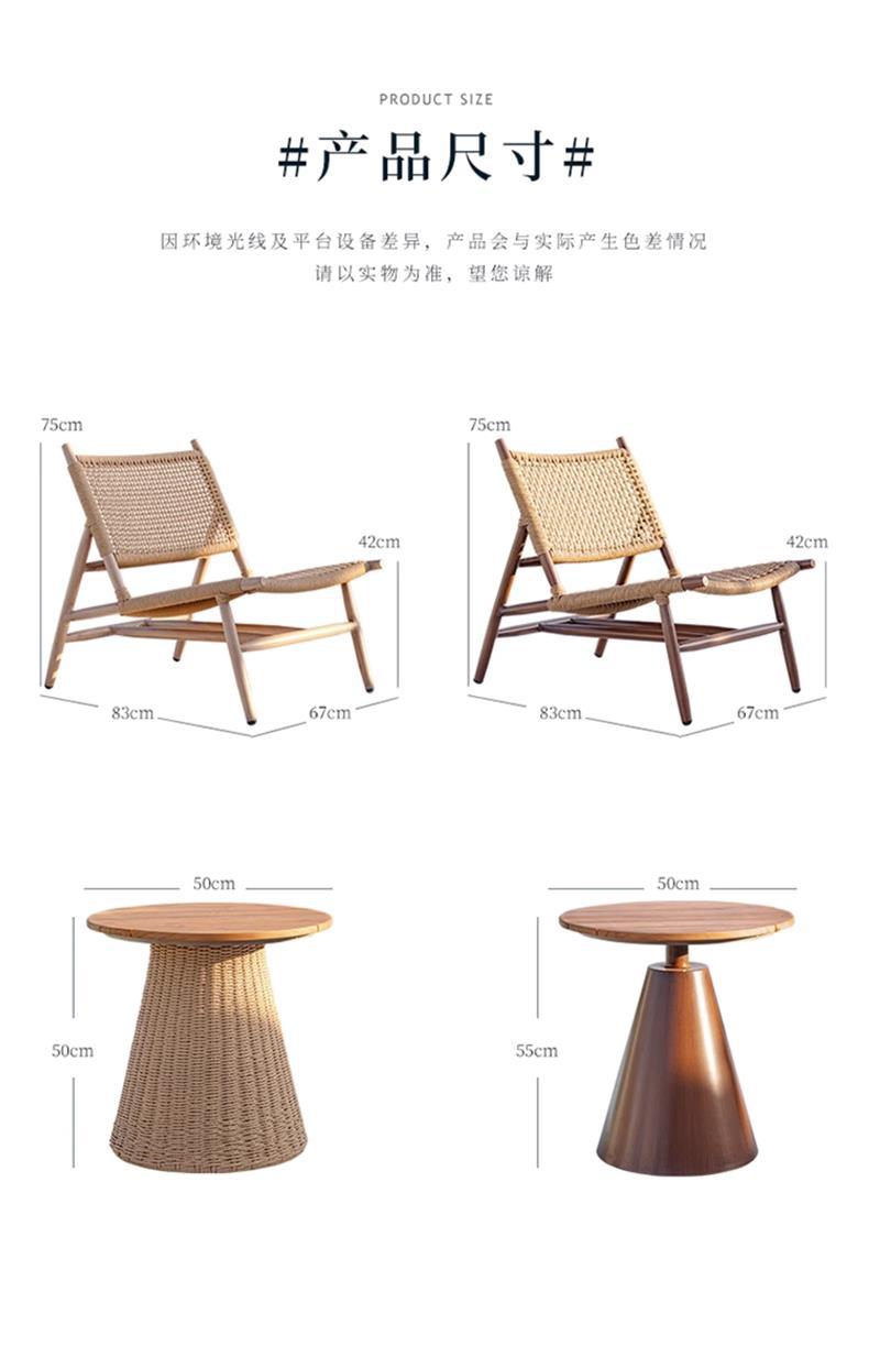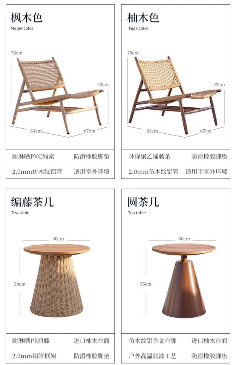 | Color | Silla de ocio de color teca (ratán de polietileno), silla de ocio de color Arce (cuerda de pvc), Mesa de té redonda de 50 cm (mesa de teca), Mesa de té de Ratán de 50 cm (mesa de teca), silla de ocio de color teca + Mesa de té redonda de 50 cm, silla de ocio de color teca 2 sillas + Mesa de té redonda de 50 cm, silla de ocio de color Arce + Mesa de té de Ratán de 50 cm, Mesa de té de ocio de color Arce 2 sillas + Mesa de café de Ratán de 50 cm |