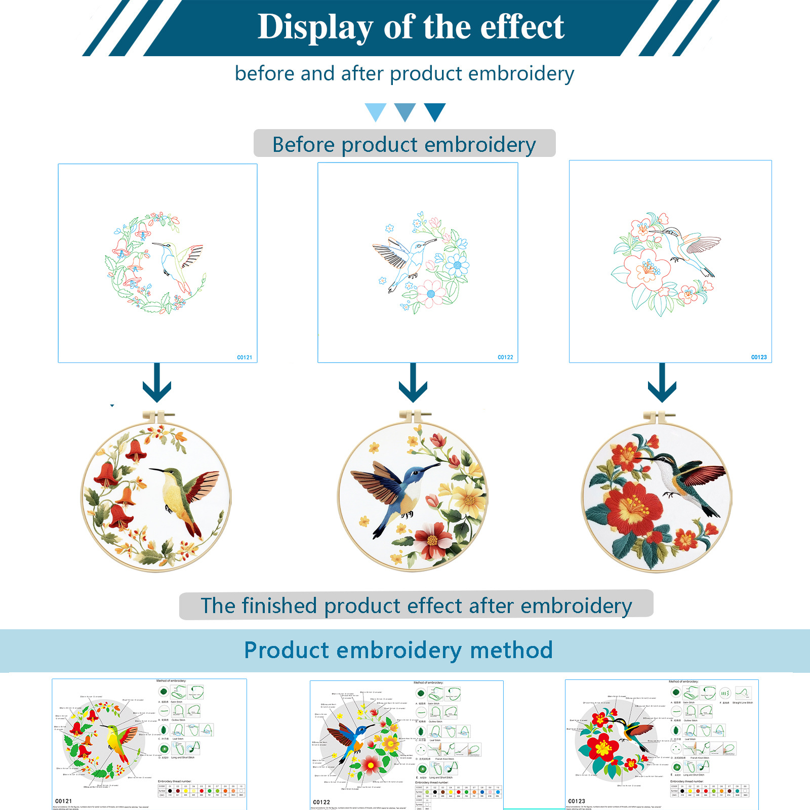 | Número de artículo | Conjunto de tres piezas de bordado de la combinación de flores y pájaros c0121 + c0122 + c0123 |