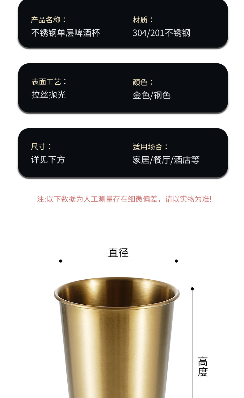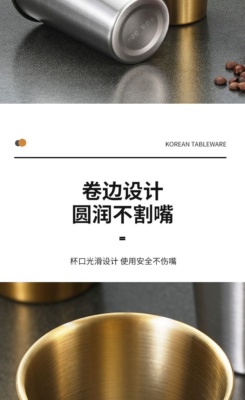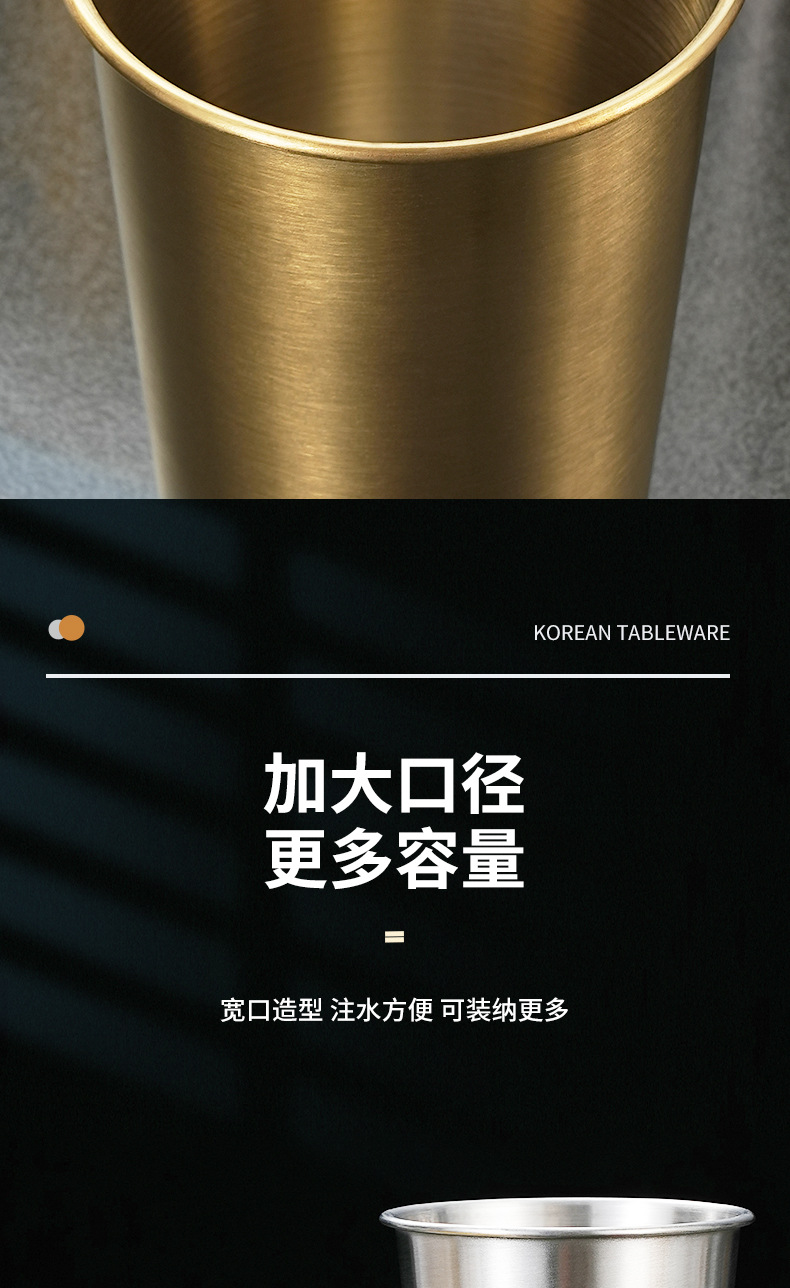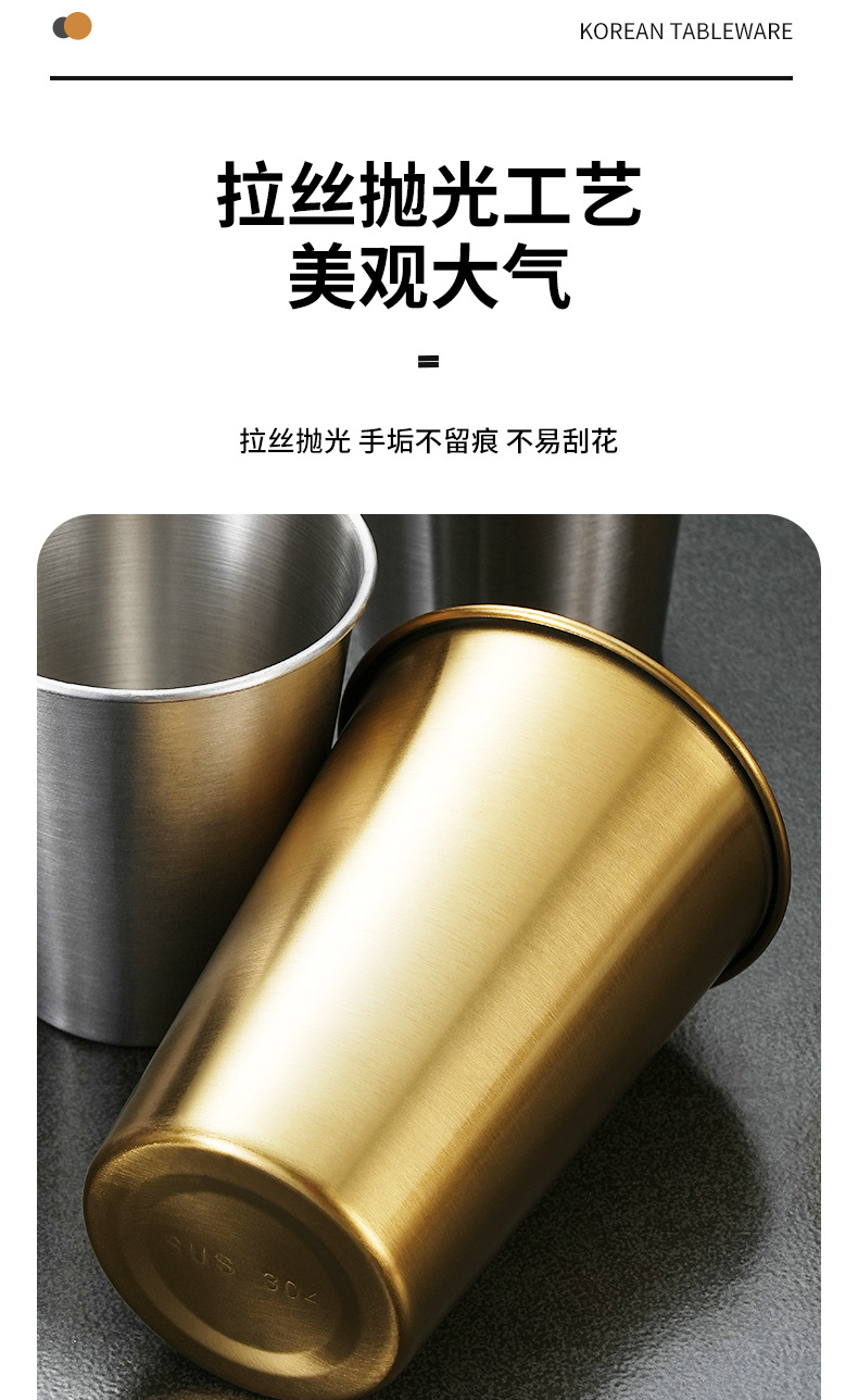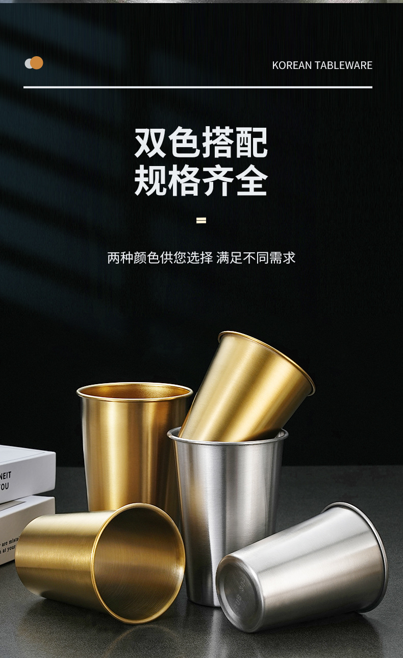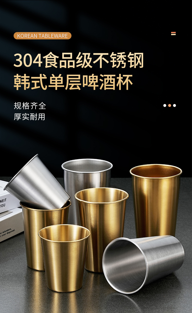 Estilo coreano 304 taza de cerveza de acero inoxidable hogar taza de agua de una sola capa taza boca taza dorada al aire libre taza apilable taza multiusos