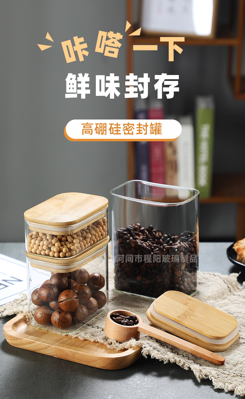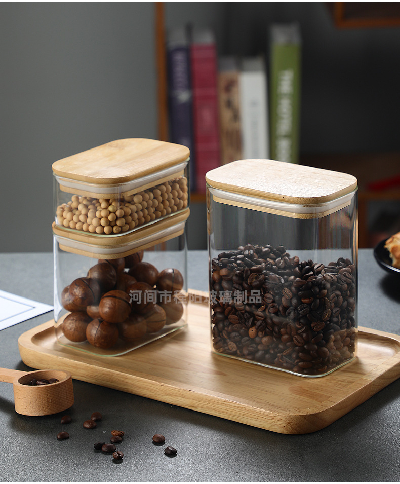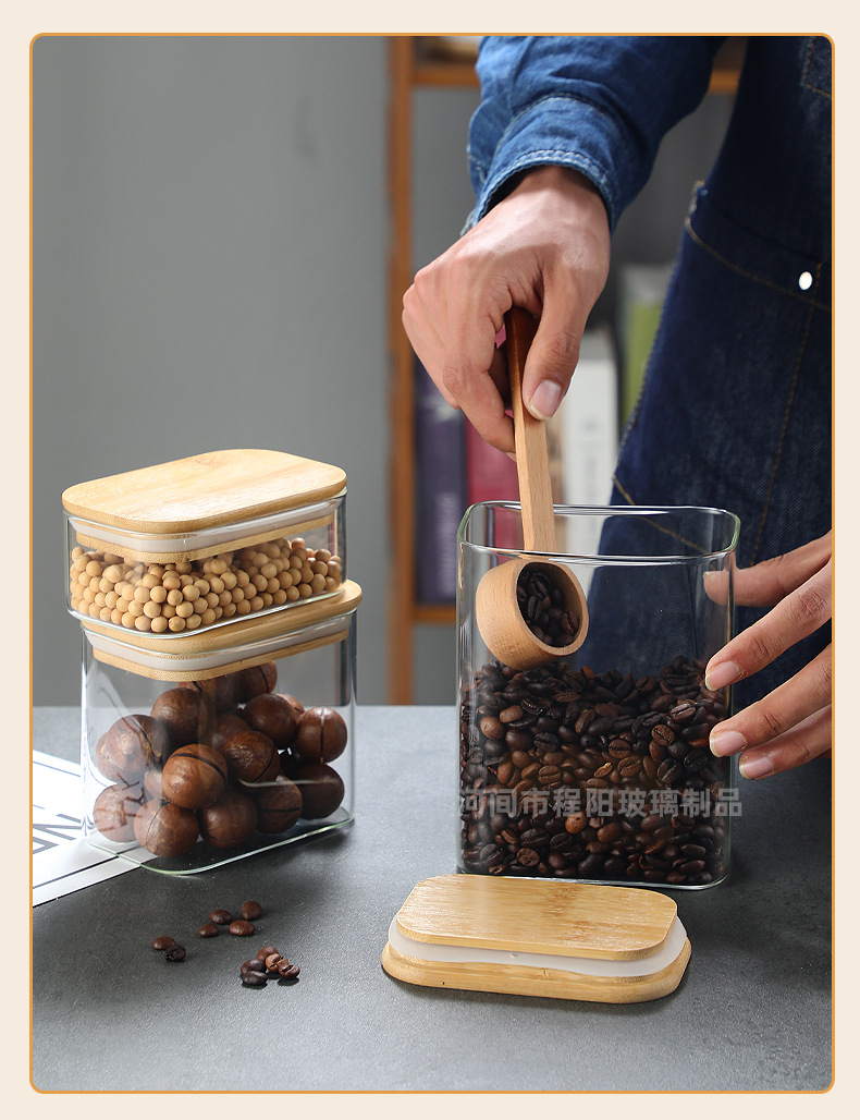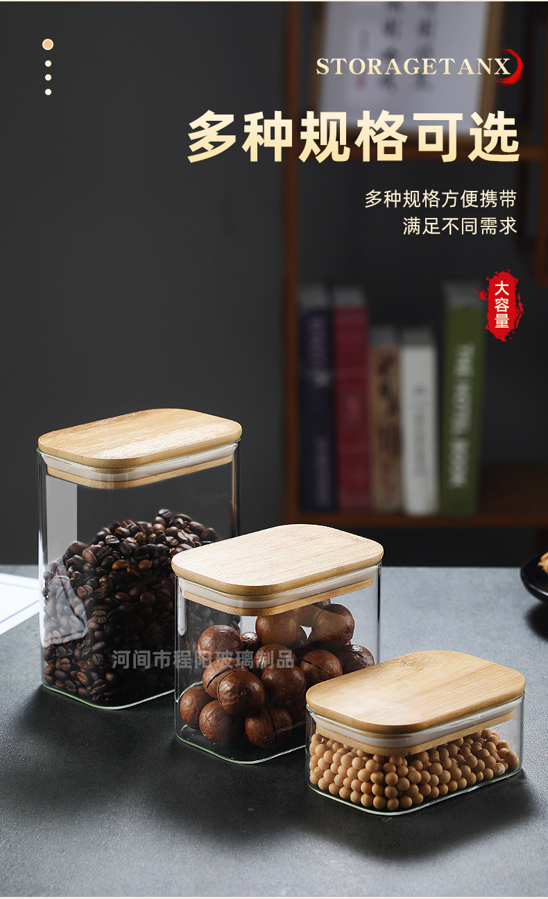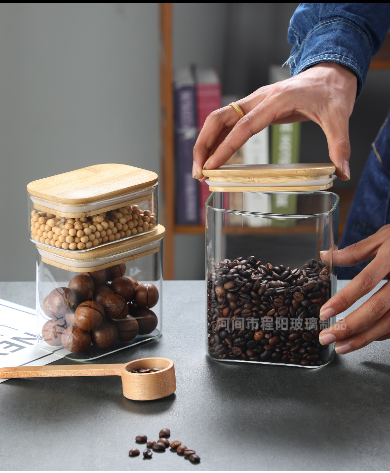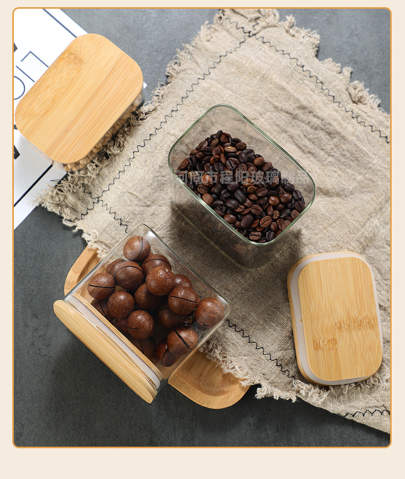 Tarro rectangular de vidrio sellado para almacenamiento de granos en la cocina, tarro con tapa de bambú, botella para té, tarro de almacenamiento de vidrio de borosilicato alto.