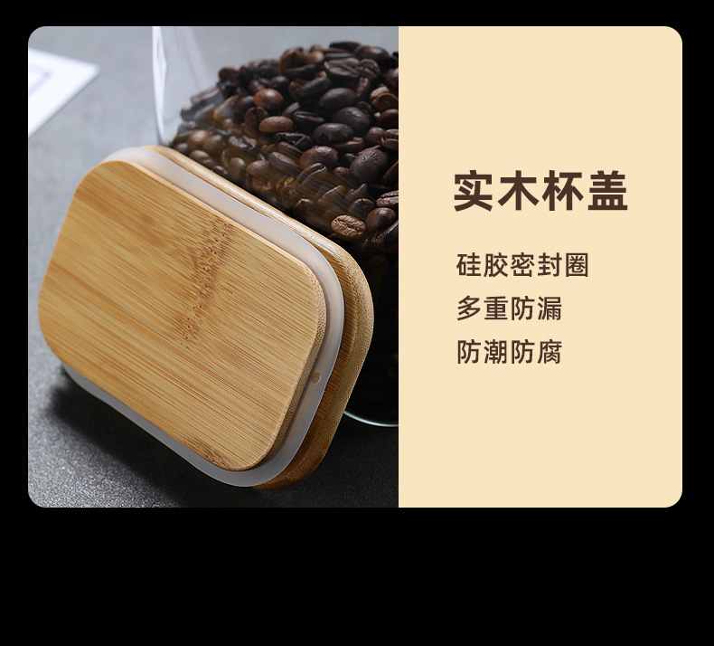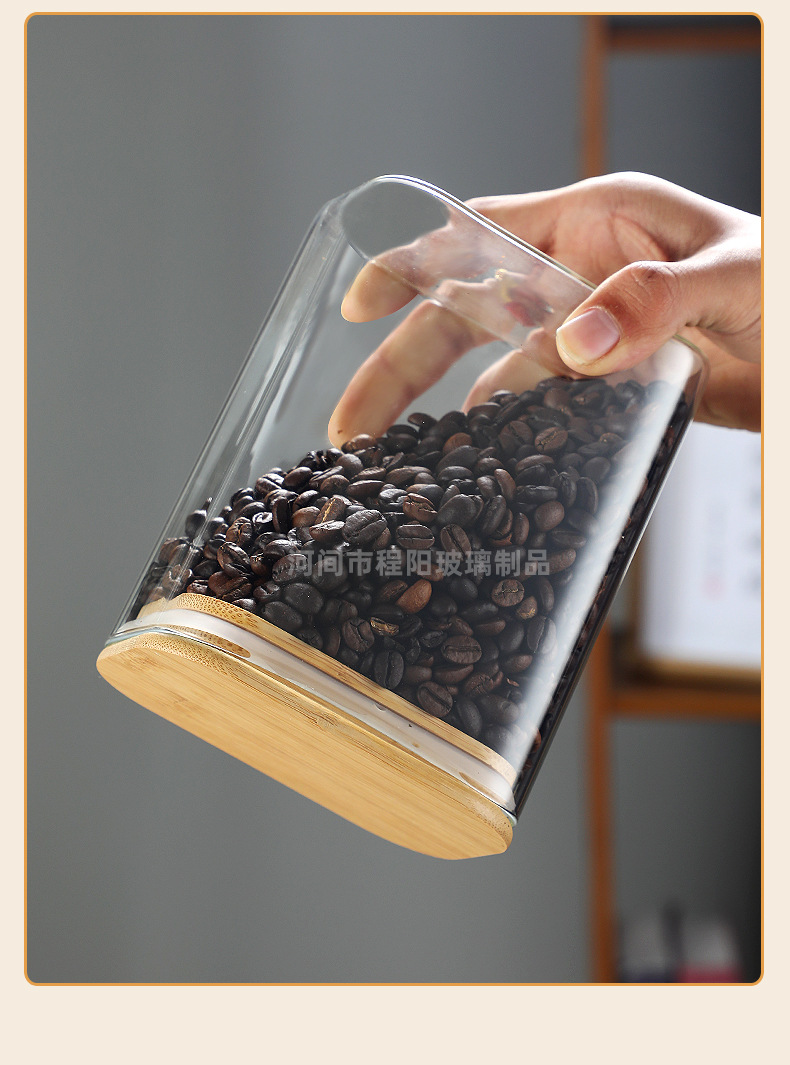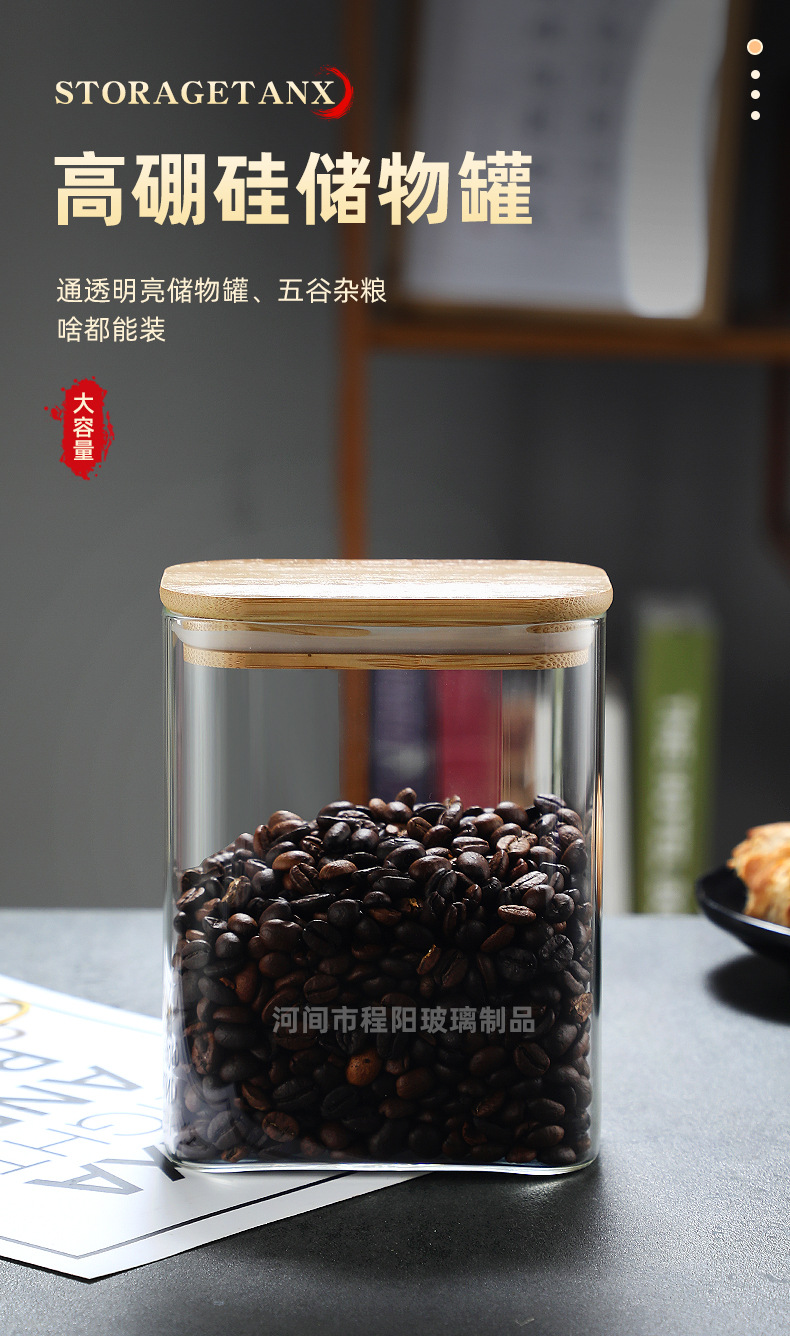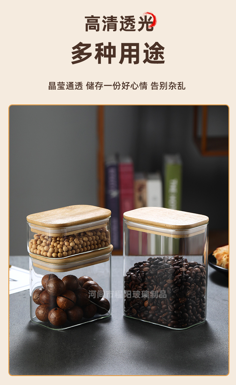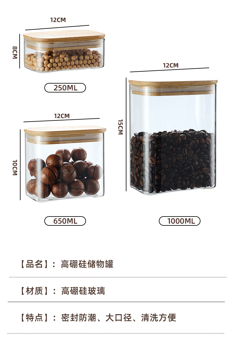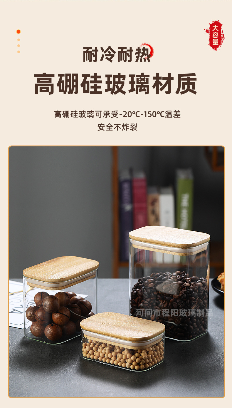 Tarro rectangular de vidrio sellado para almacenamiento de granos en la cocina, tarro con tapa de bambú, botella para té, tarro de almacenamiento de vidrio de borosilicato alto.