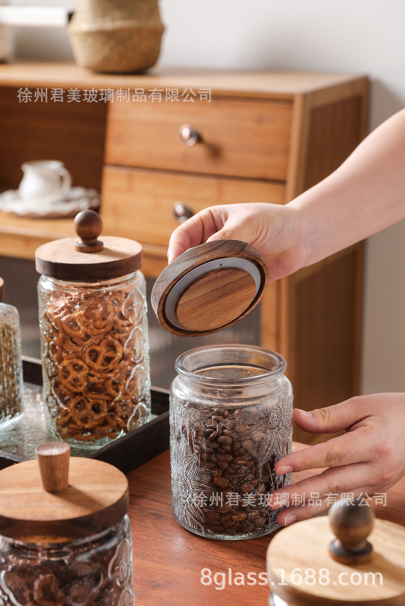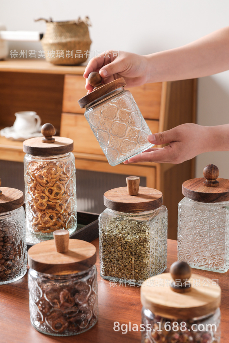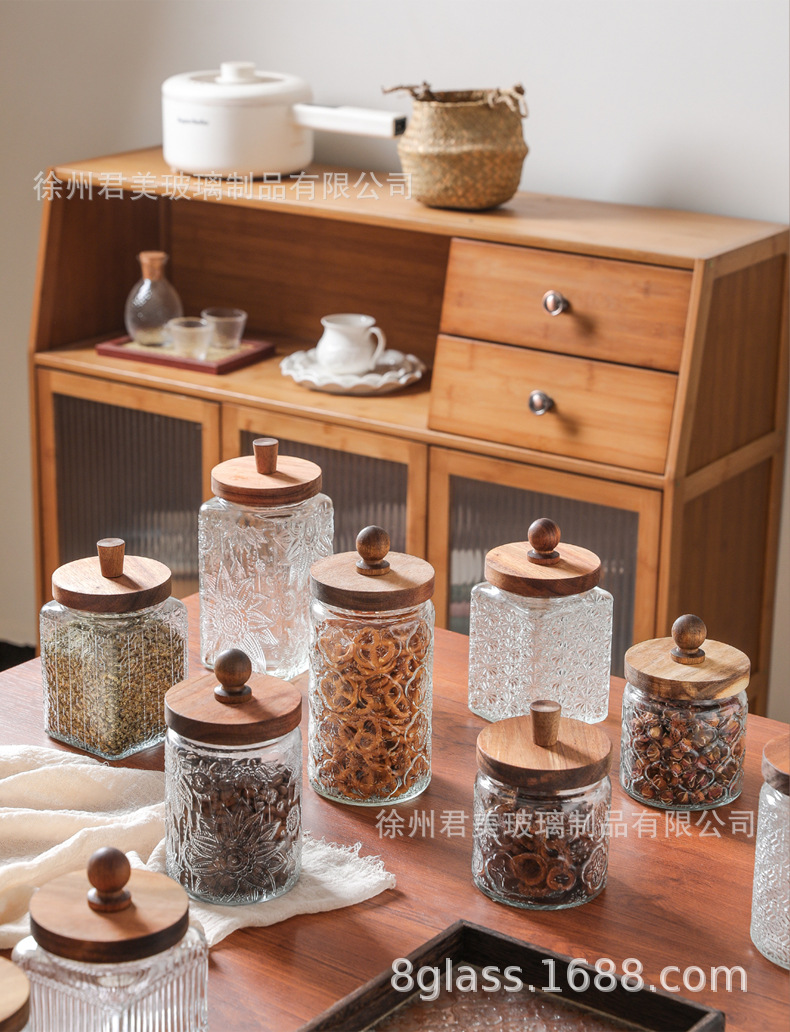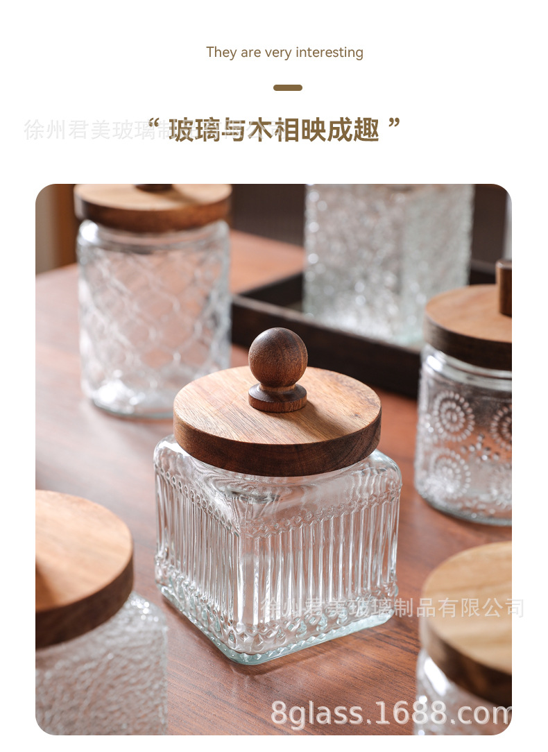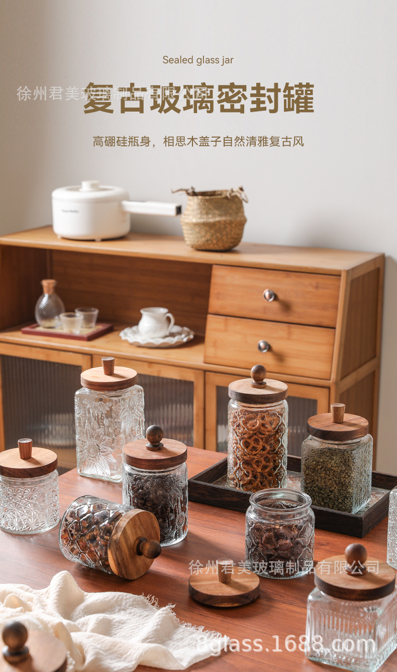 Tanque de almacenamiento de vidrio retro Begonia casera granos naranja frutas secas lata de almacenamiento de té lata de Acacia cubierta de madera mayorista