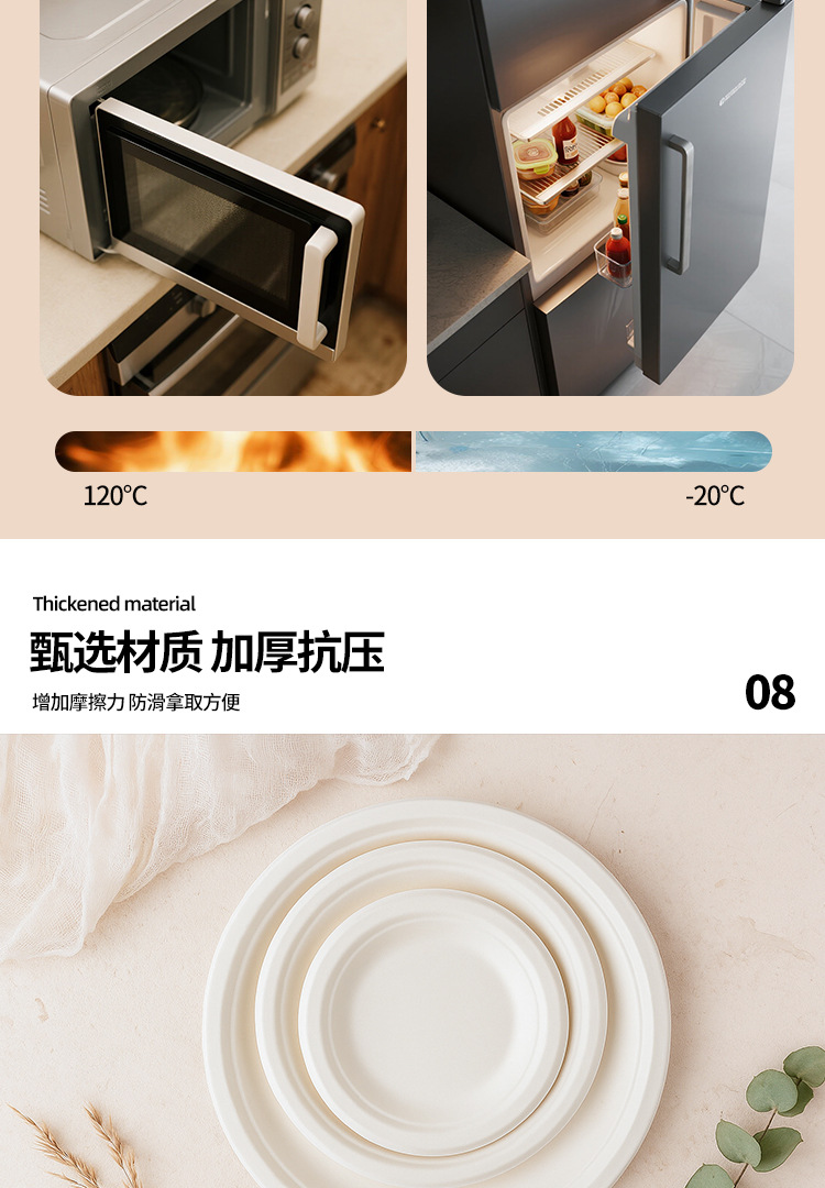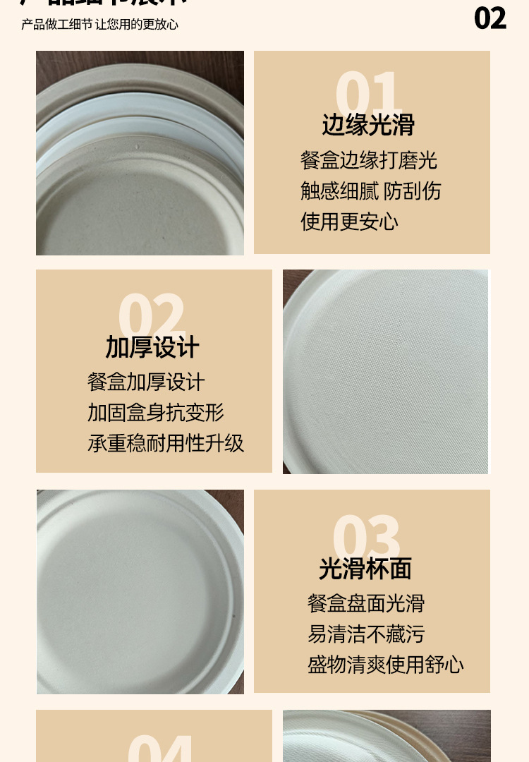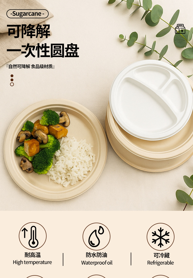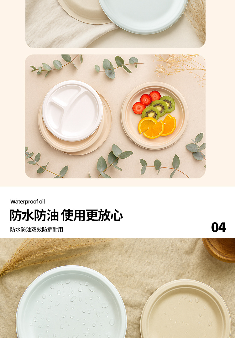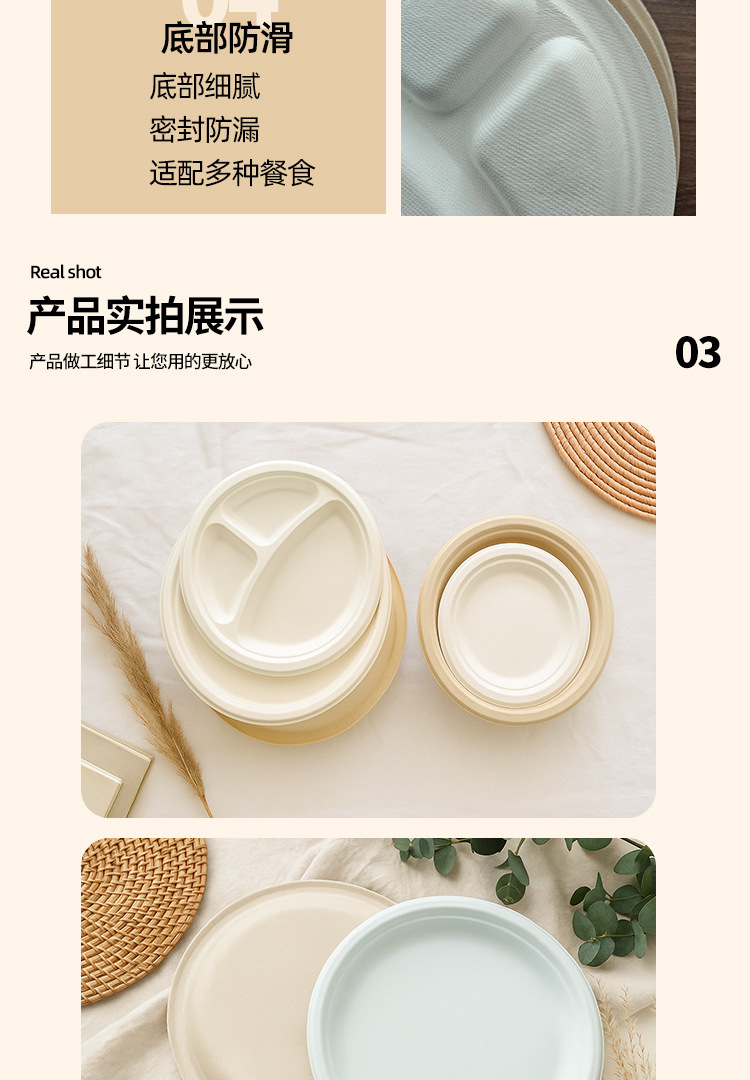 Platos desechables de Amazon, platos de calidad alimentaria, platos redondos biodegradables de pulpa de caña de azúcar, tazones de papel para pasteles y palillos
