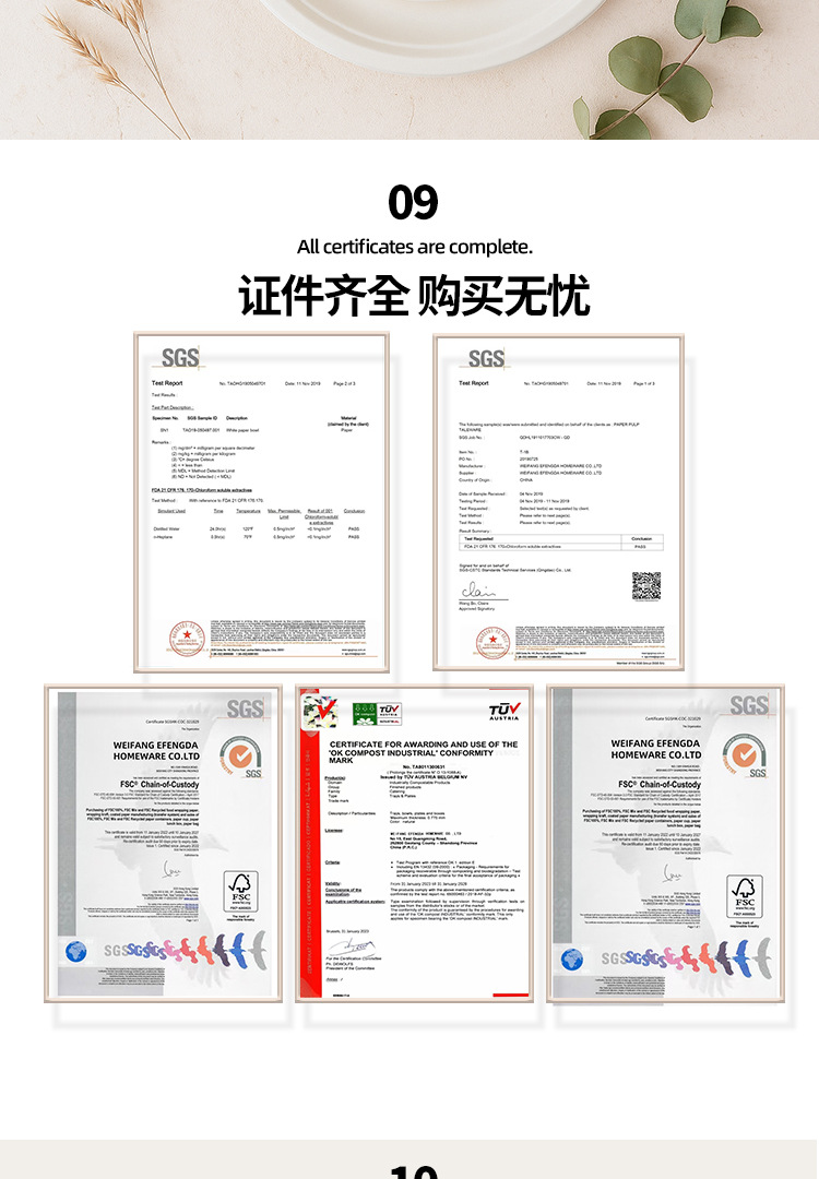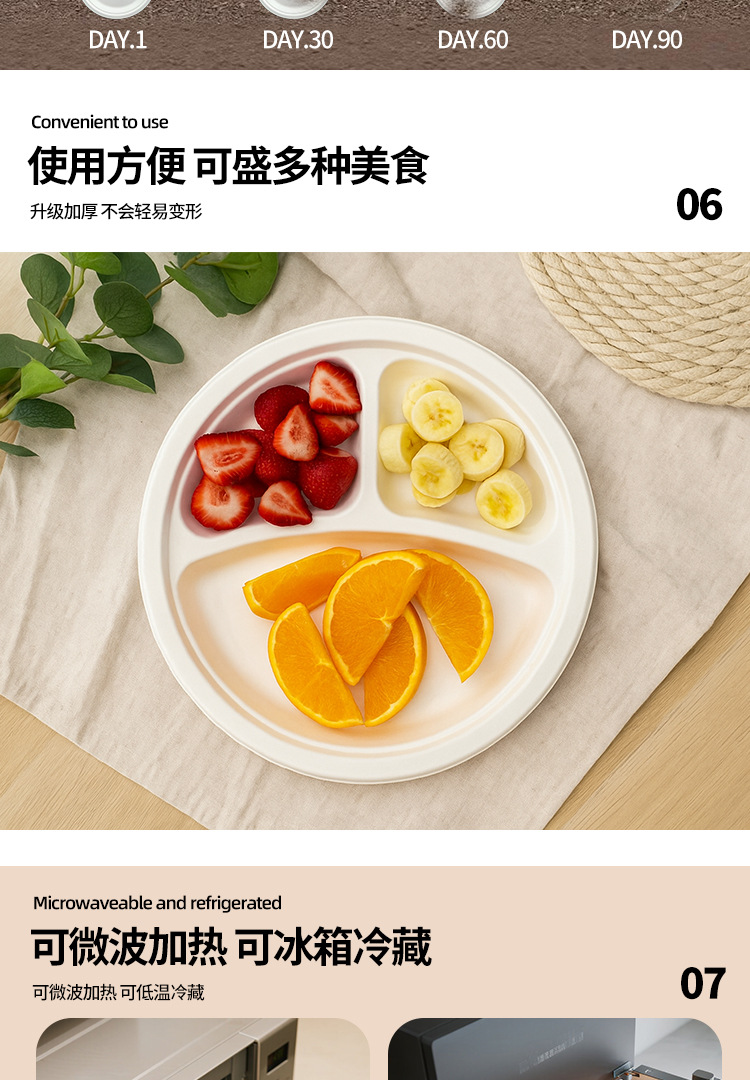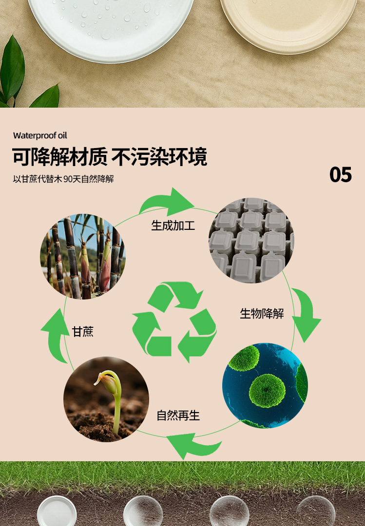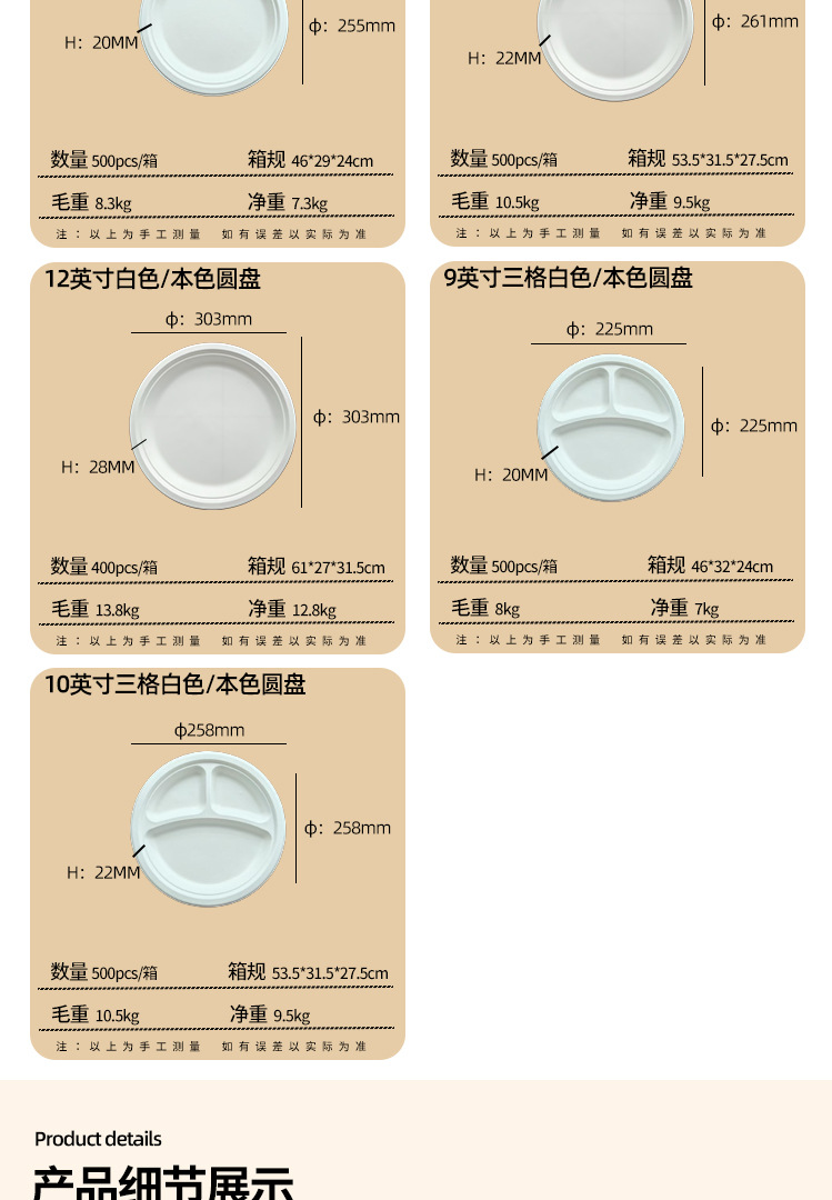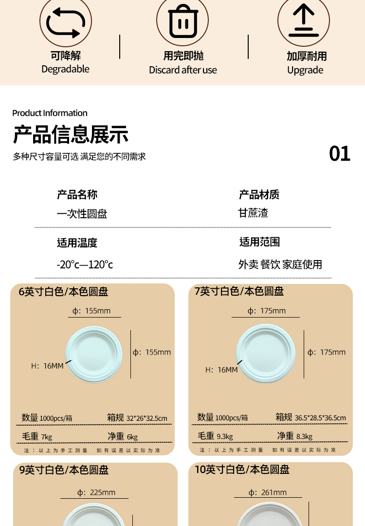 Platos desechables de Amazon, platos de calidad alimentaria, platos redondos biodegradables de pulpa de caña de azúcar, tazones de papel para pasteles y palillos