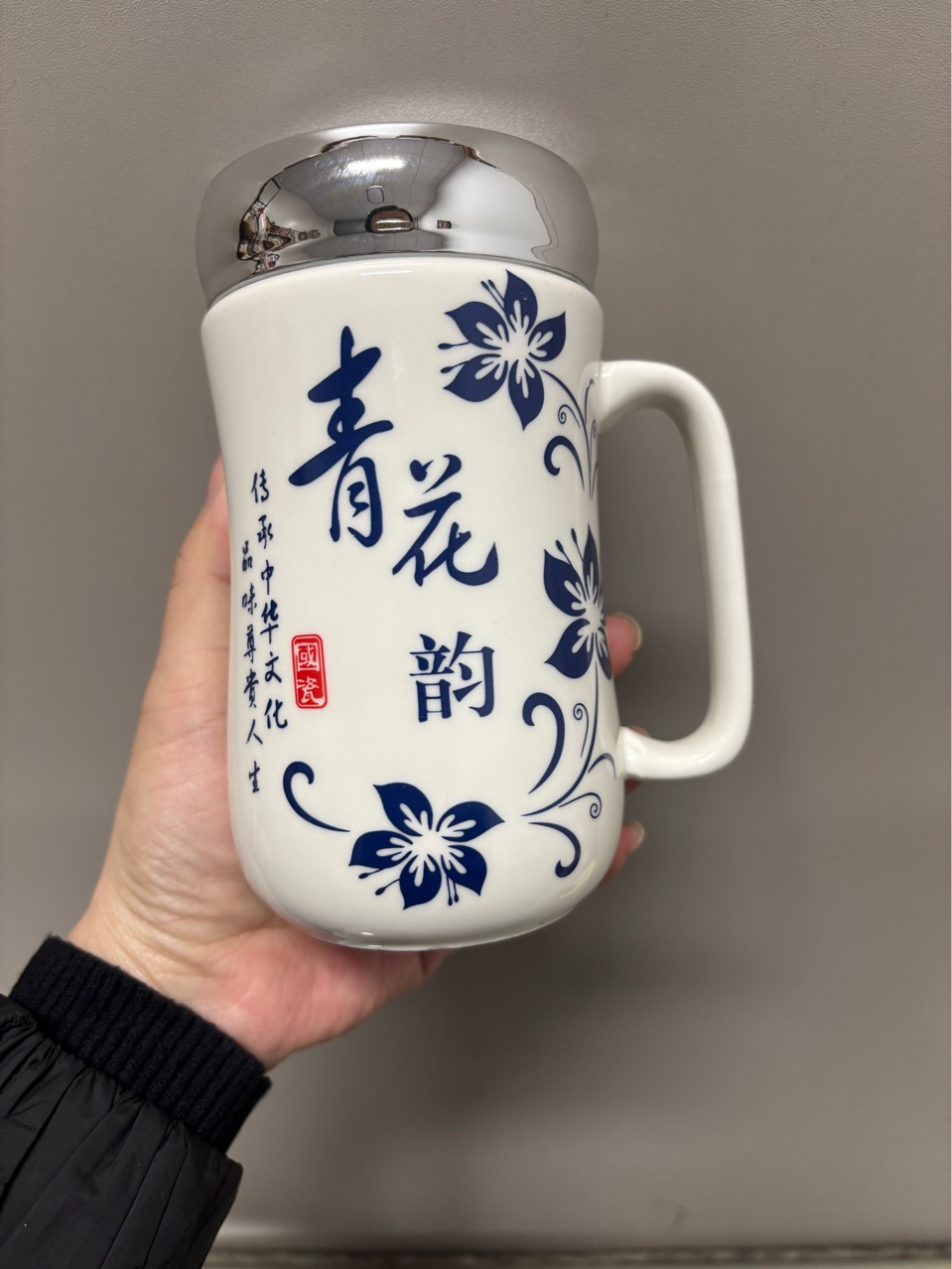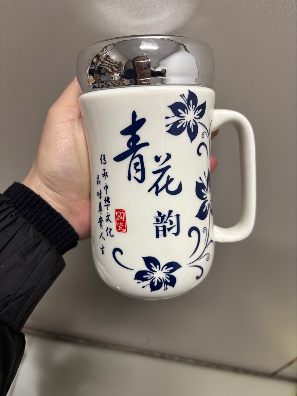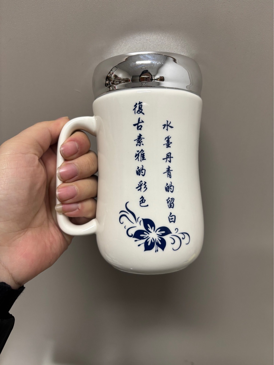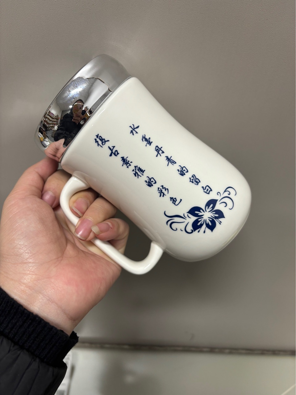 Taza de cara con espejo de rima azul y blanco Taza de cerámica al por mayor para el cabello Taza de agua potable de alto valor para el hogar Cerámica para estudiantes de dibujos animados