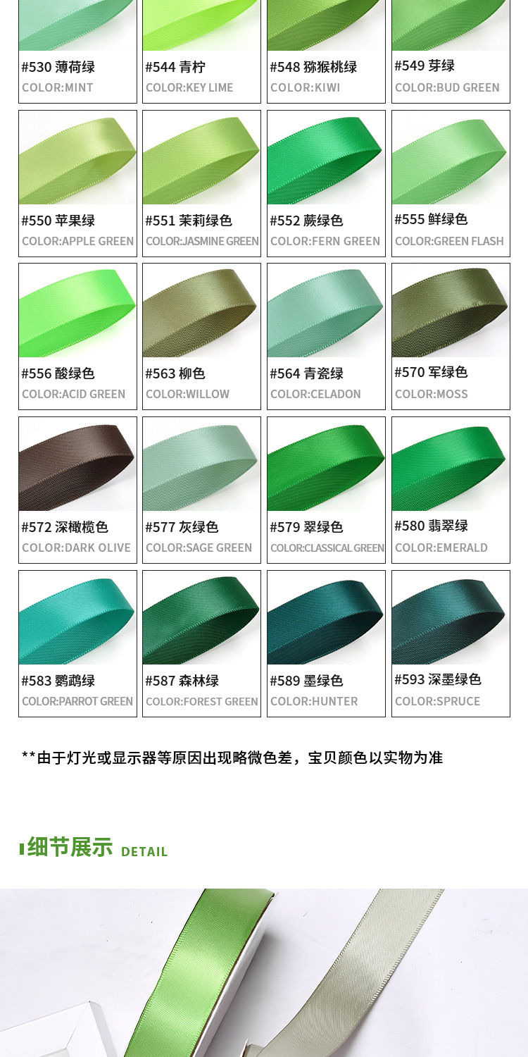 | Color | 510 Menta de hielo,513 verde claro,520 algas verdes,524 color de jugo de pomelo,530 verde menta,544 color Lima,548 Kiwi Verde,549 Verde Bud,550 verde manzana,551 Verde jazmín,552 Helecho Verde,555 verde fresco,556 verde ácido,563 Color de sauce,564 Celadon verde,570 Verde Ejército,572 Oliva oscuro,579 verde esmeralda,580 verde esmeralda,583 loro verde,587 Bosque Verde,589 verde oscuro,593 verde oscuro |