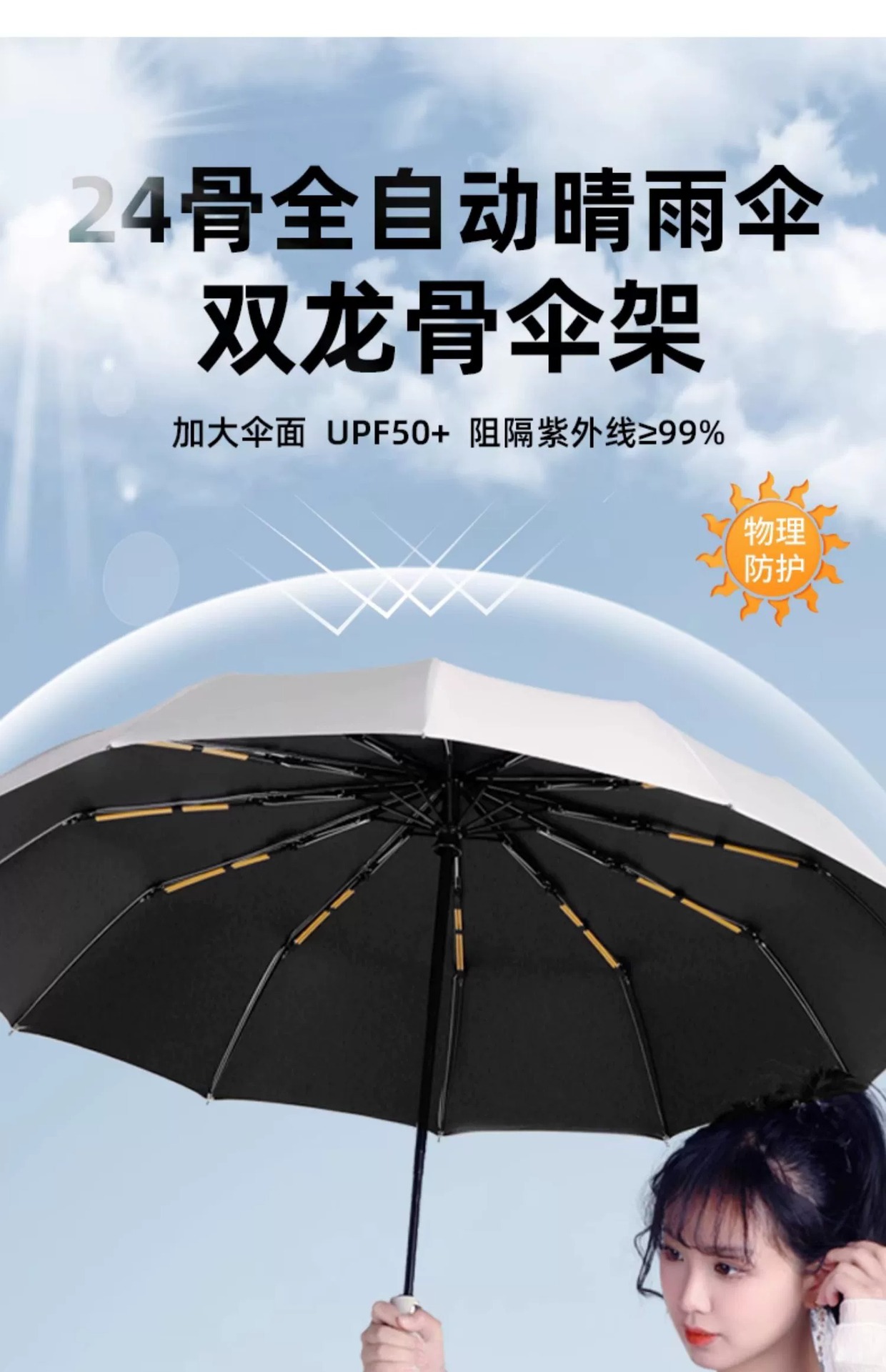Paraguas de 24 varillas con revestimiento negro, paraguas plegable reforzado, paraguas automático para hombres de negocios, doble uso para sol y lluvia, venta al por mayor en stock, resistente al viento y con protección solar.