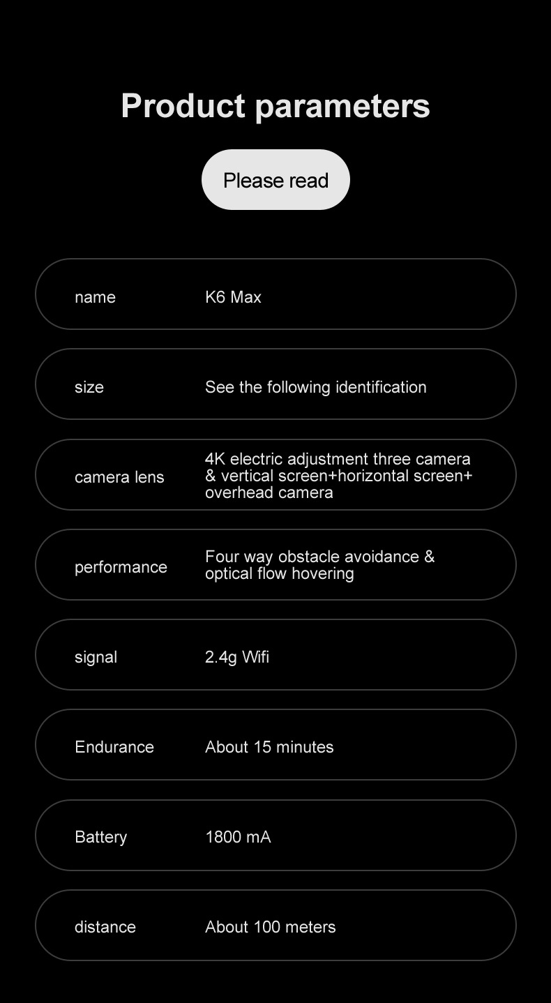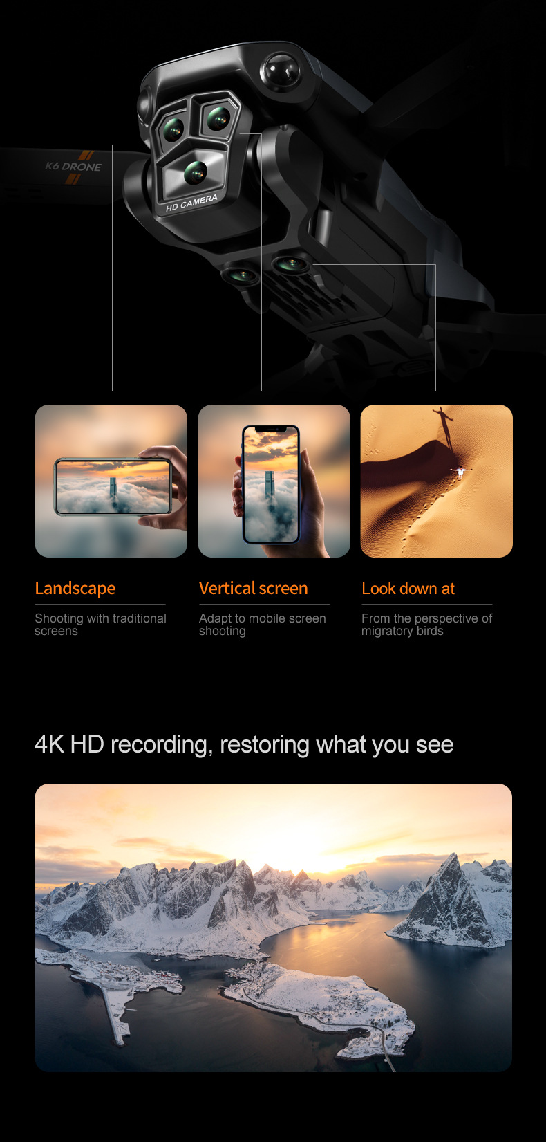 | Colores | Posicionamiento de flujo óptico de tres cámaras para evitar obstáculos,Posicionamiento de flujo óptico de tres cámaras para evitar obstáculos,Estándar negro,Estándar naranja,K6Max+ versión de transmisión con control remoto y control de pantalla. |