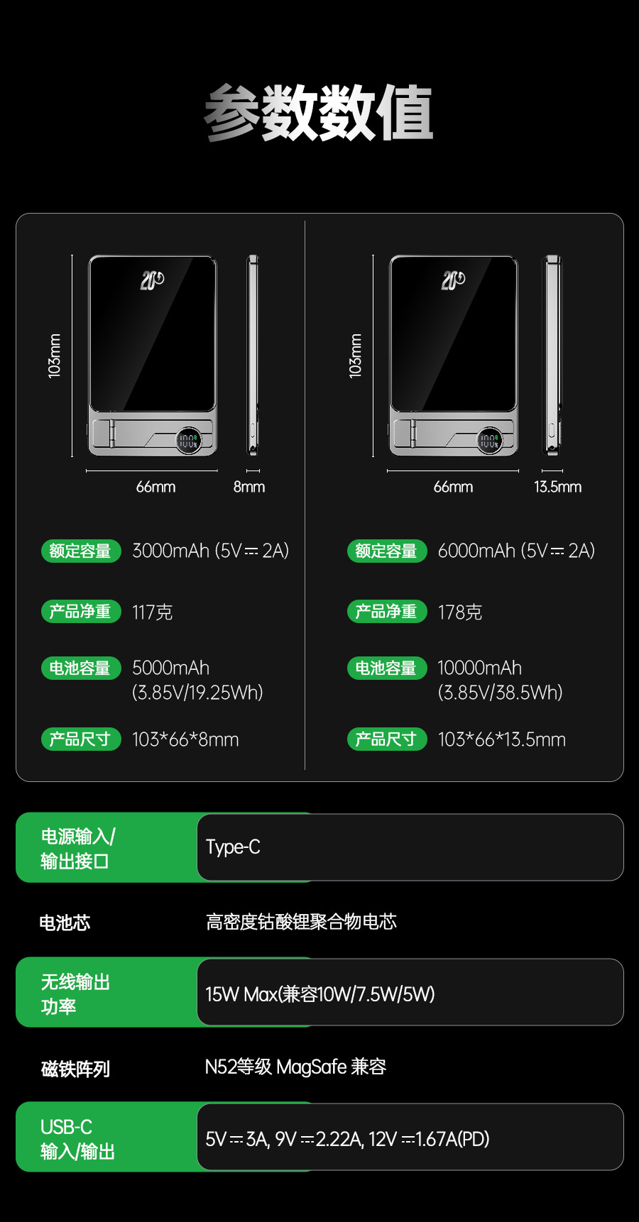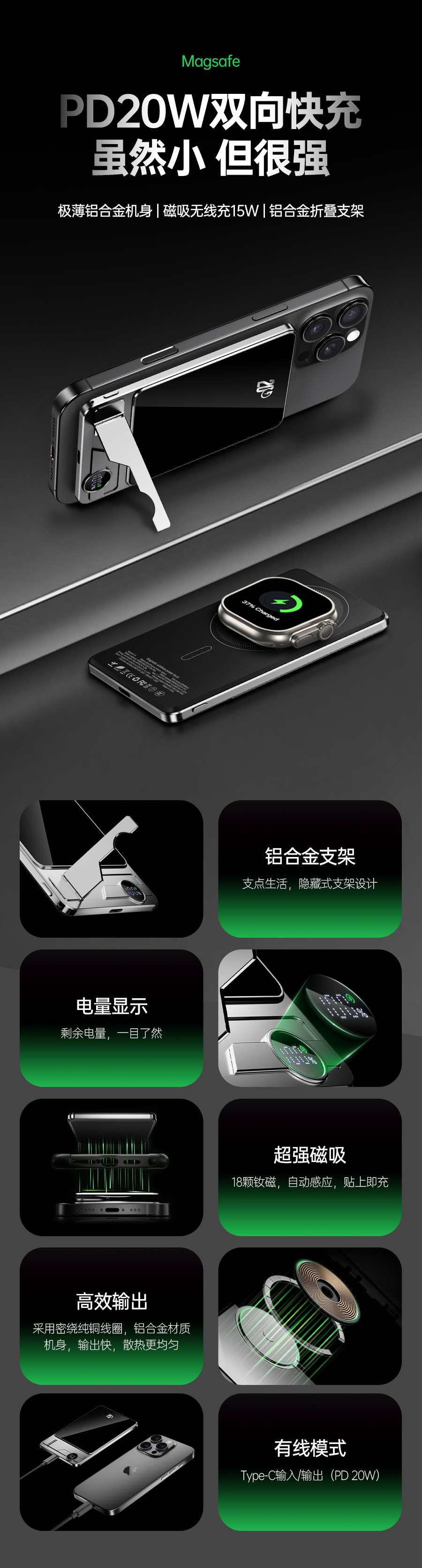 Banco de energía inalámbrico de succión magnética Carga rápida ultrafina con soporte oculto con cordón Batería externa Fuente de alimentación móvil