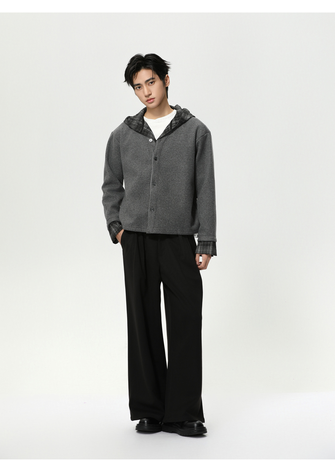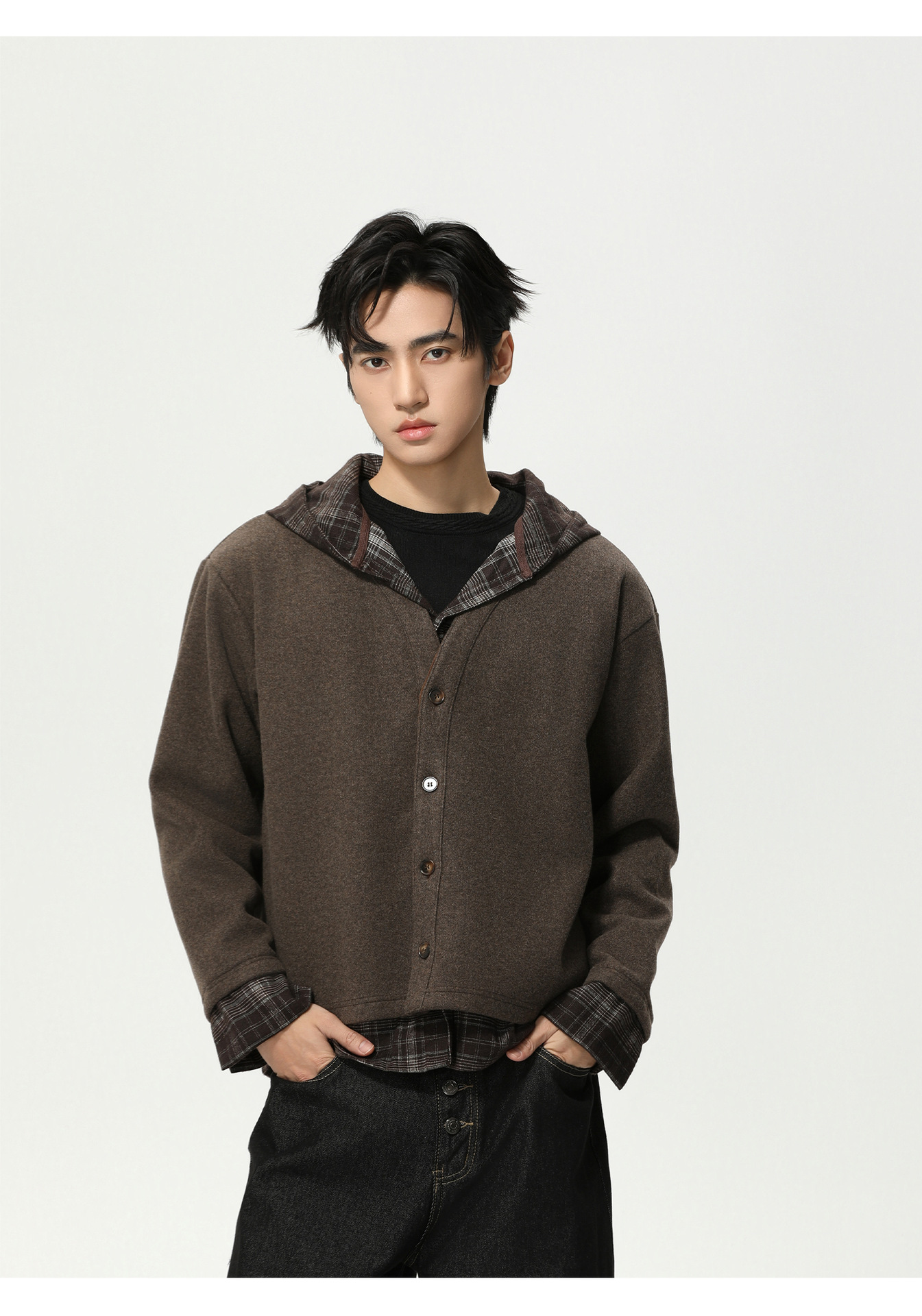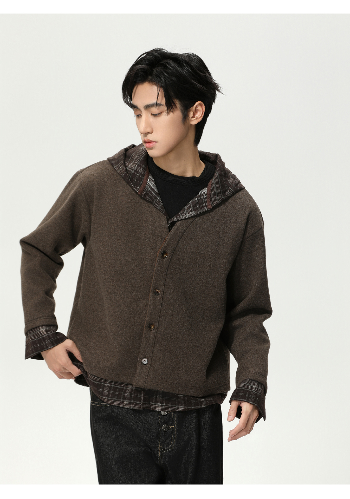 MTLCLOTHES Hombres| Plaid-splice falso de dos piezas con capuz cardigan con lana corto jersey suéter de moda