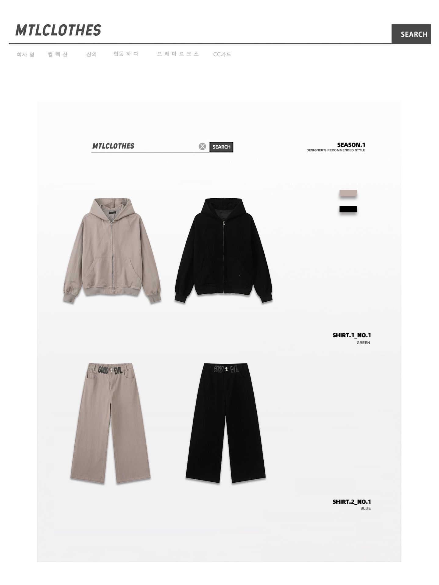 | Color | Top negro, pantalones negros, top gris, pantalones grises |