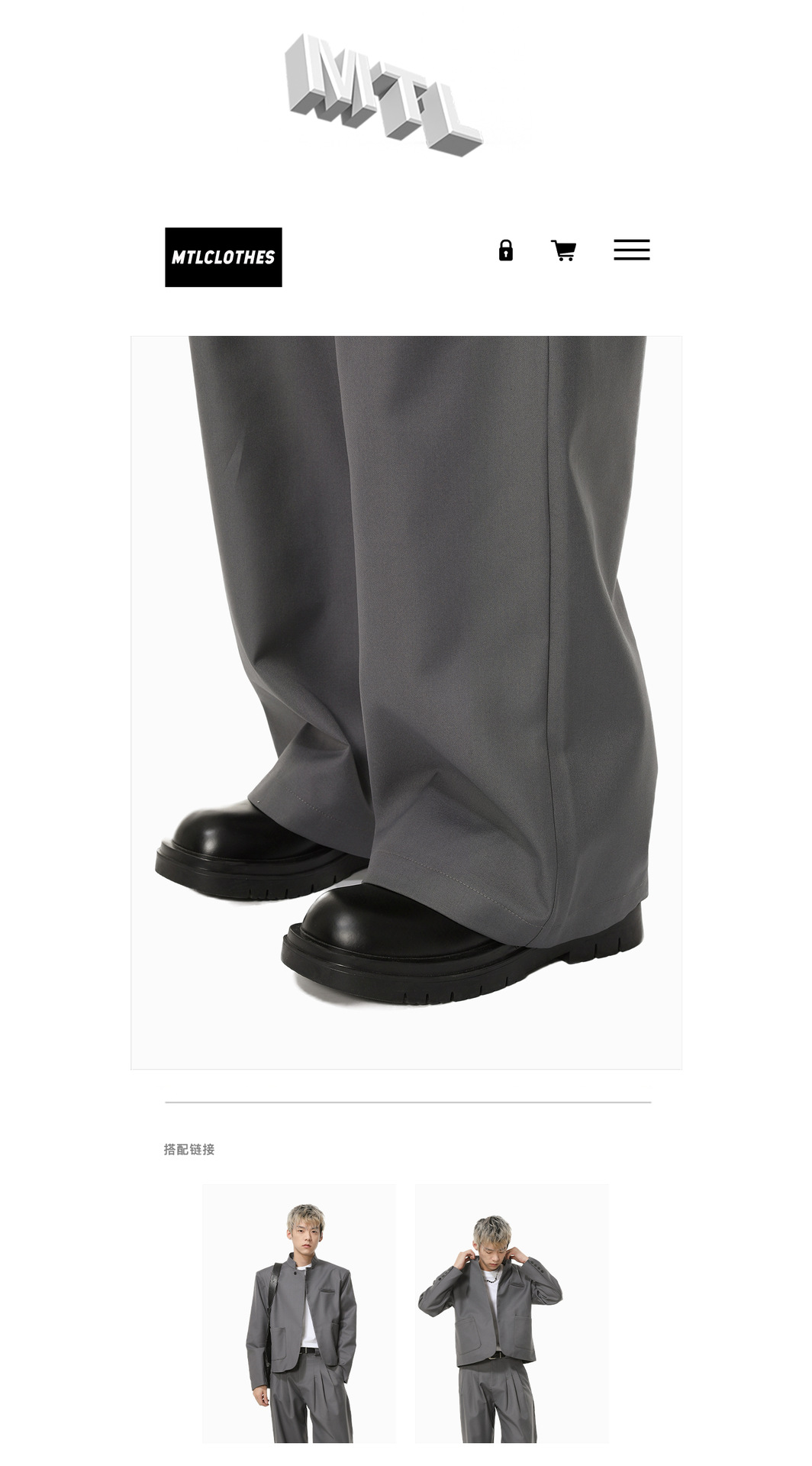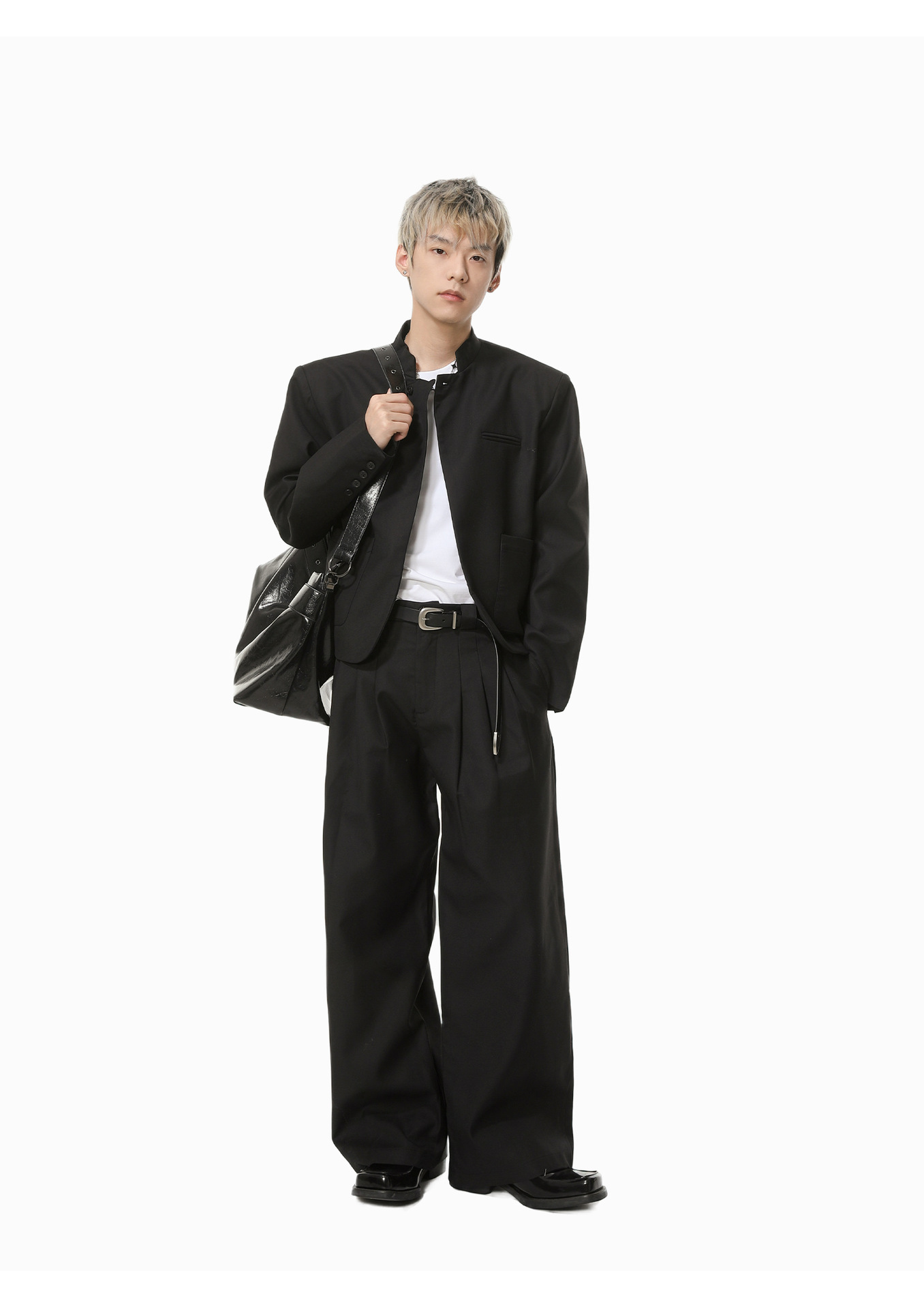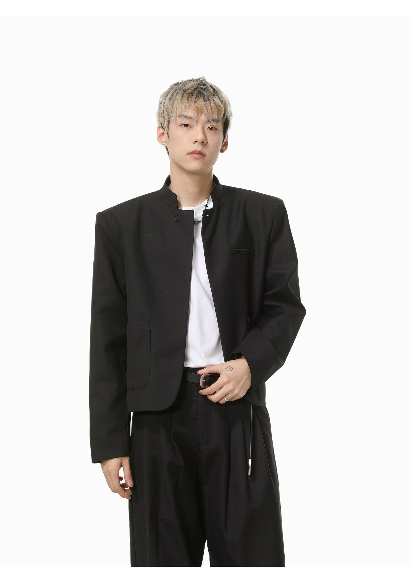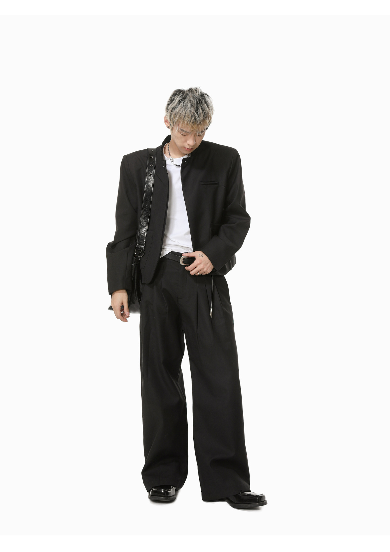MTLCLOTHES Hombres| Chino corto de hombro con chaqueta de botón único, pantalones largos con piernas anchas y colgantes, conjunto de textura casual