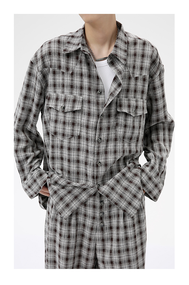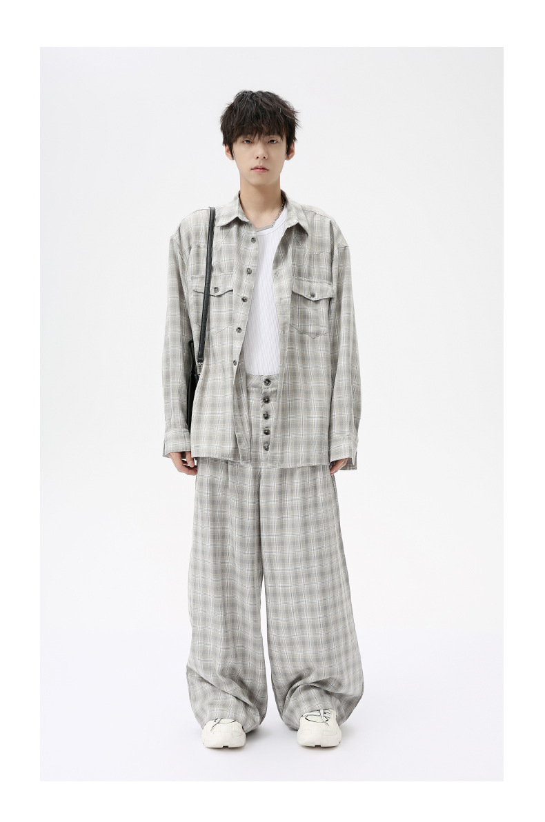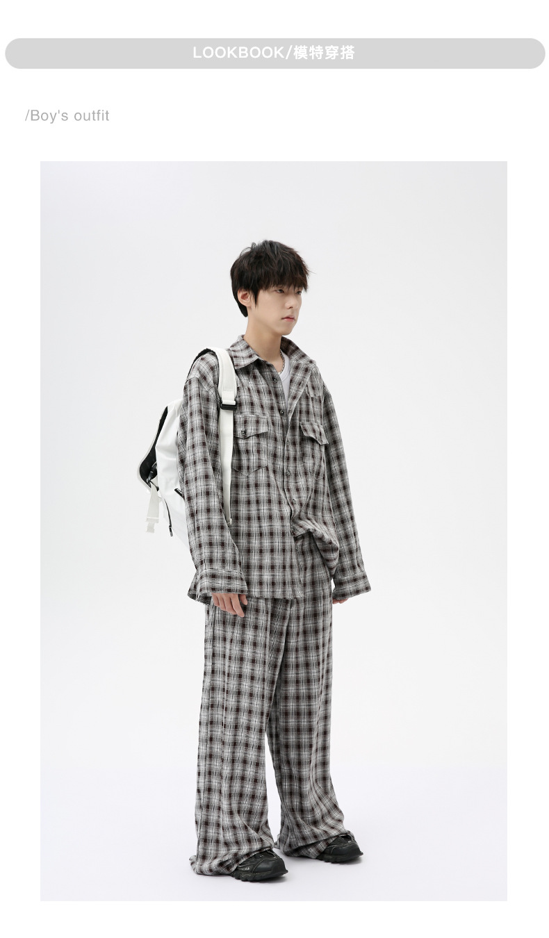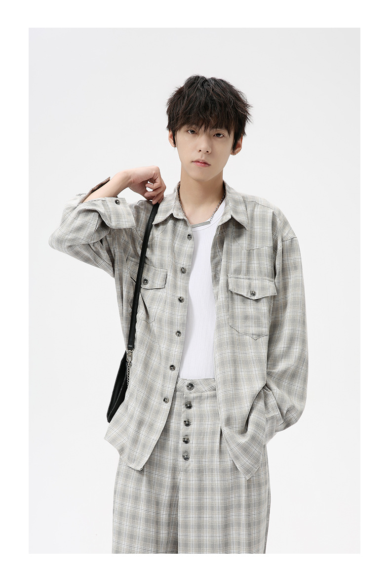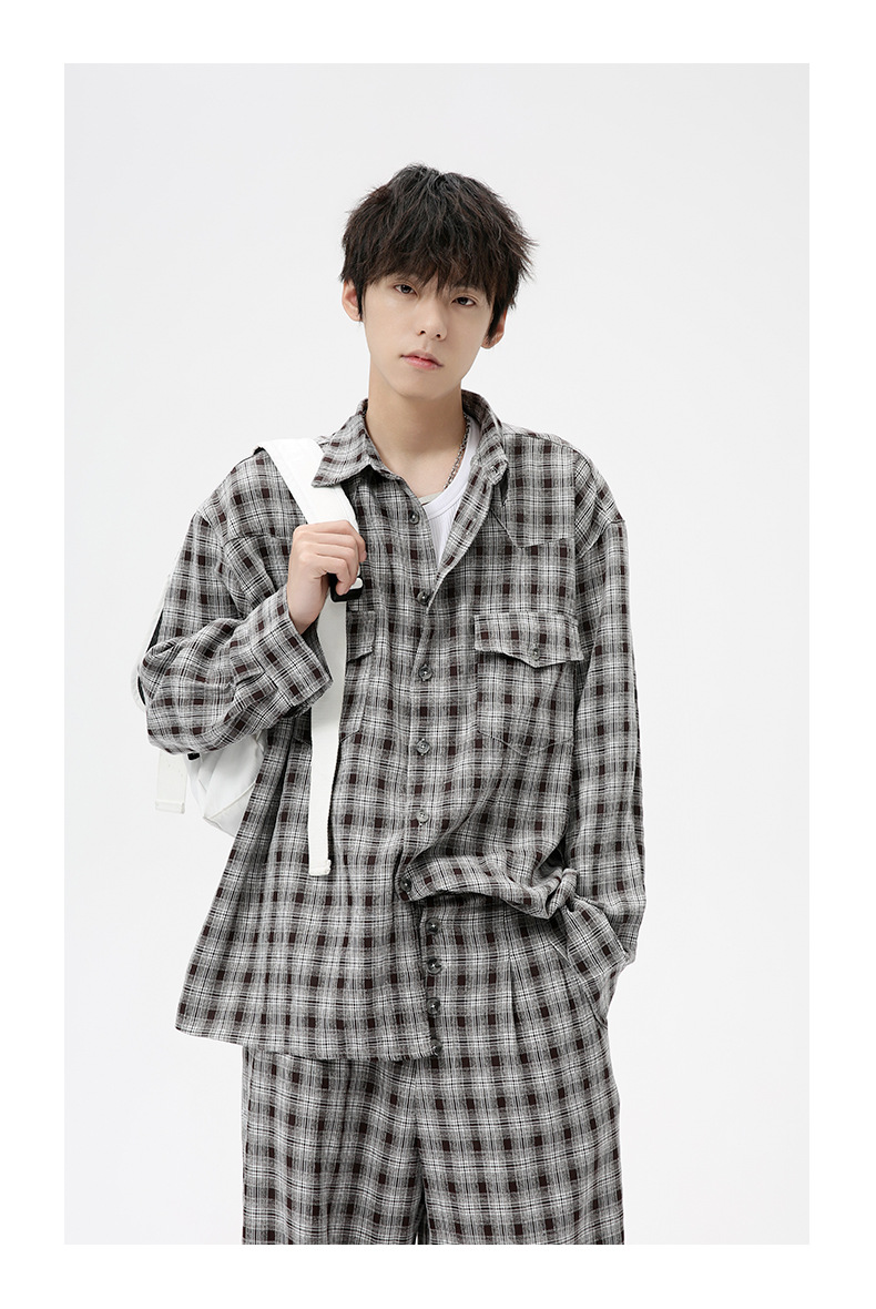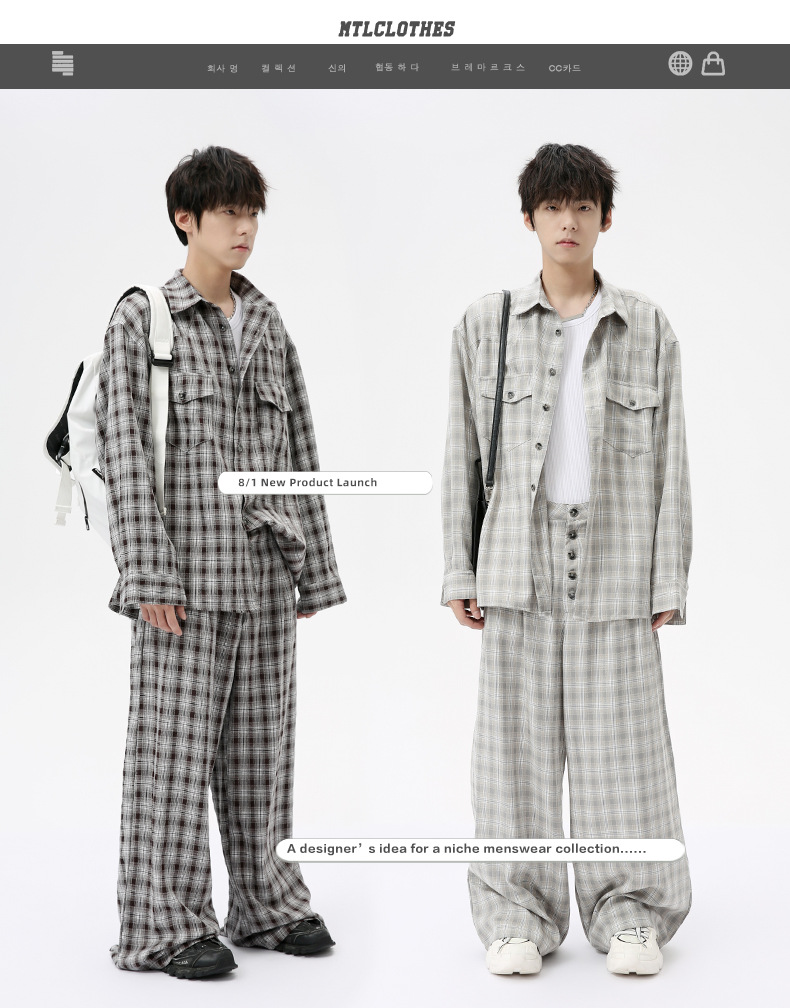 MTLCLOTHES Hombres| 2024 otoño nuevos productos coreanos retro cuello a cuadrícula camisa pantalones largos set casual
