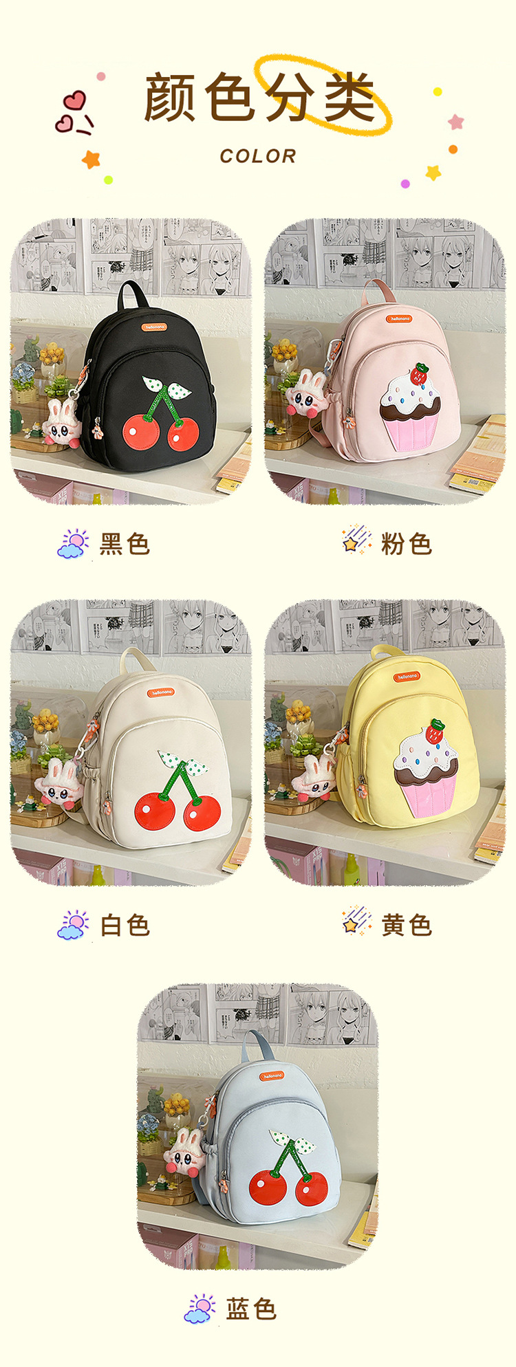 | Color | Colgante de peluche blanco, colgante de peluche rosa, colgante de peluche negro, colgante de peluche amarillo, colgante de peluche azul |
