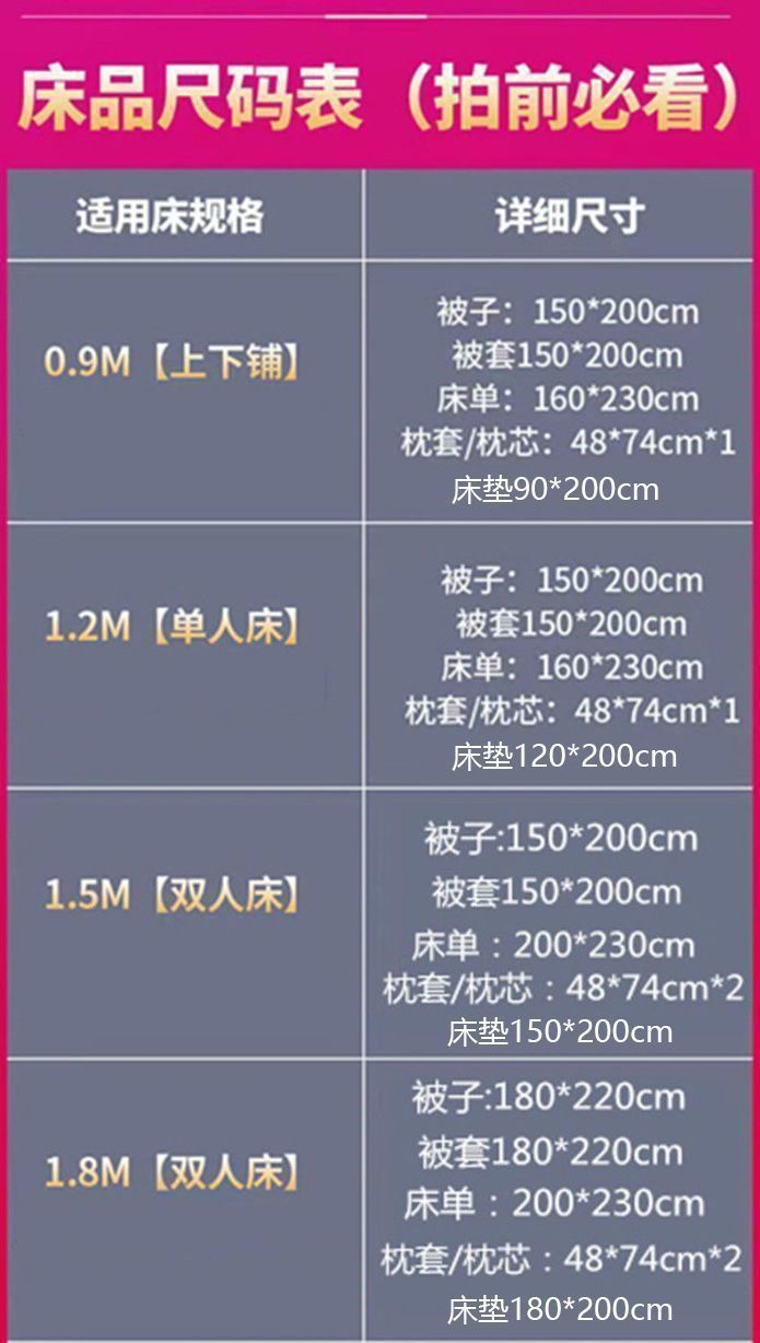 | Especificaciones de tamaño | 0.9 Un conjunto de seis piezas [núcleo de almohada + edredón de verano + 0,9 edredón de cama], un conjunto de 0,9 seis piezas [núcleo de almohada + edredón de tres jin + 0,9 edredón de cama], un conjunto de 0,9 seis piezas [núcleo de almohada + edredón de cuatro jin + 0,9 edredón de cama], un conjunto de 0,9 seis piezas [núcleo de almohada + edredón de cinco jin + 0,9 edredón de cama], un conjunto de 0,9 seis piezas [núcleo de almohada + edredón de seis jin + 0,9 edredón de cama], un conjunto de 1,2 seis piezas [núcleo de almohada + edredón de tres jin + 1,2 edredón de cama], un conjunto de 1,2 seis piezas [núcleo de almohada + edredón de cuatro jin + 1,2 edredón de cama, 1.2 conjunto de seis piezas [núcleo de almohada + edredón de cinco jin + 1.2 colchón de cama], 1.2 conjunto de seis piezas [núcleo de almohada + edredón de seis jin + 1.2 colchón de cama], 1.5 conjunto de ocho piezas [núcleo de almohada doble + edredón de tres jin + 1.5 colchón de cama], 1.5 conjunto de ocho piezas [núcleo de almohada doble + edredón de cuatro jin + 1.5 colchón de cama], 1.5 conjunto de ocho piezas [núcleo de almohada doble + edredón de cinco jin + 1.5 colchón de cama], 1.5 conjunto de ocho piezas [núcleo de almohada doble + edredón de seis jin + 1.5 colchón de cama, 1.8 conjunto de ocho piezas [núcleo de almohada doble + edredón de cuatro libras + 1.8 colcha de cama], 1.8 conjunto de ocho piezas [núcleo de almohada doble + edredón de seis libras + 1.8 colcha de cama] |