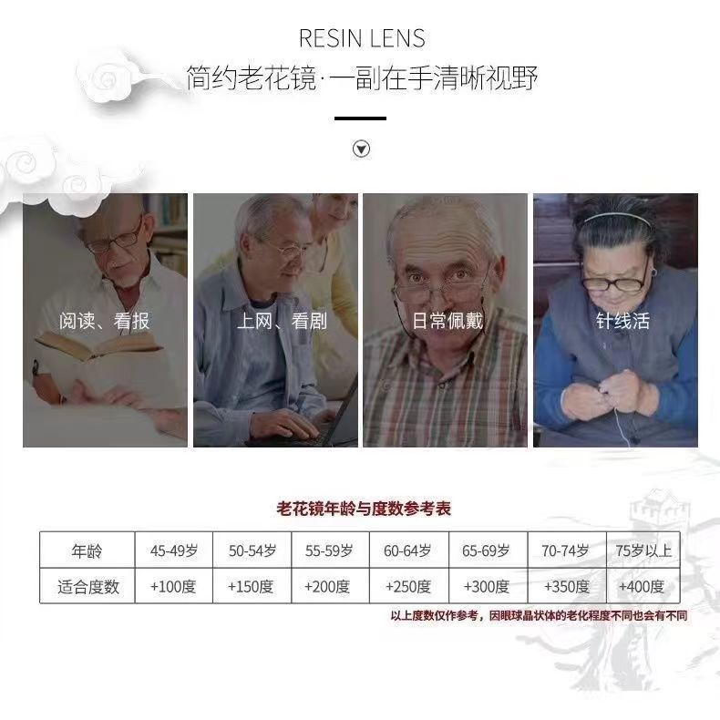 | Grado | Etiqueta de zoom [grados + 200], 100 grados de la vieja flor (adecuado para menos de 50 años), 150 grados de la vieja flor (adecuado para 50 - 54 años), 200 grados de la vieja flor (adecuado para 55 - 59 años), 250 grados de la vieja flor (adecuado para 60 - 64 años), 300 grados de la vieja flor (adecuado para 65 - 69 años), 350 grados de la vieja flor (adecuado para 70 - 74 años), 400 grados de la vieja flor (adecuado para más de 75 años) |