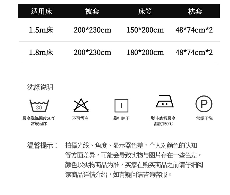 | Especificaciones de tamaño | Cama de dormitorio de 0,9 m [conjunto de sábanas de tres piezas] es adecuado para edredones de 150 × 200 cm, cama de 1,2 m [conjunto de sábanas de tres piezas] es adecuado para edredones de 150 × 200 cm, cama de 1,5 m [conjunto de sábanas de cuatro piezas] es adecuado para edredones de 200 × 230 cm, cama de 1,8 m [conjunto de sábanas de cuatro piezas] es adecuado para edredones de 200 × 230 cm, cama de 2.0 m [conjunto de sábanas de cuatro piezas] es adecuado para edredones de 220 × 240 cm, cama de 1,5 m [conjunto de cuatro piezas] es adecuado para edredones de 200 × 230 cm,[Jet de cuatro piezas de cama de 1.8m] adecuado para edredón de 200 × 230 cm |