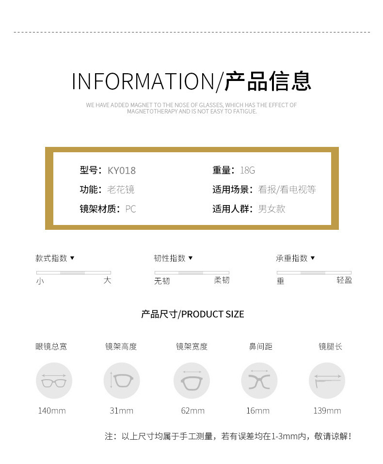 | Grado | + 100 grados (anti - luz azul), + 150 grados (anti - luz azul), + 200 grados (anti - luz azul), + 250 grados (anti - luz azul), + 300 grados (anti - luz azul), + 350 grados (anti - luz azul), + 400 grados (anti - luz azul) |