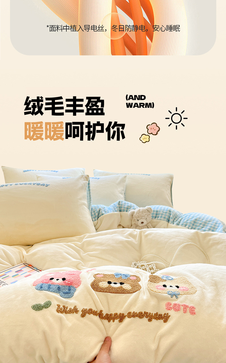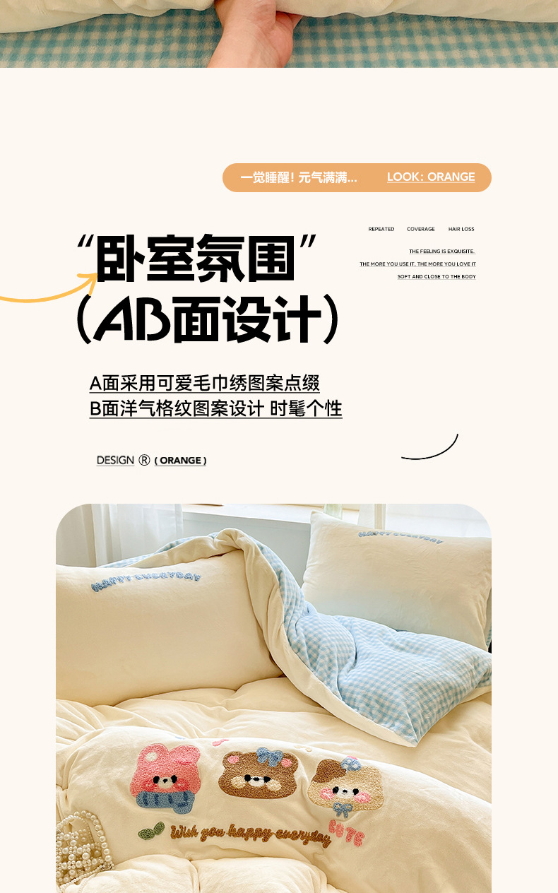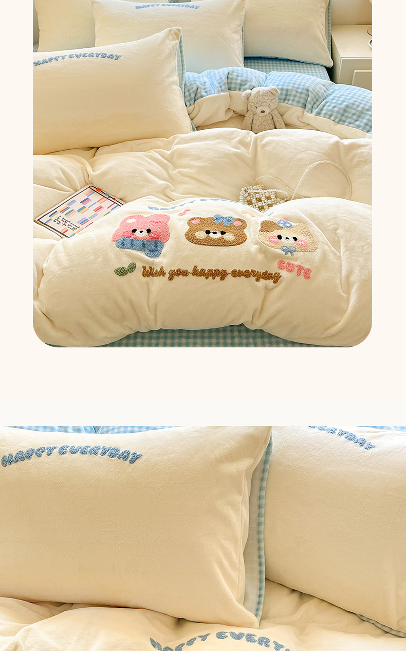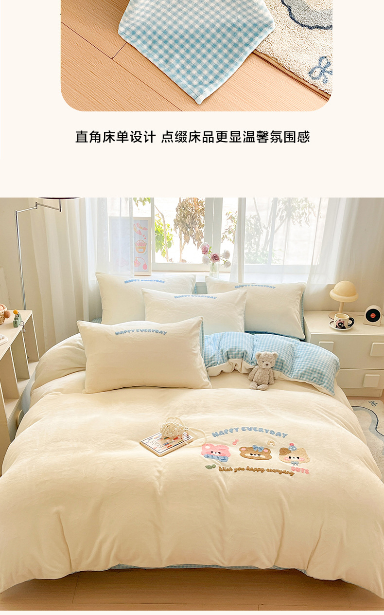 Cama de dibujos animados de lana de leche con cuatro piezas, sábanas de lana de coral gruesas, cubierta de cama de invierno y otoño, ropa de cama de cama de tres piezas