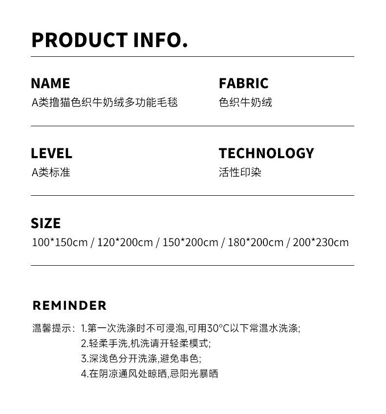 | Especificaciones de tamaño | 100x150cm mantas para niños [alrededor de 1.4 kg], 120x200cm mantas individuales [alrededor de 2 kg], 150x200cm mantas individuales más grandes [alrededor de 2.4 kg], 180x200cm mantas dobles [alrededor de 2.8 kg], 200x230cm mantas dobles más grandes [alrededor de 3.4 kg] |
