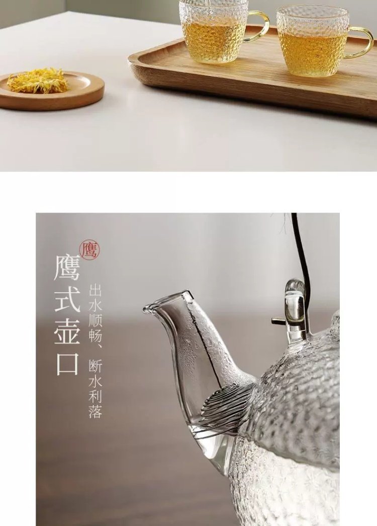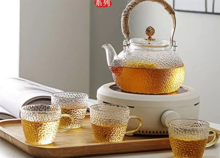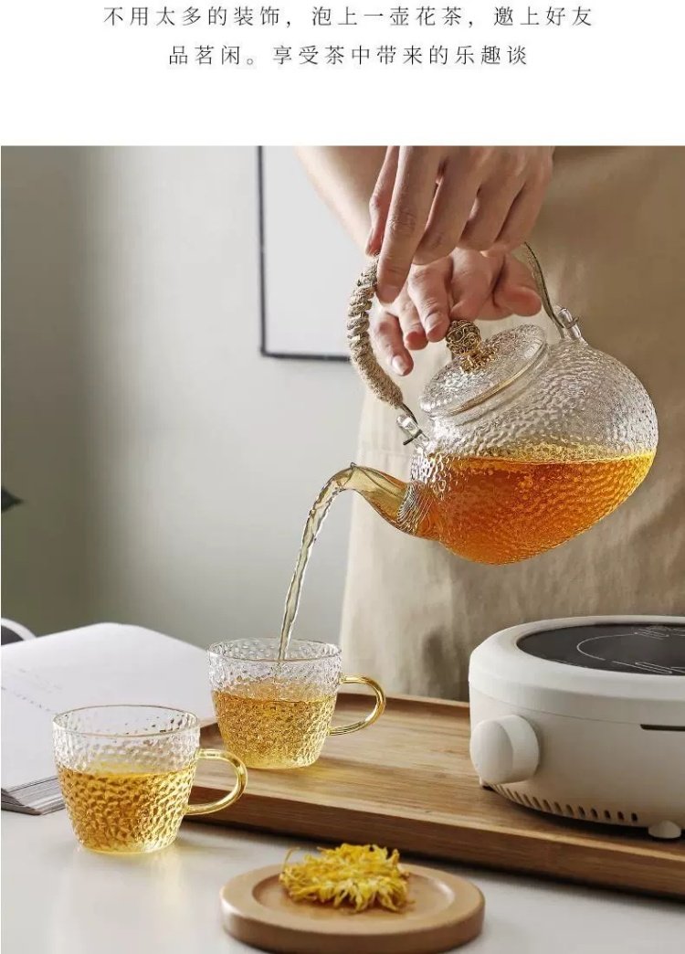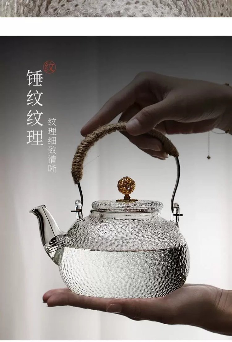 Venta directa de fábrica Tetera de vidrio con alto contenido de borosilicato Tetera de espuma con patrón de martillo de viga de elevación de metal Tetera de vidrio de alta calidad para el hogar