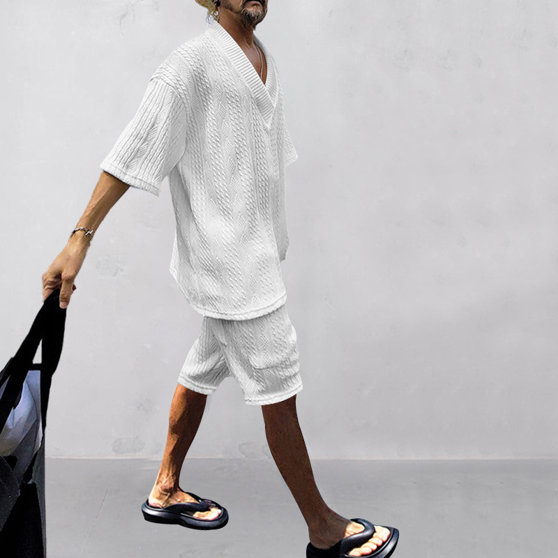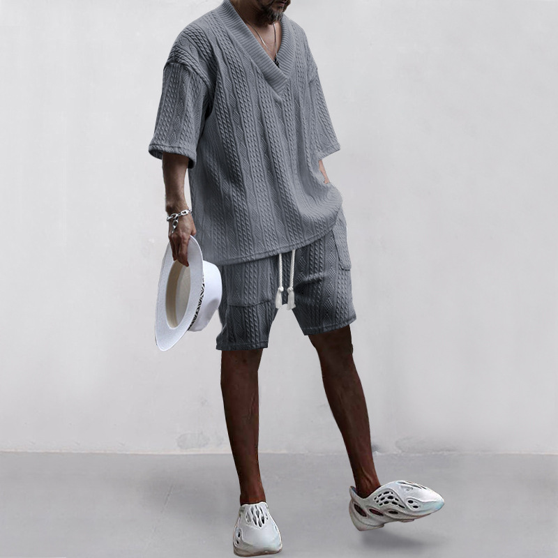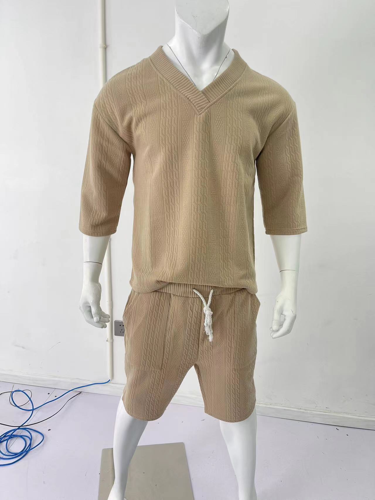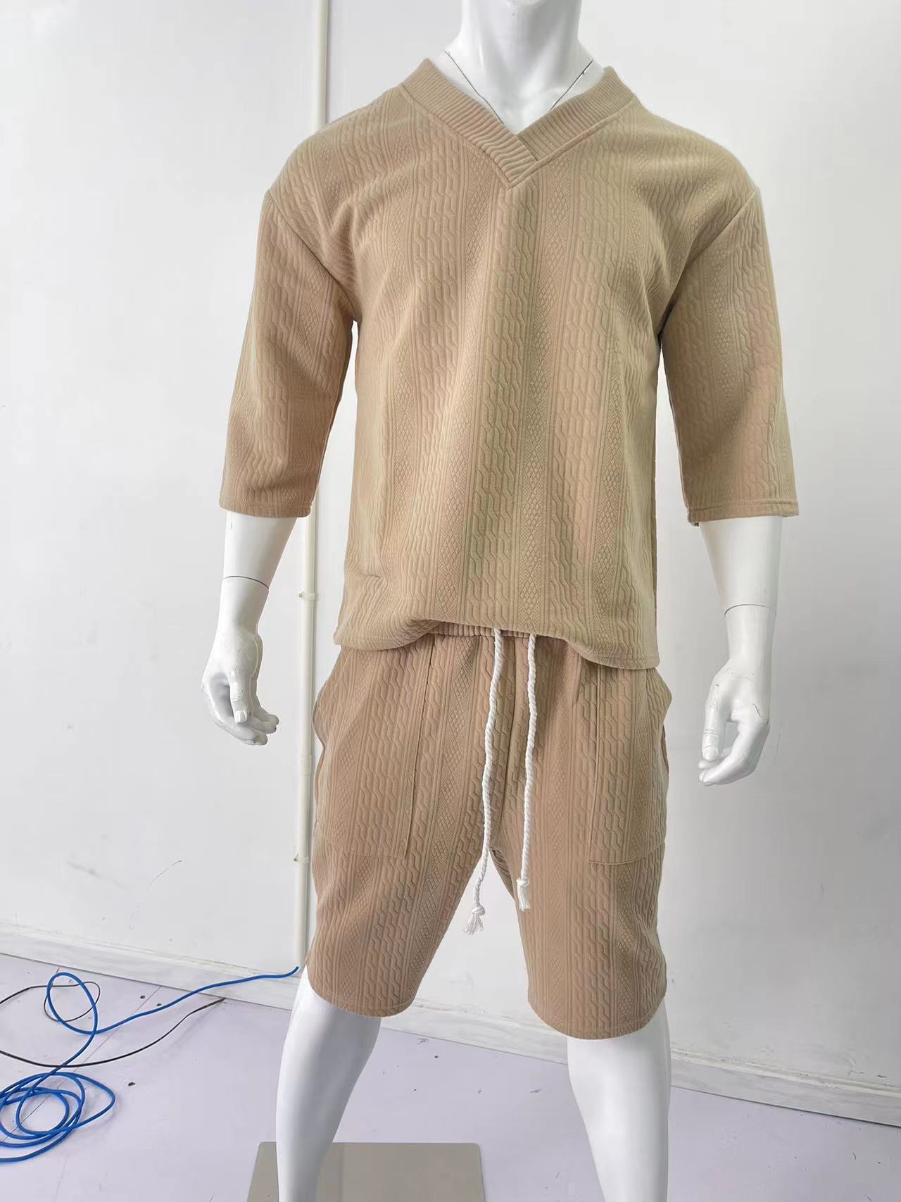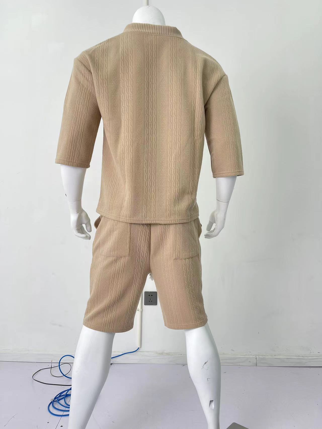 TEMU transfronterizo al por mayor nuevo estilo casual europeo y americano suelto suéter jacquard de manga tres cuartos top shorts traje de hombre