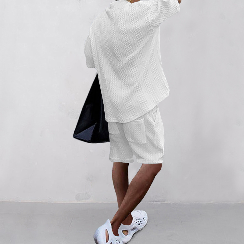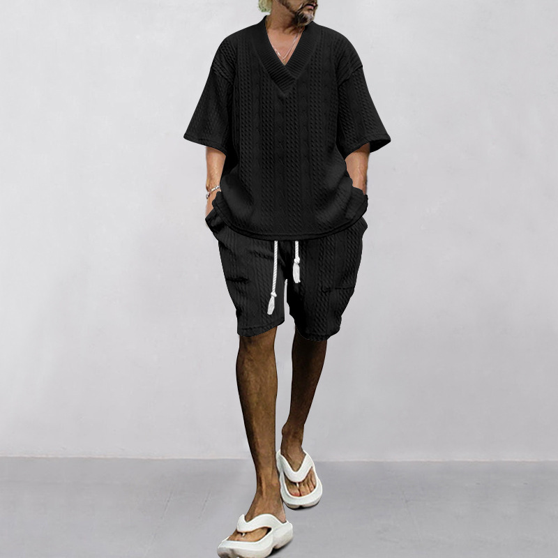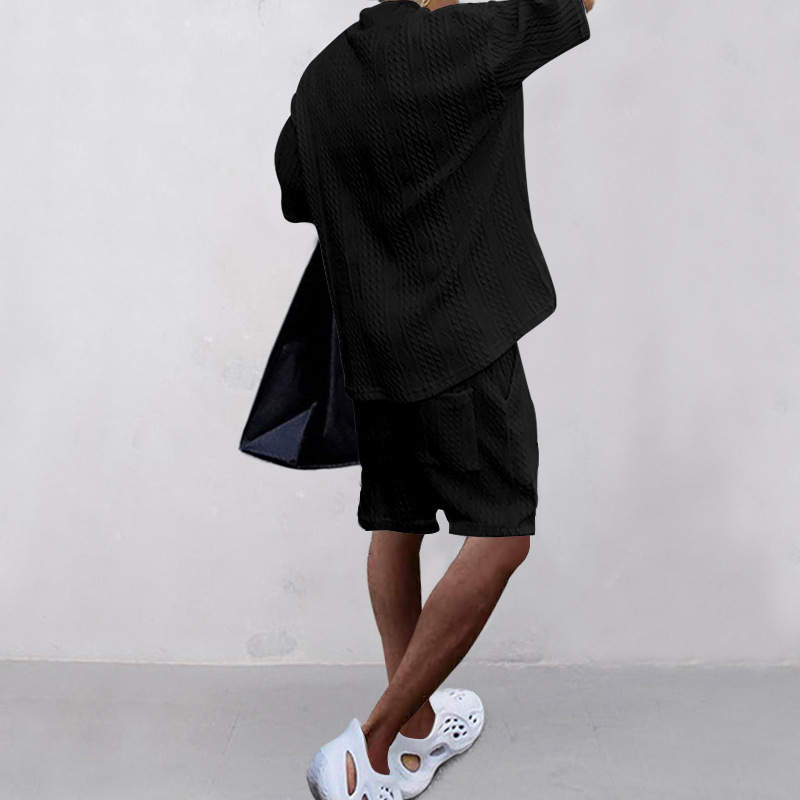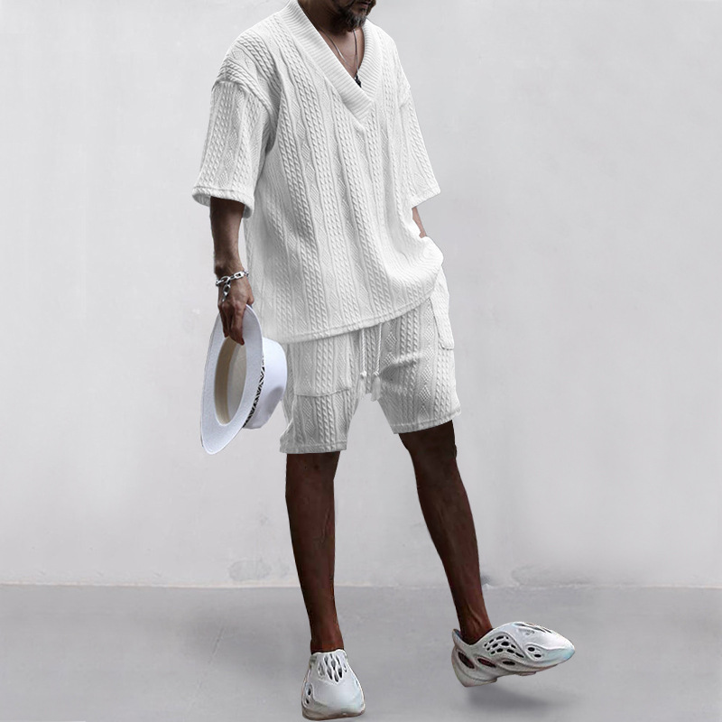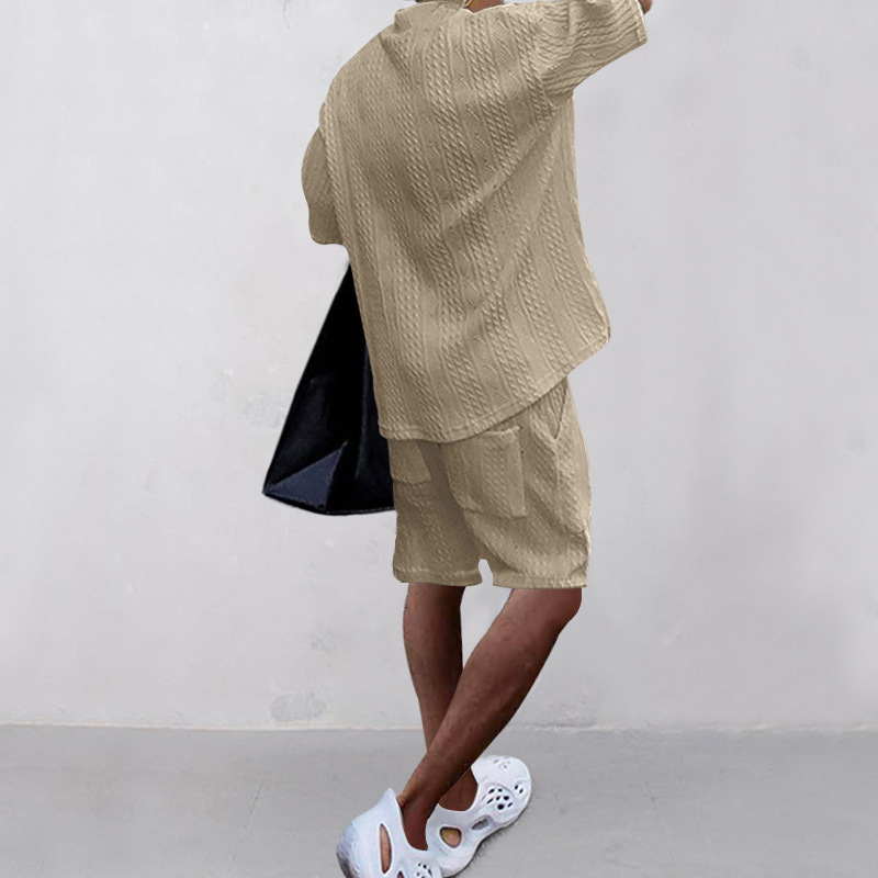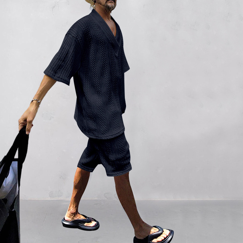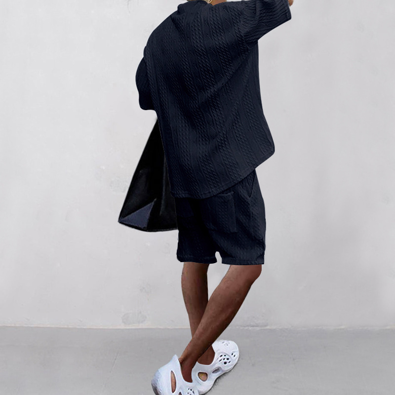 TEMU transfronterizo al por mayor nuevo estilo casual europeo y americano suelto suéter jacquard de manga tres cuartos top shorts traje de hombre