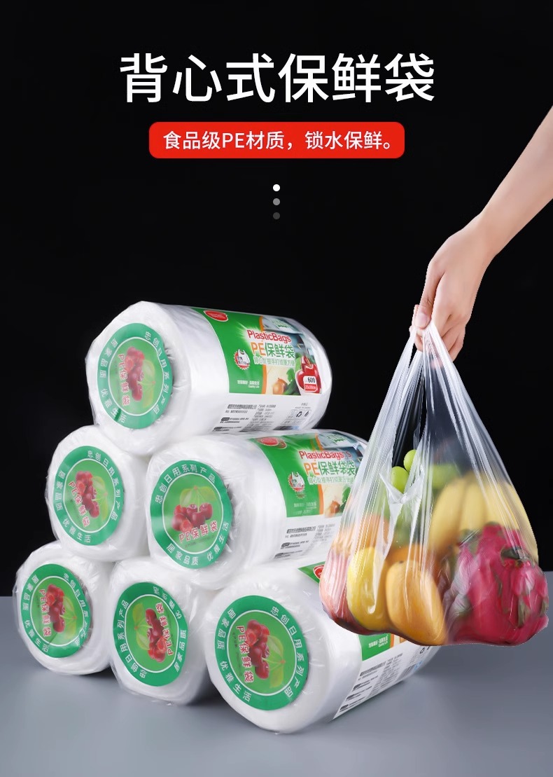 Bolsa de preservación gruesa, bolsa de plástico doméstica de grado alimenticio, bolsa de cocina desechable tipo chaleco, bolsa de alimentos
