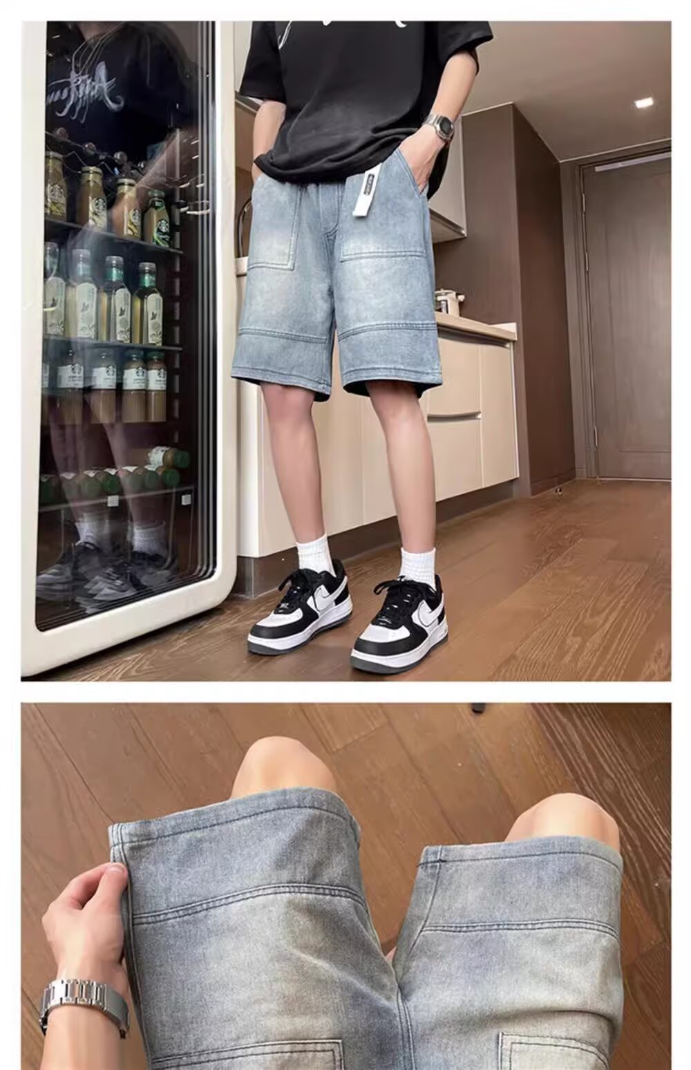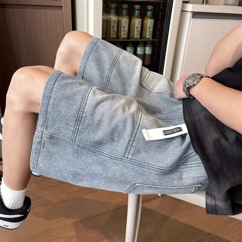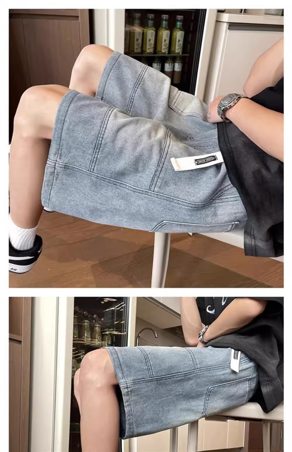 Vintage jeans japoneses, pantalones cortos de verano masculinos, empalme rectas sueltas, antiguo, marca de moda, pantalones casuales de cinco puntos