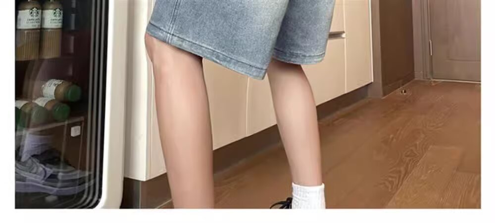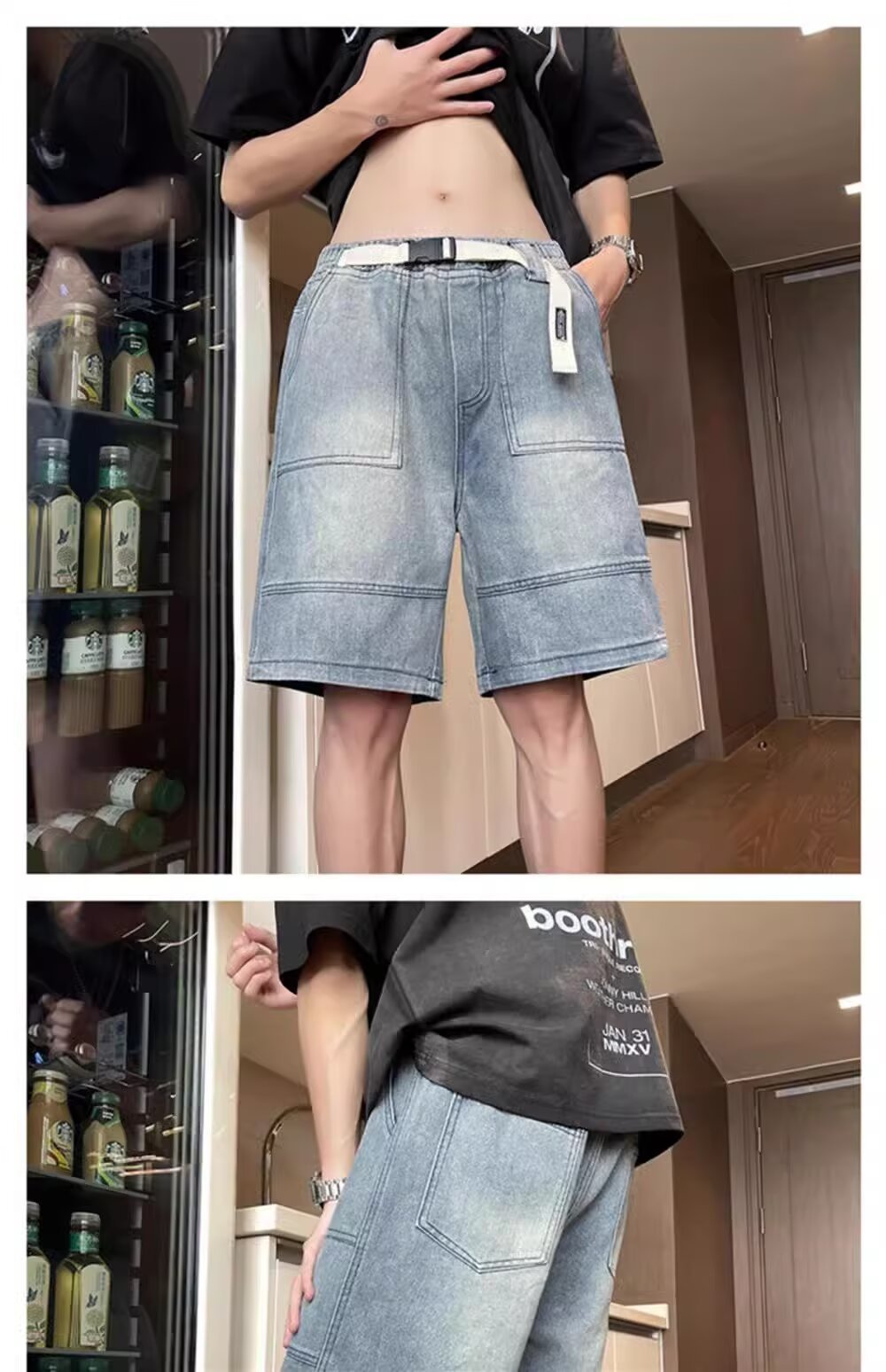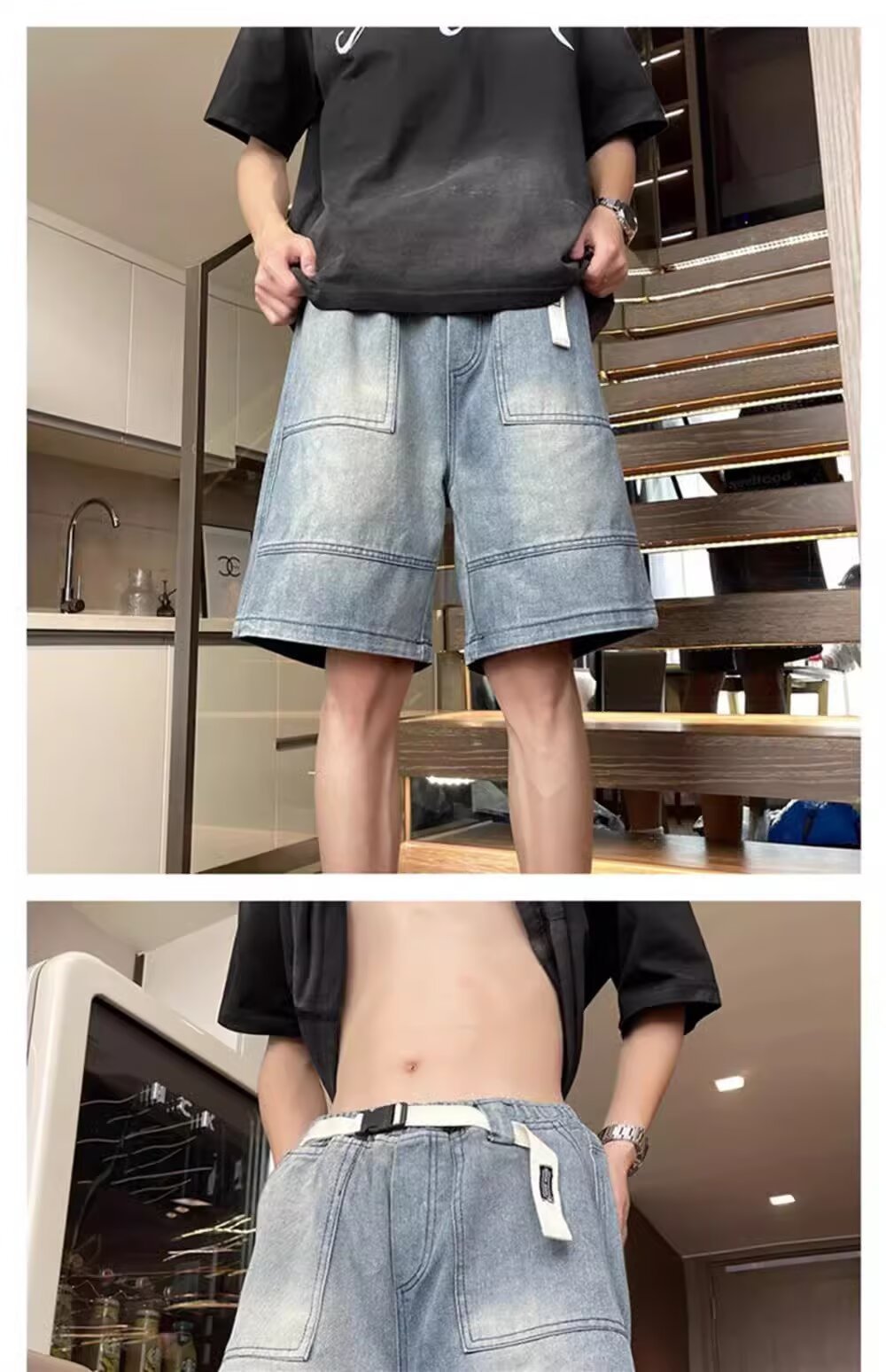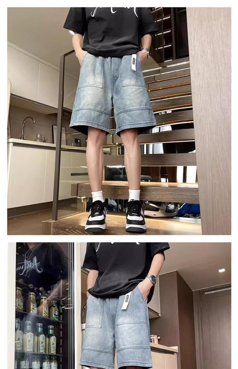 Vintage jeans japoneses, pantalones cortos de verano masculinos, empalme rectas sueltas, antiguo, marca de moda, pantalones casuales de cinco puntos