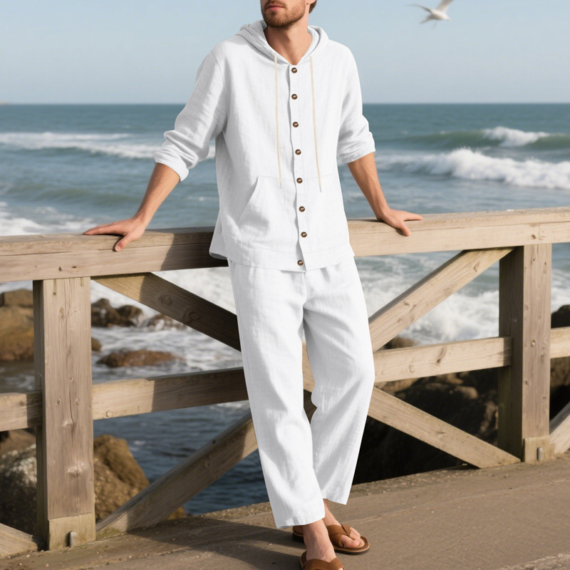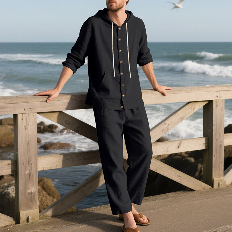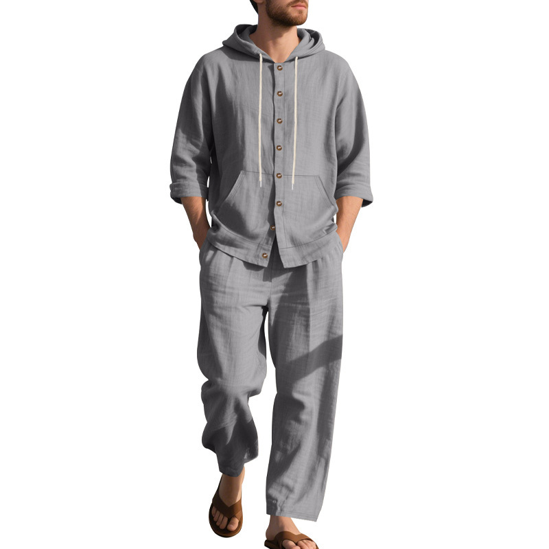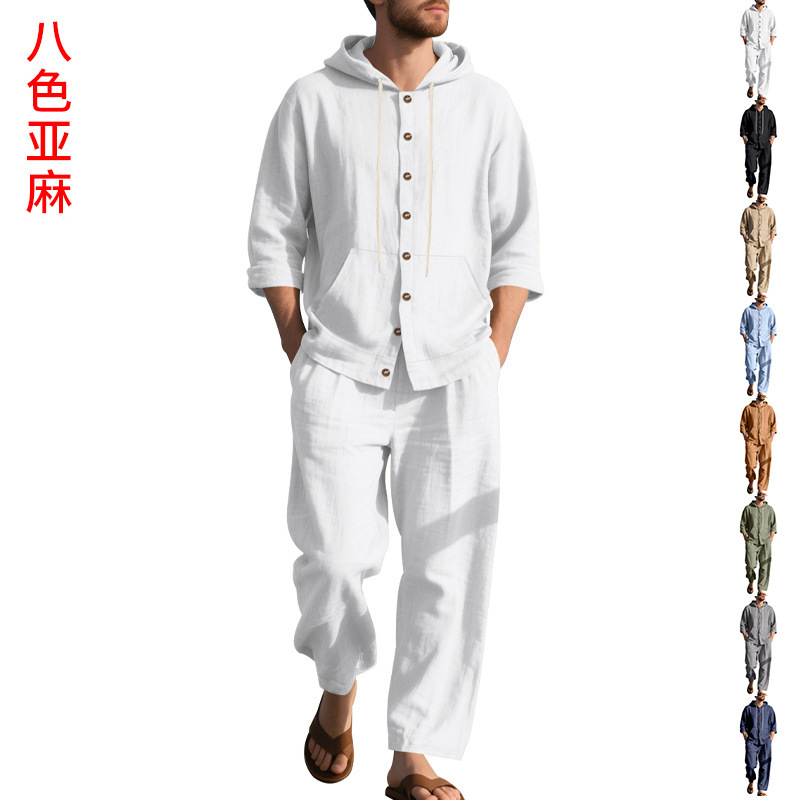 Transfronterizo Amazon Primavera y otoño Camisa con capucha de manga larga de lino suelto americano Pantalones sueltos Traje casual de playa