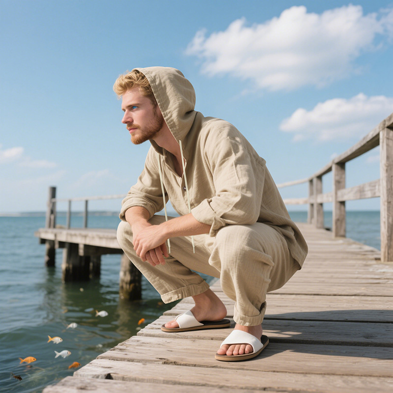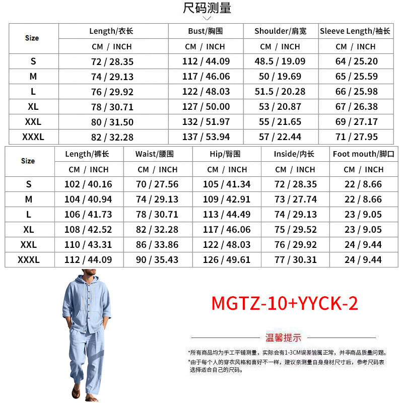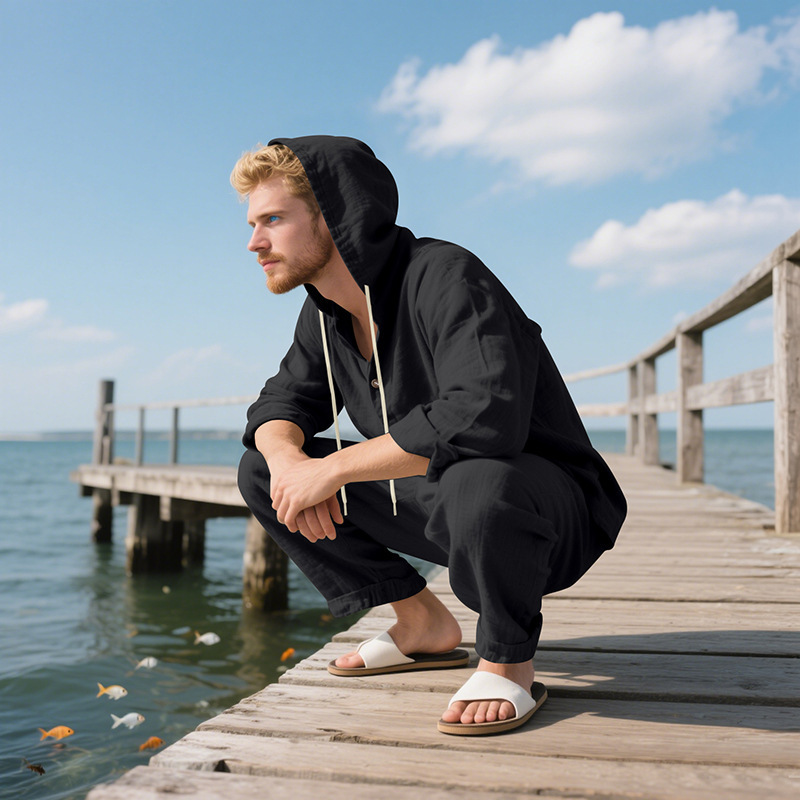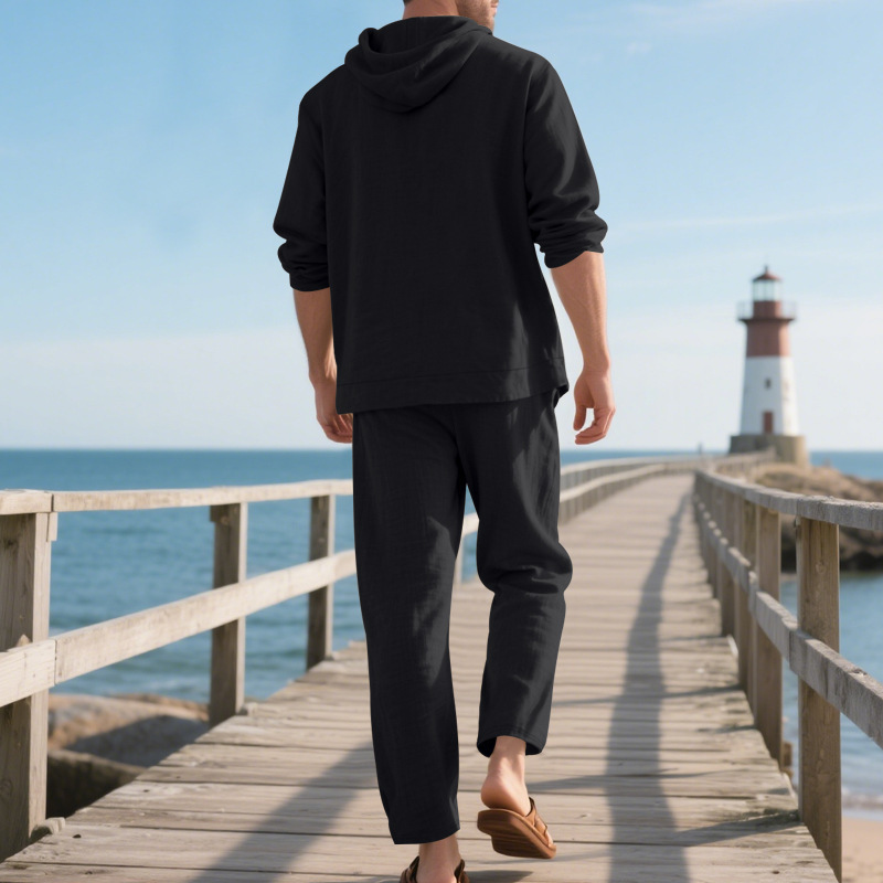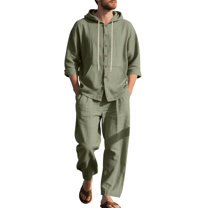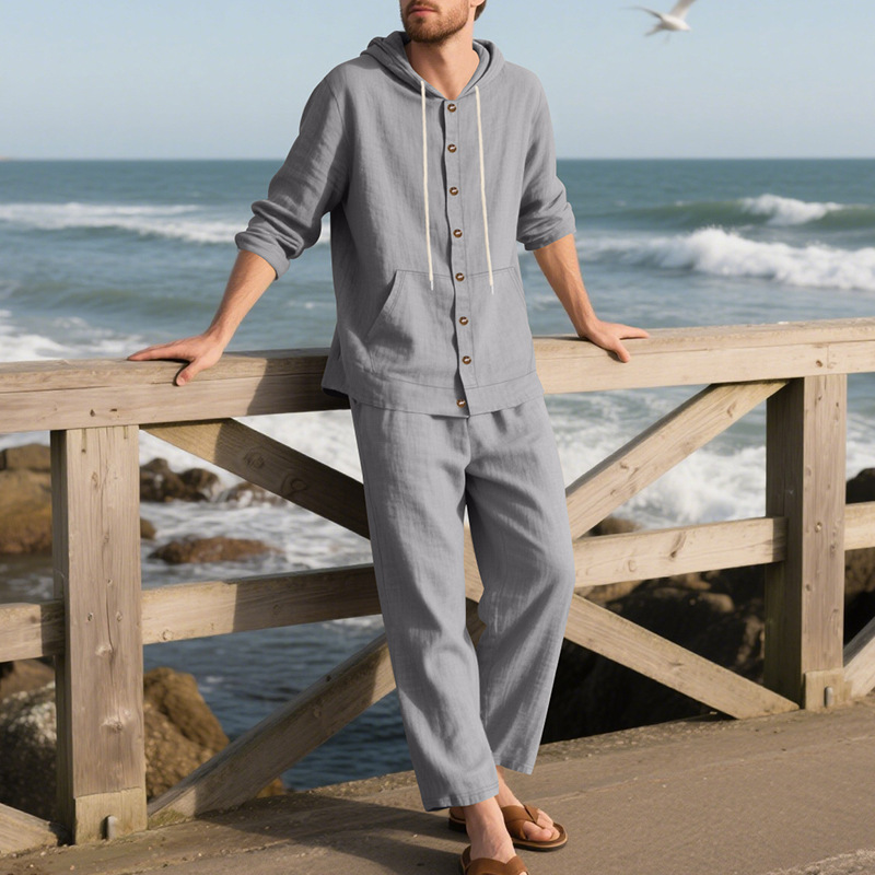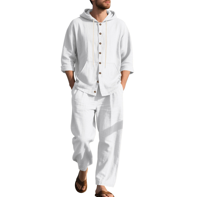 Transfronterizo Amazon Primavera y otoño Camisa con capucha de manga larga de lino suelto americano Pantalones sueltos Traje casual de playa