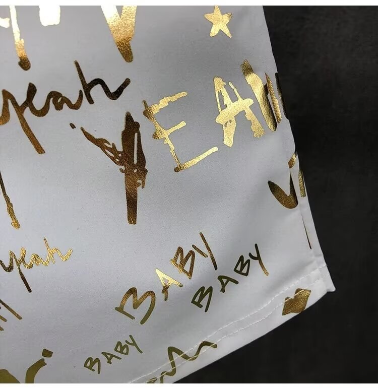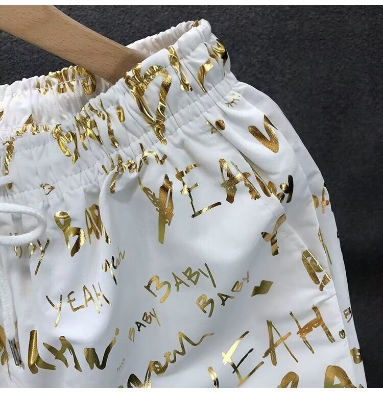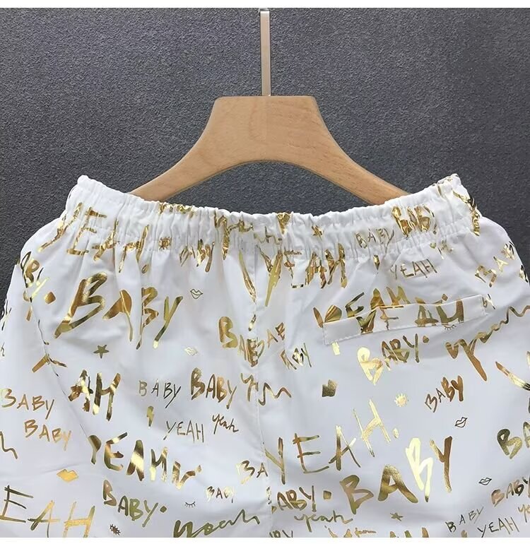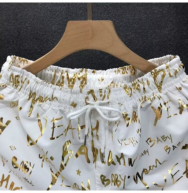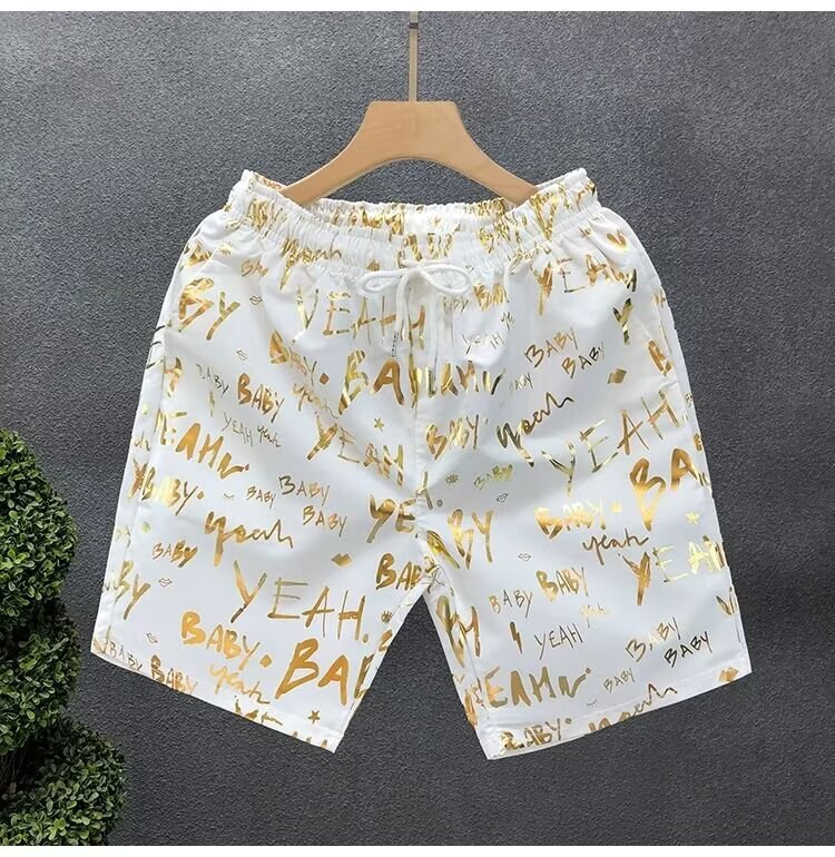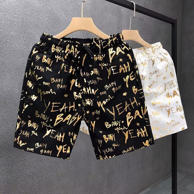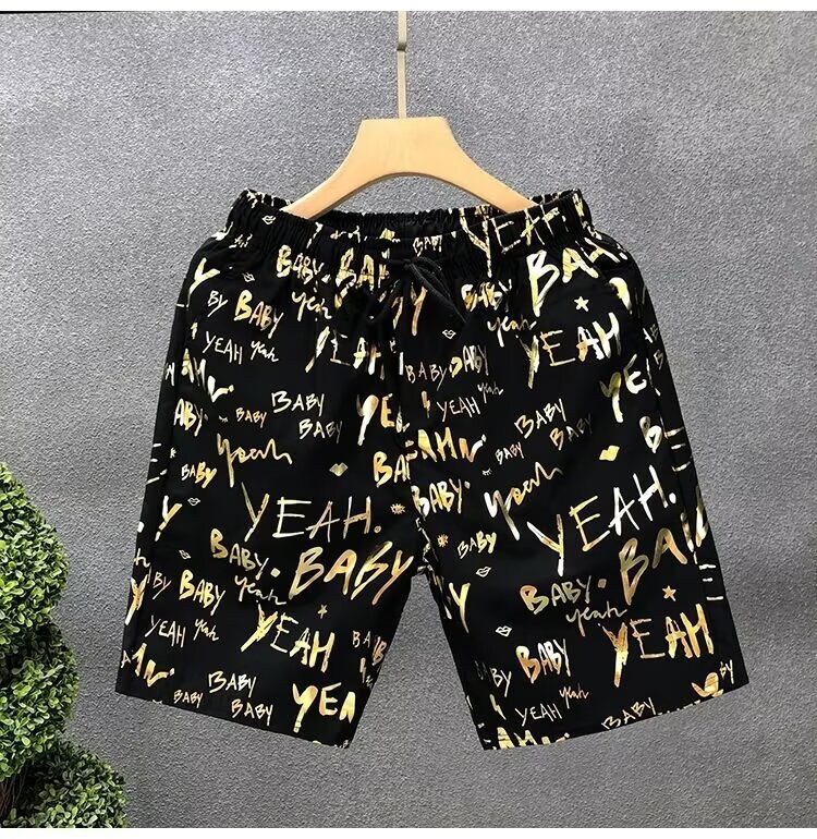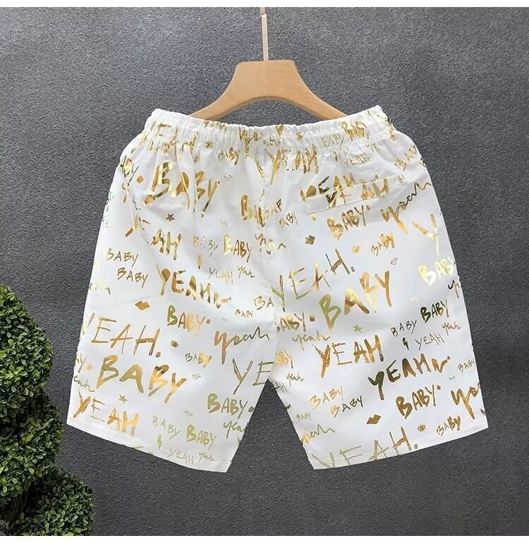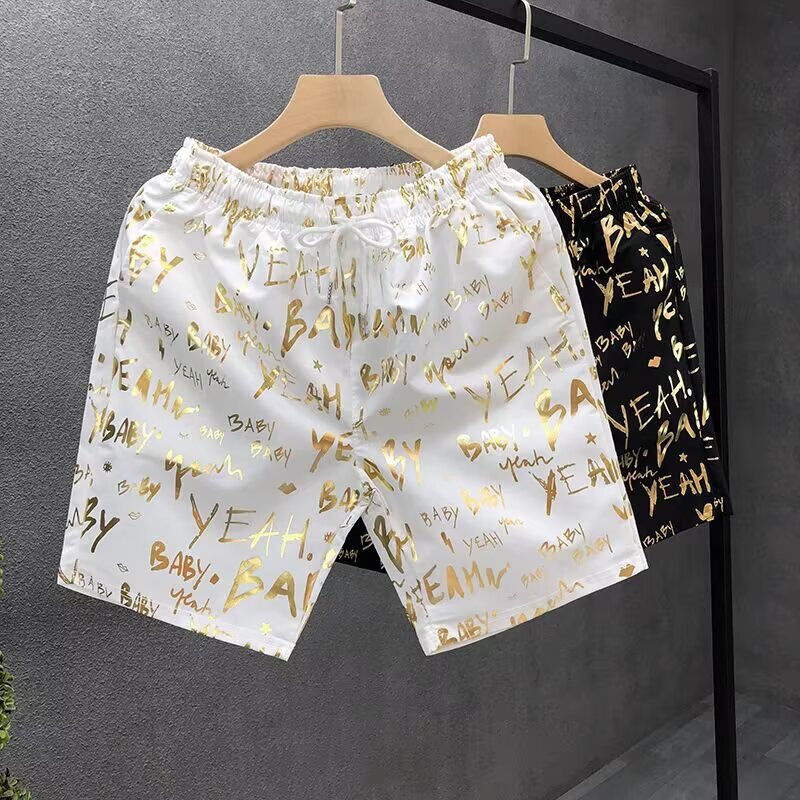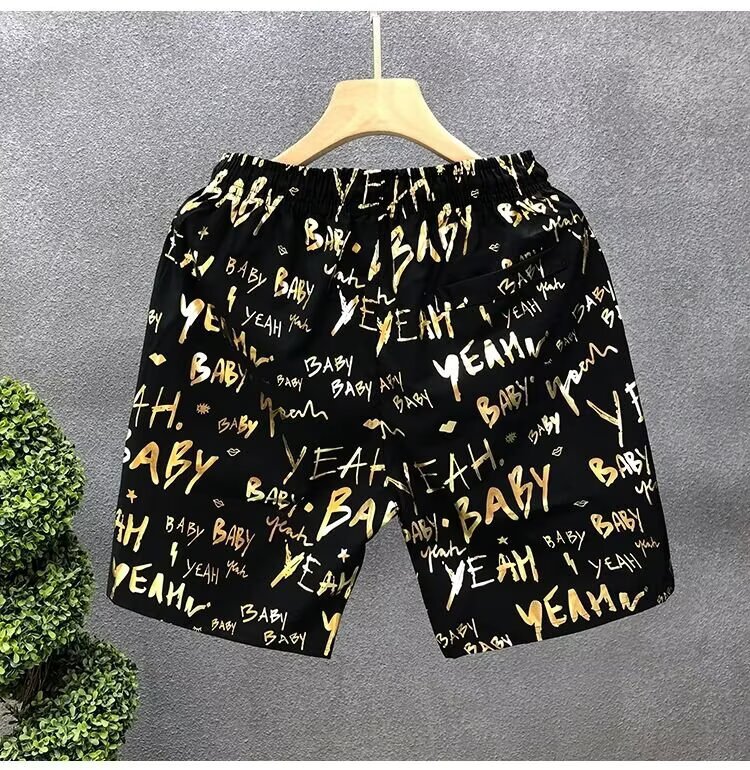 Pantalones cortos de impresión dorada populares para hombres de verano delgados pantalones de cinco puntos para hombres fuera de casa para usar pantalones de playa pantalones de pantalones de pantalones de gran tamaño