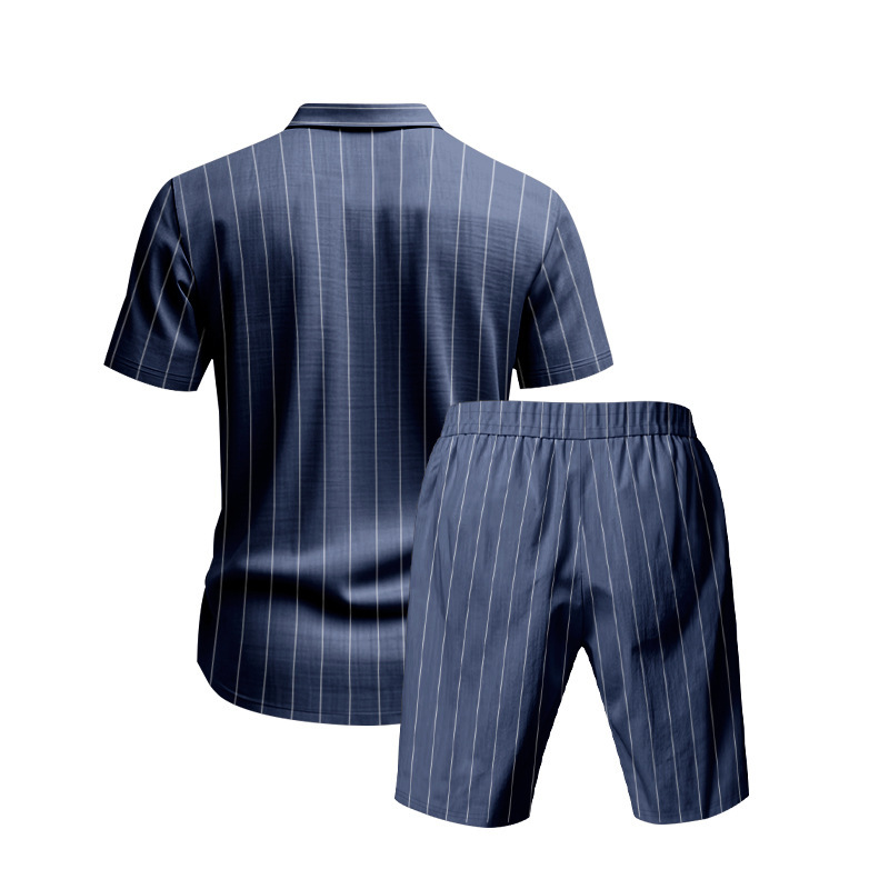 Traje de lino de verano de Amazon transfronterizo Camisa de manga corta suelta jacquard a rayas para hombre Pantalones cortos de playa de dos piezas