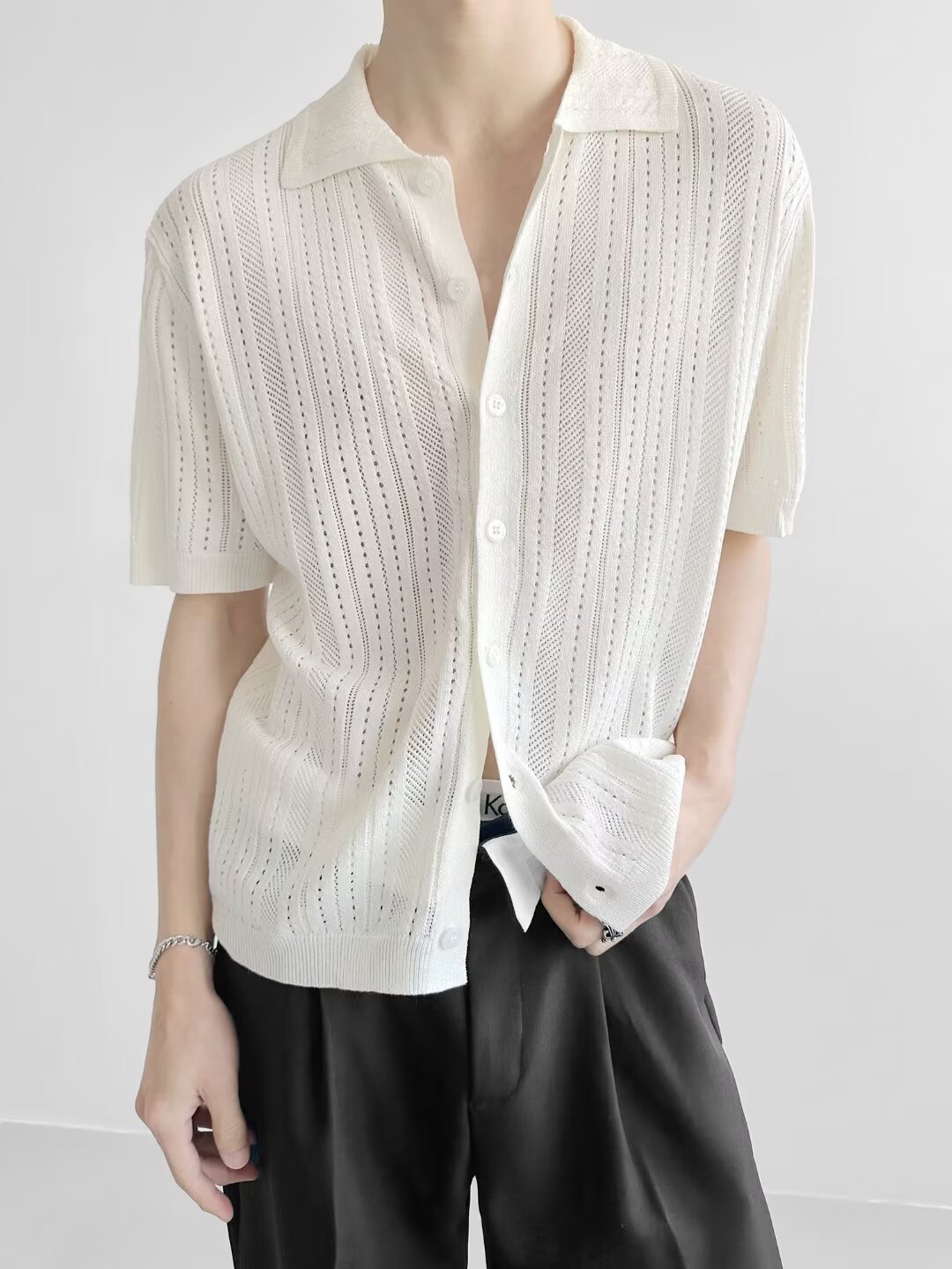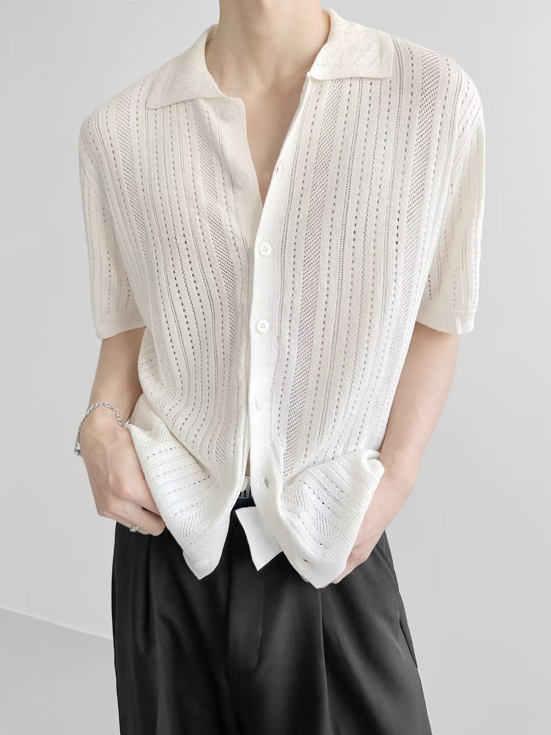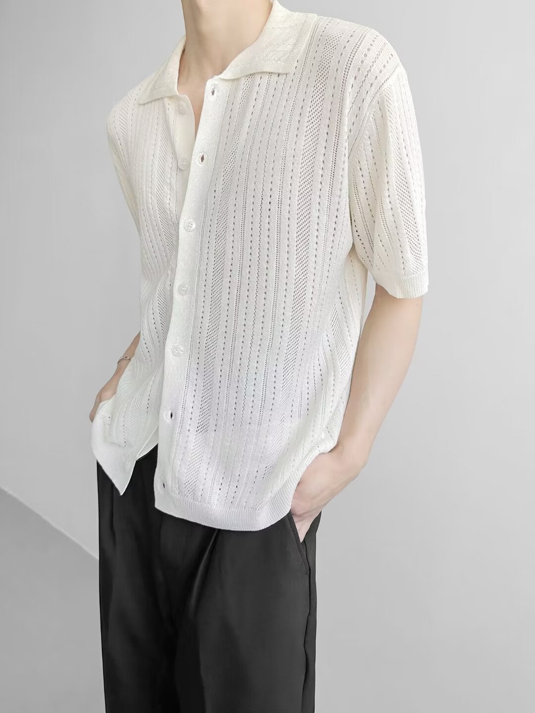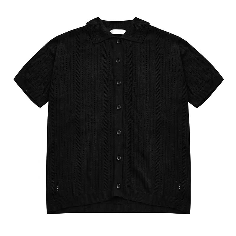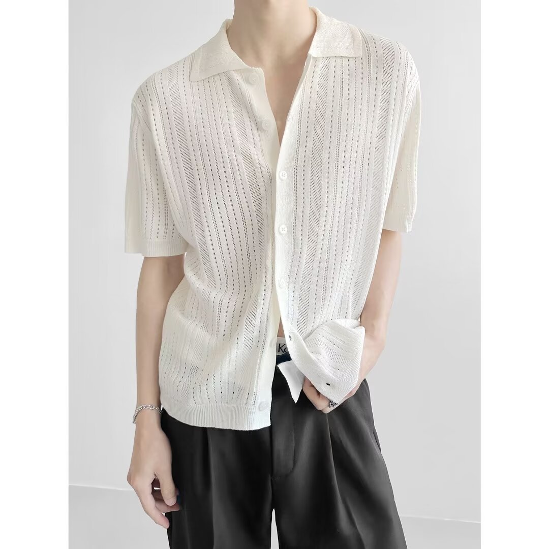 Coreano con solapa hueca de manga corta abstinencia masculina camisa de punto de moda camisa de encaje cardigan camiseta de verano