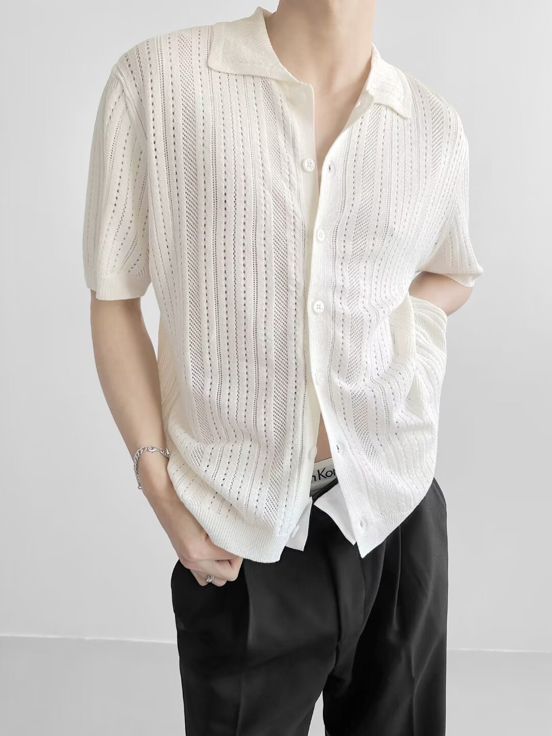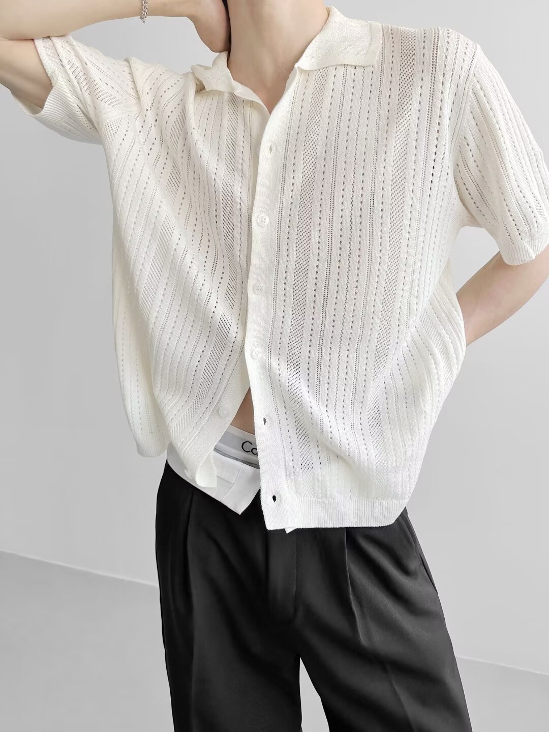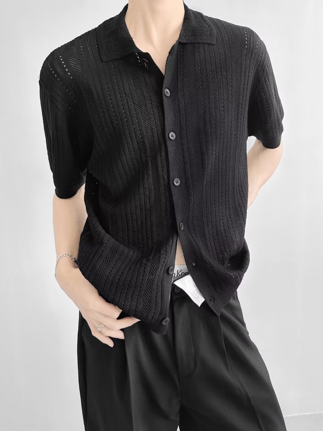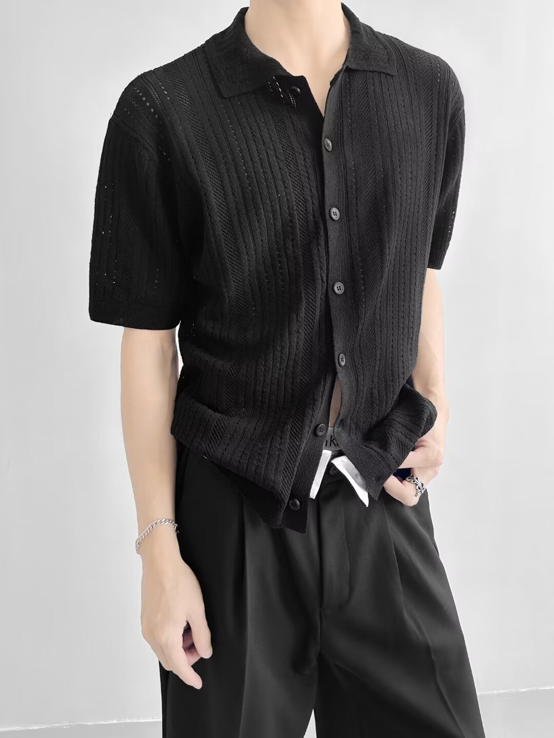 Coreano con solapa hueca de manga corta abstinencia masculina camisa de punto de moda camisa de encaje cardigan camiseta de verano