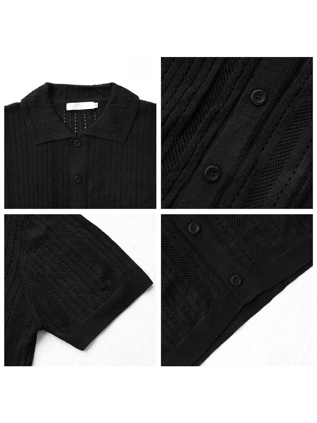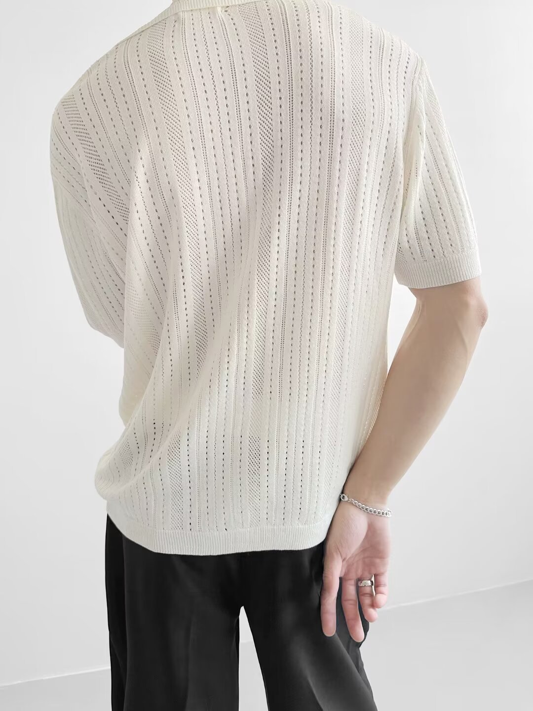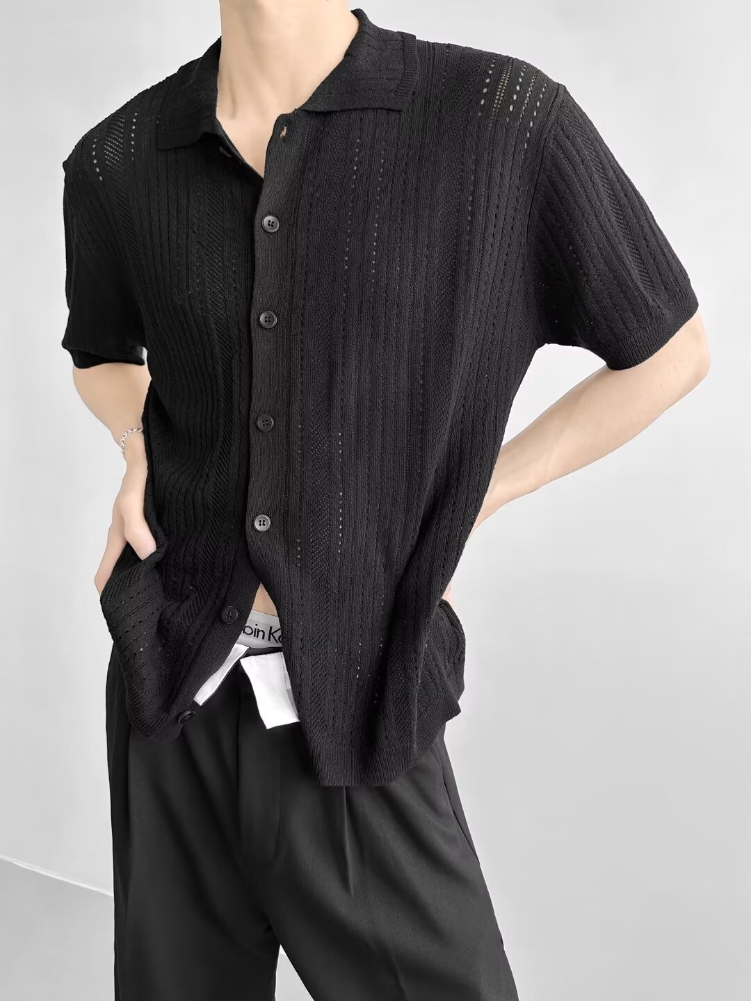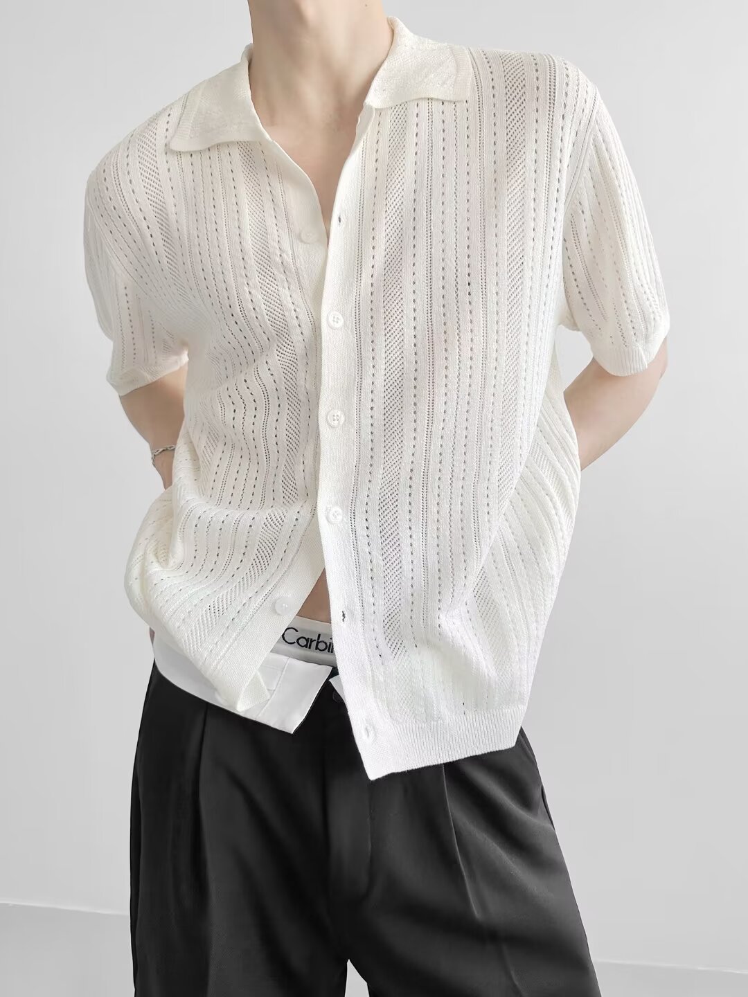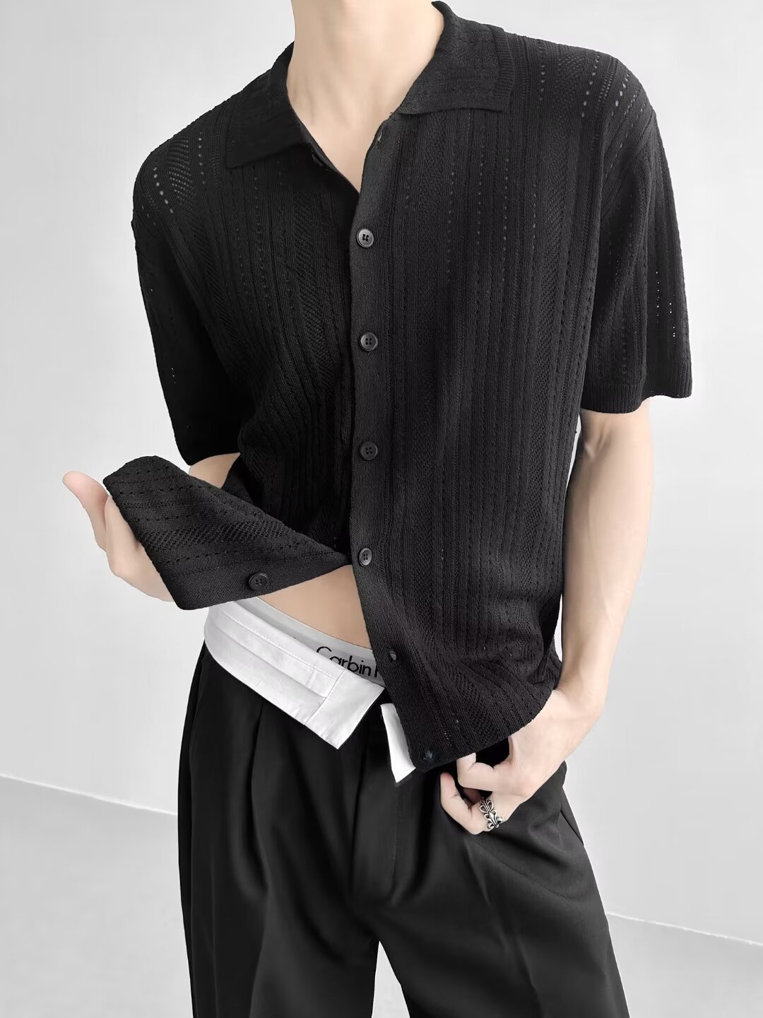 Coreano con solapa hueca de manga corta abstinencia masculina camisa de punto de moda camisa de encaje cardigan camiseta de verano