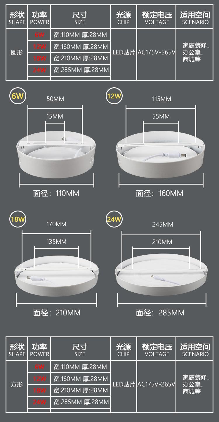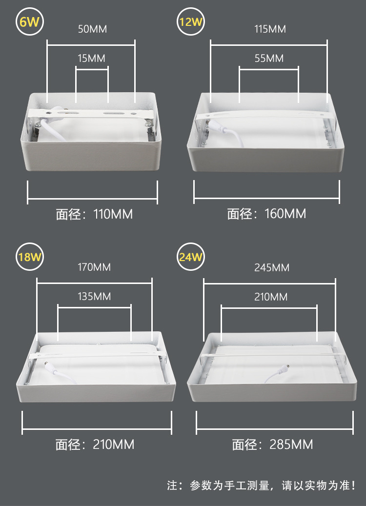 | Poder | Paquete de aluminio 6W [diámetro redondo 11CM],Paquete de aluminio 12W [diámetro redondo 16CM],Todo aluminio en el paquete 18W [diámetro redondo 21CM],Todo el aluminio de 24W [diámetro redondo 28CM],Paquete de aluminio 6W [diámetro cuadrado 11CM],Todo el aluminio de 12W [diámetro cuadrado 16CM],Todo el aluminio de 18W [diámetro cuadrado 21CM],Todo el aluminio de 24W [diámetro cuadrado 28CM] |