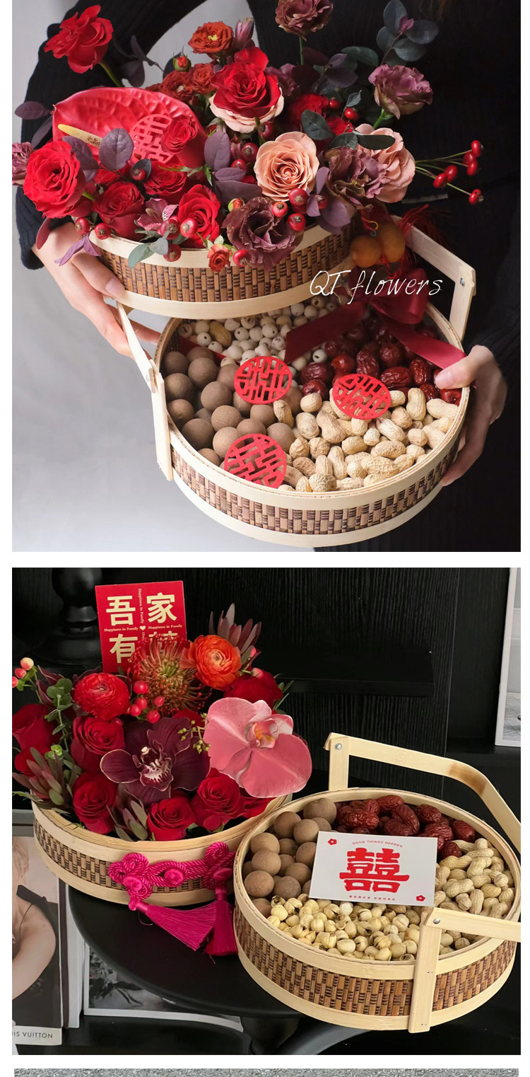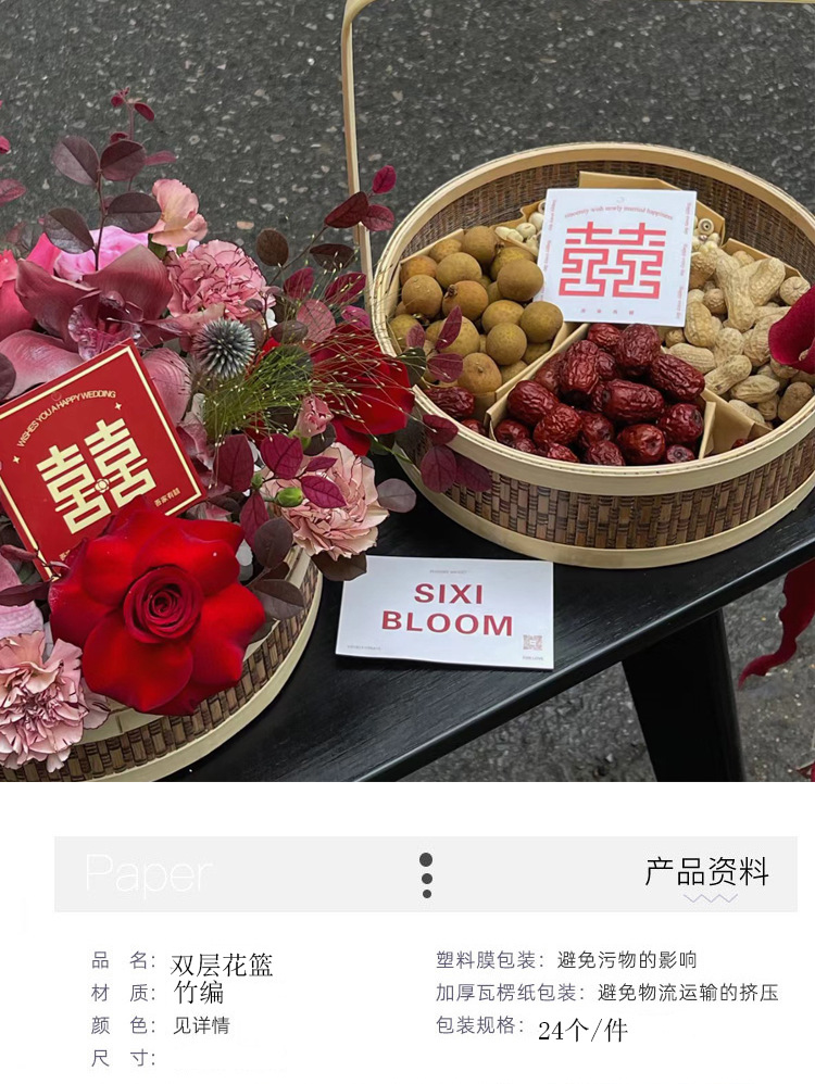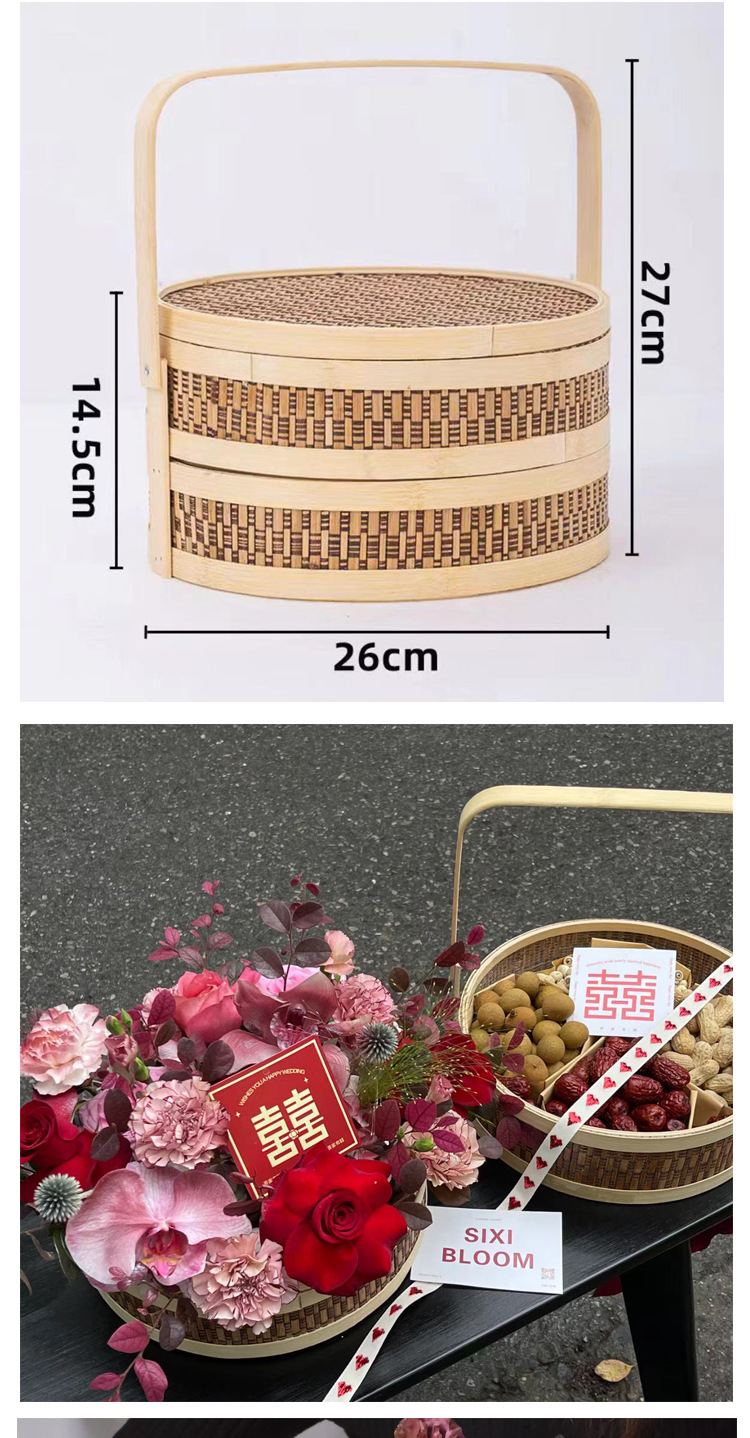 Nuevo estilo chino de bambú de doble capa de mano cesta de flores tejida a mano cesta de arreglos florales cesta de frutas de embalaje