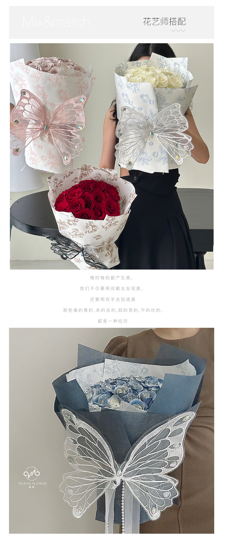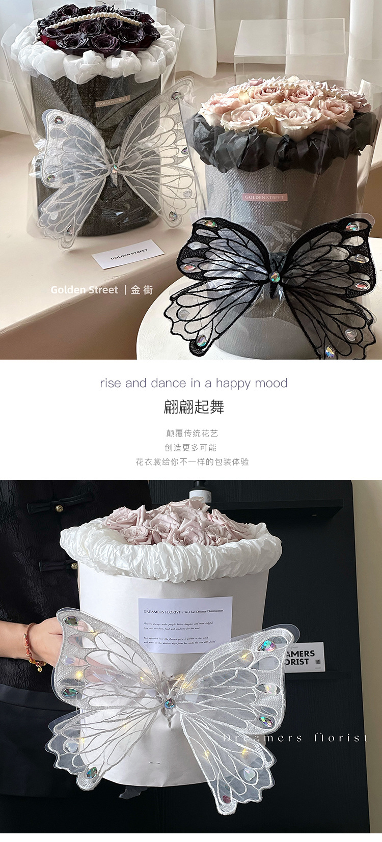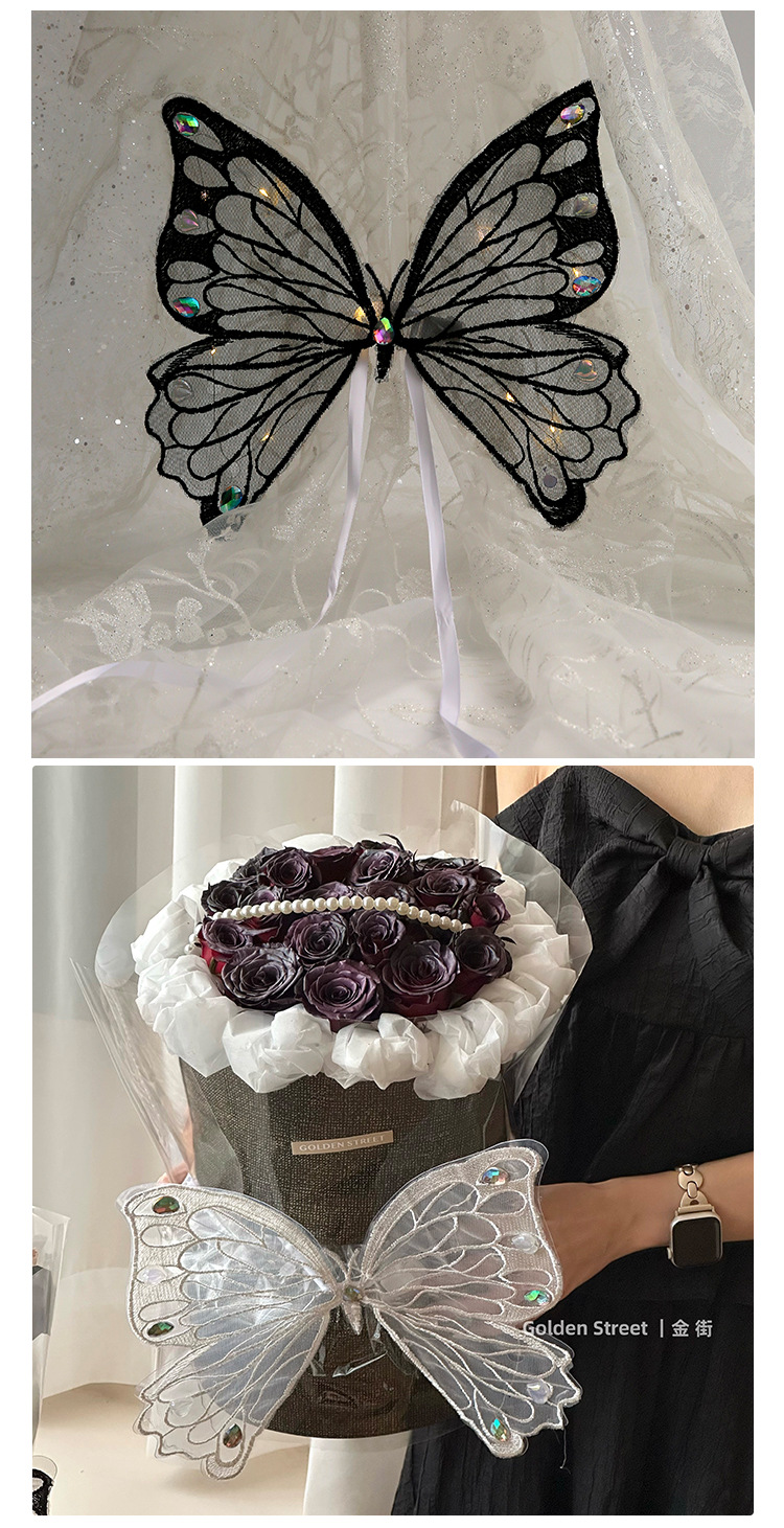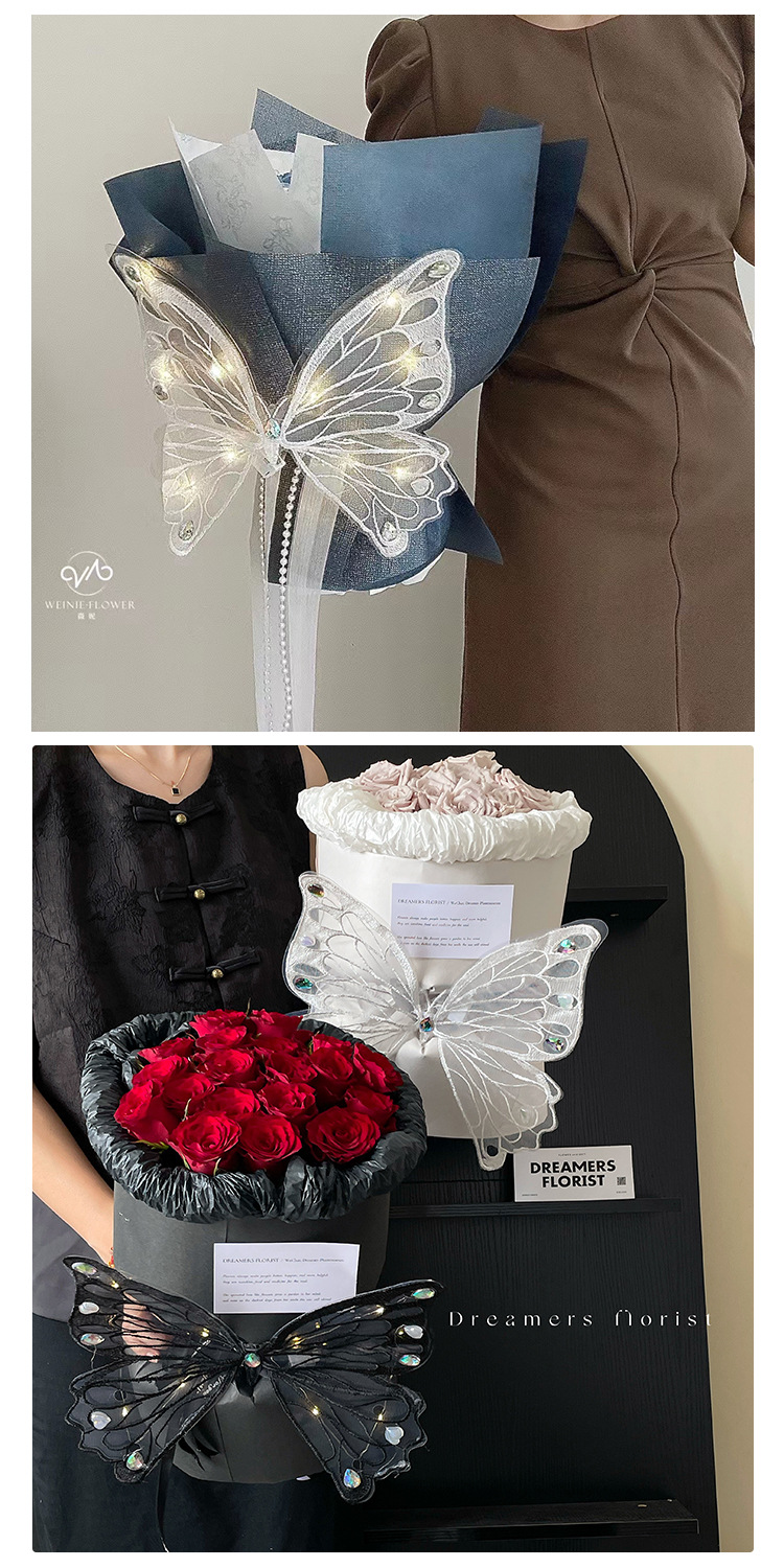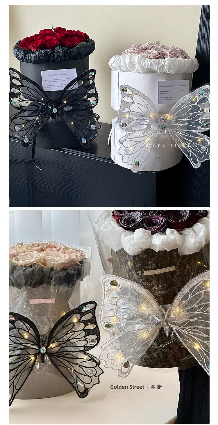 Qixi Nueva simulación de baile bordado tridimensional encaje mariposa luminosa DIY ramo decorativo caja de regalo Accesorios