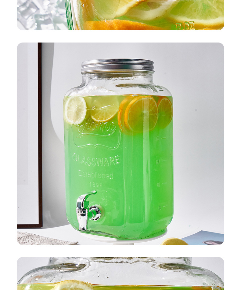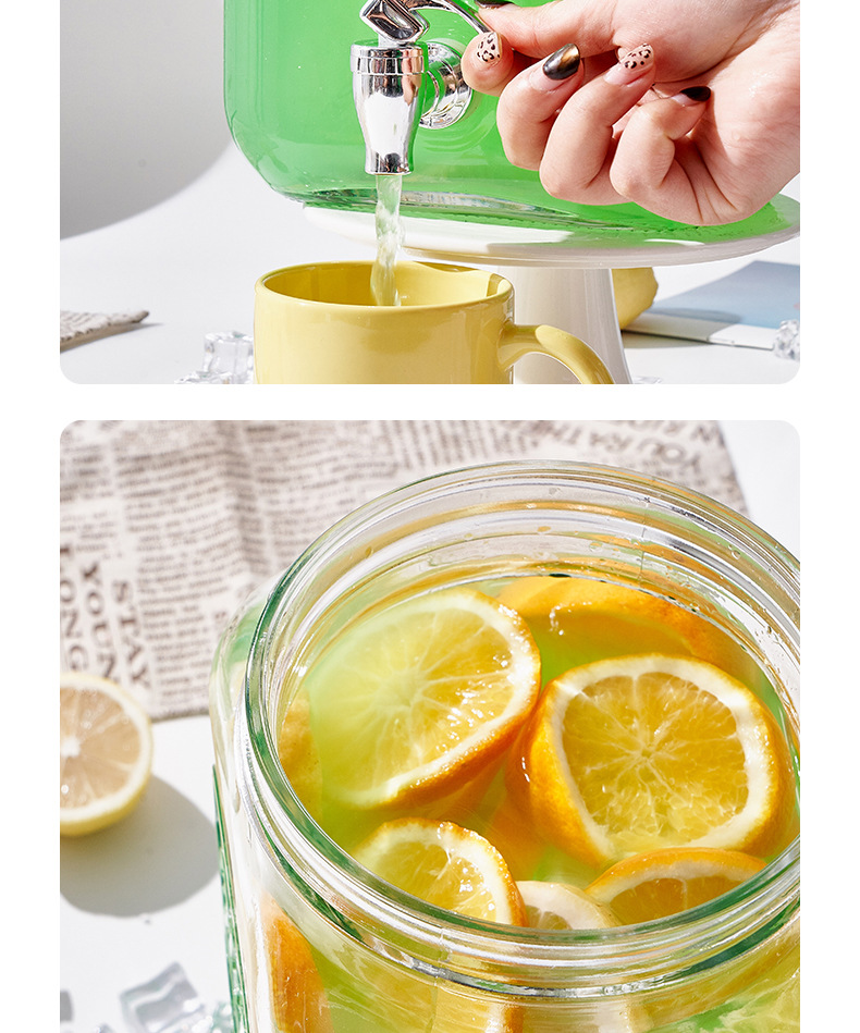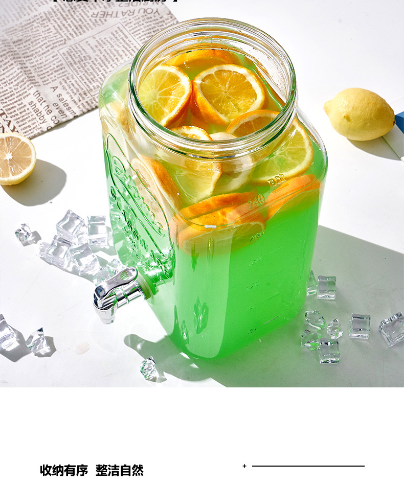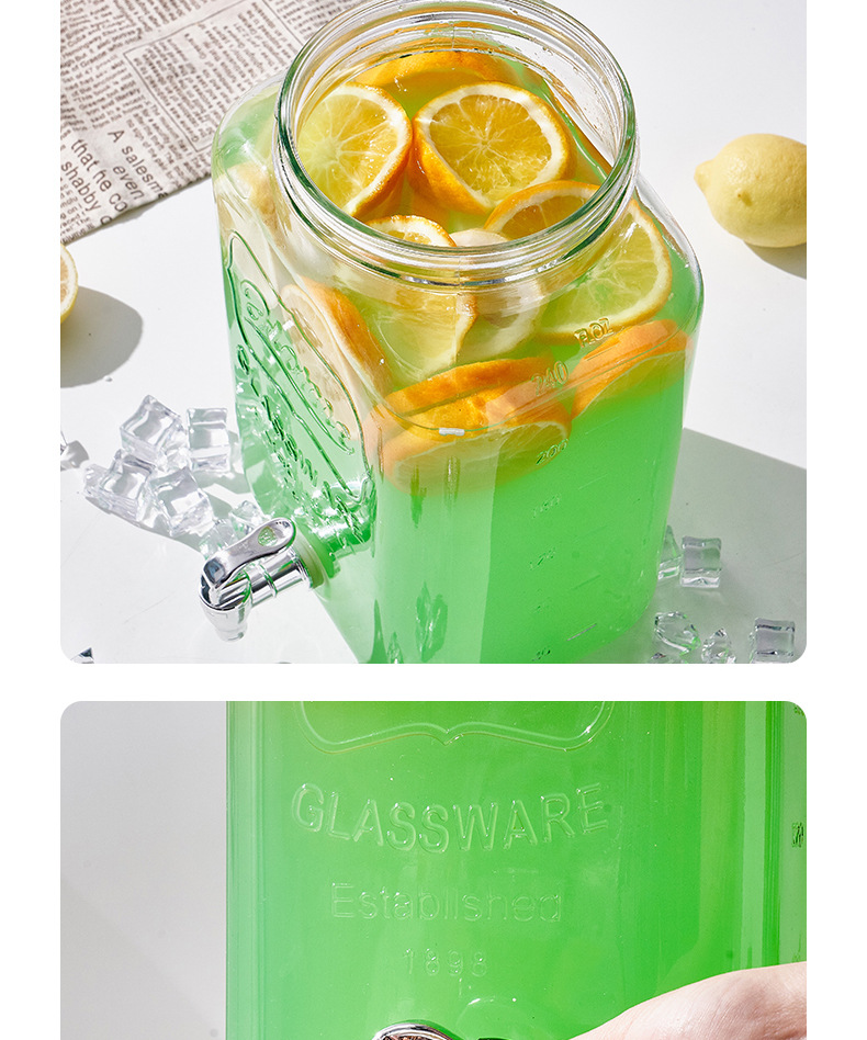 Barril de Coca-Cola, botella de vidrio con grifo, barril de bebida, jugo de limón, frutas, barril de té, barril de mezcla