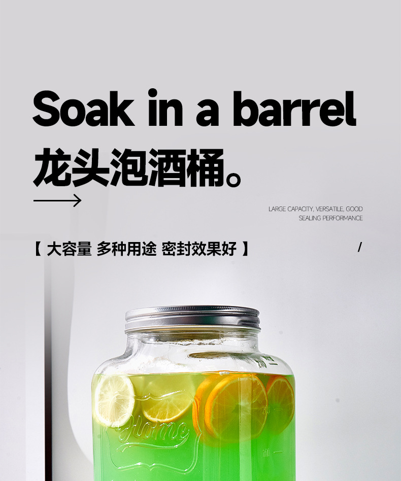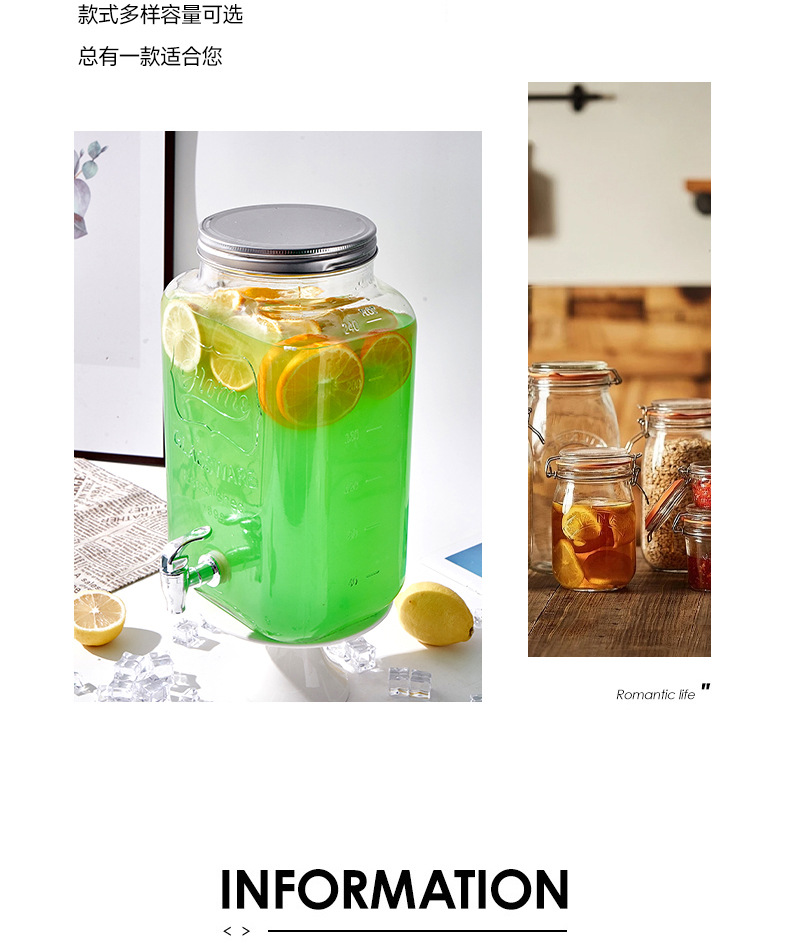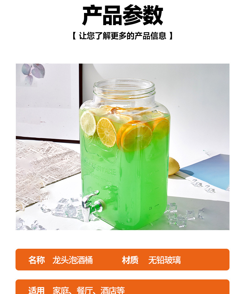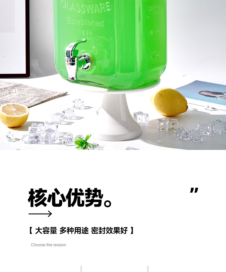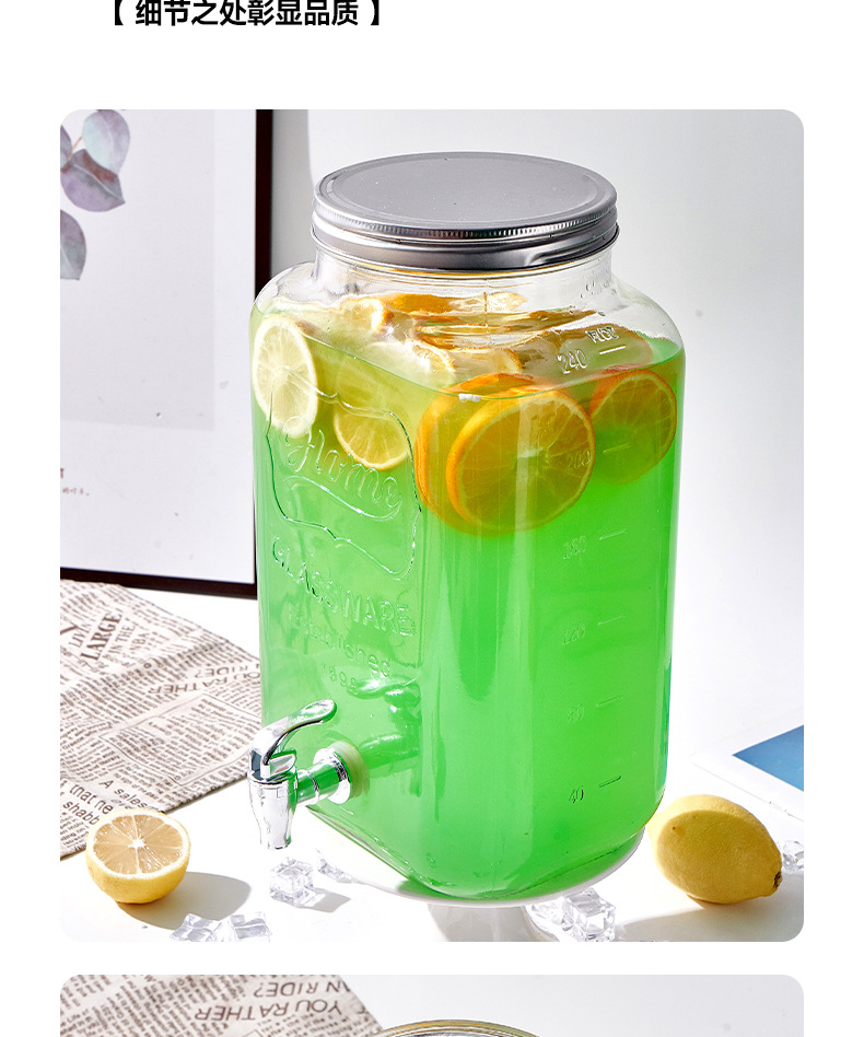 Barril de Coca-Cola, botella de vidrio con grifo, barril de bebida, jugo de limón, frutas, barril de té, barril de mezcla
