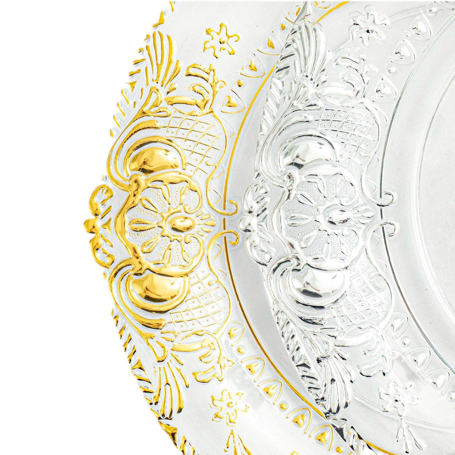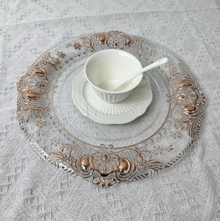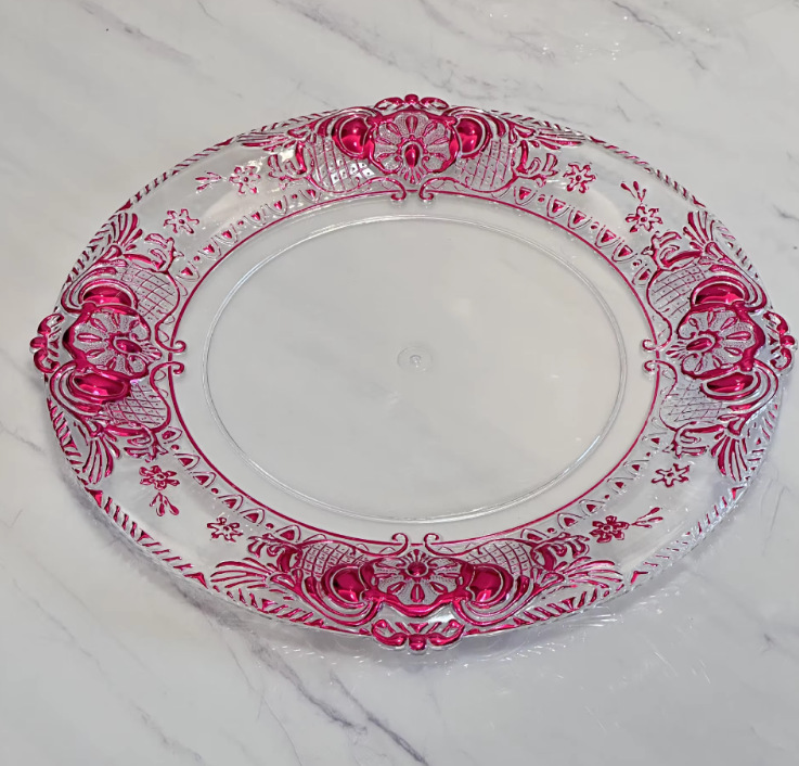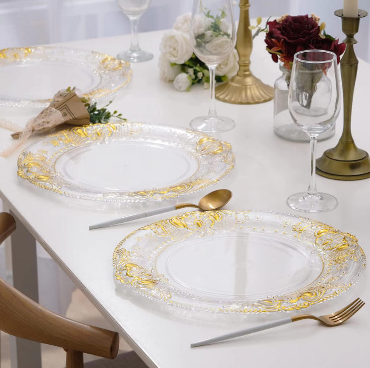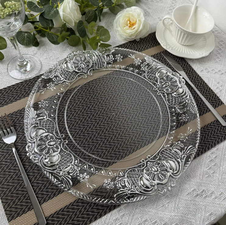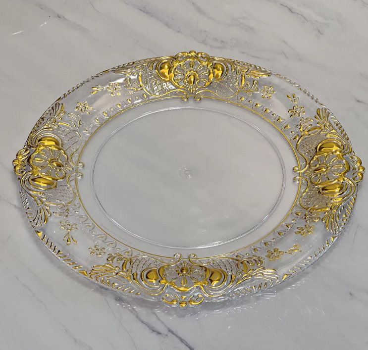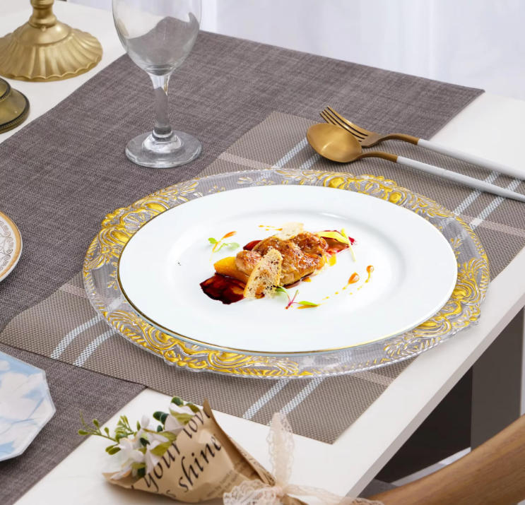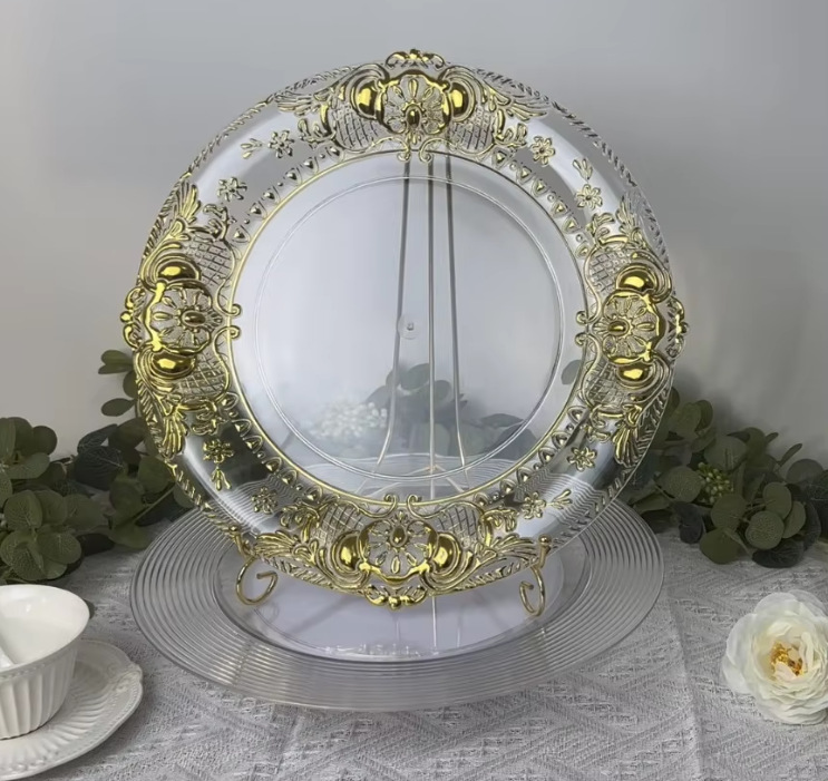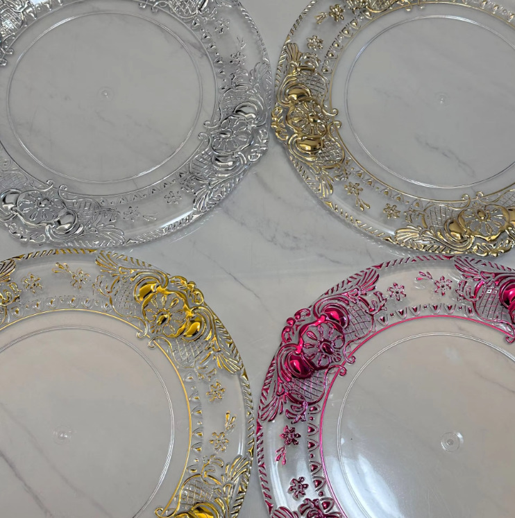 Cargador de plástico retro al por mayor decoración de fiesta de bodas 13 pulgadas oro plata borde cargador transparente