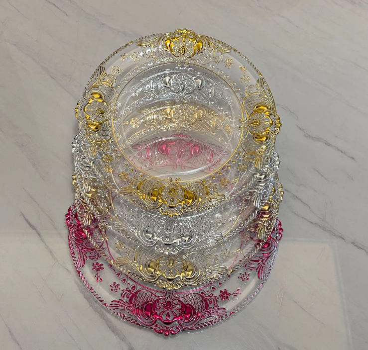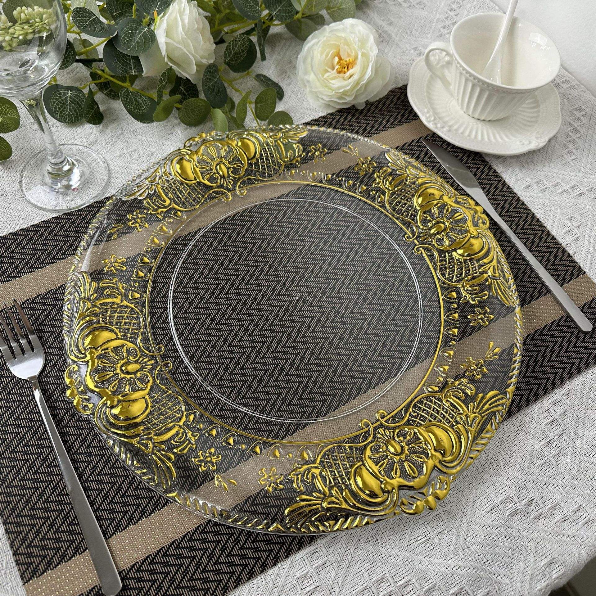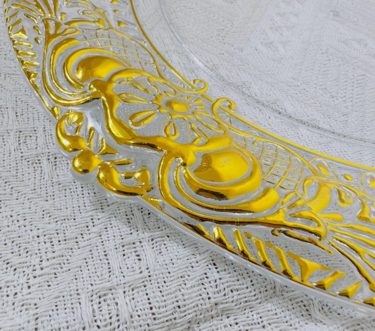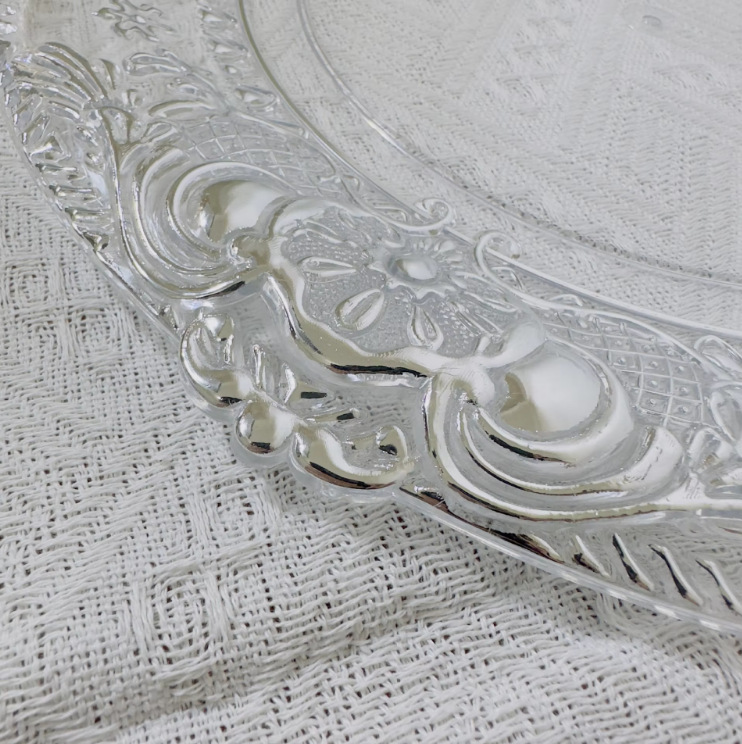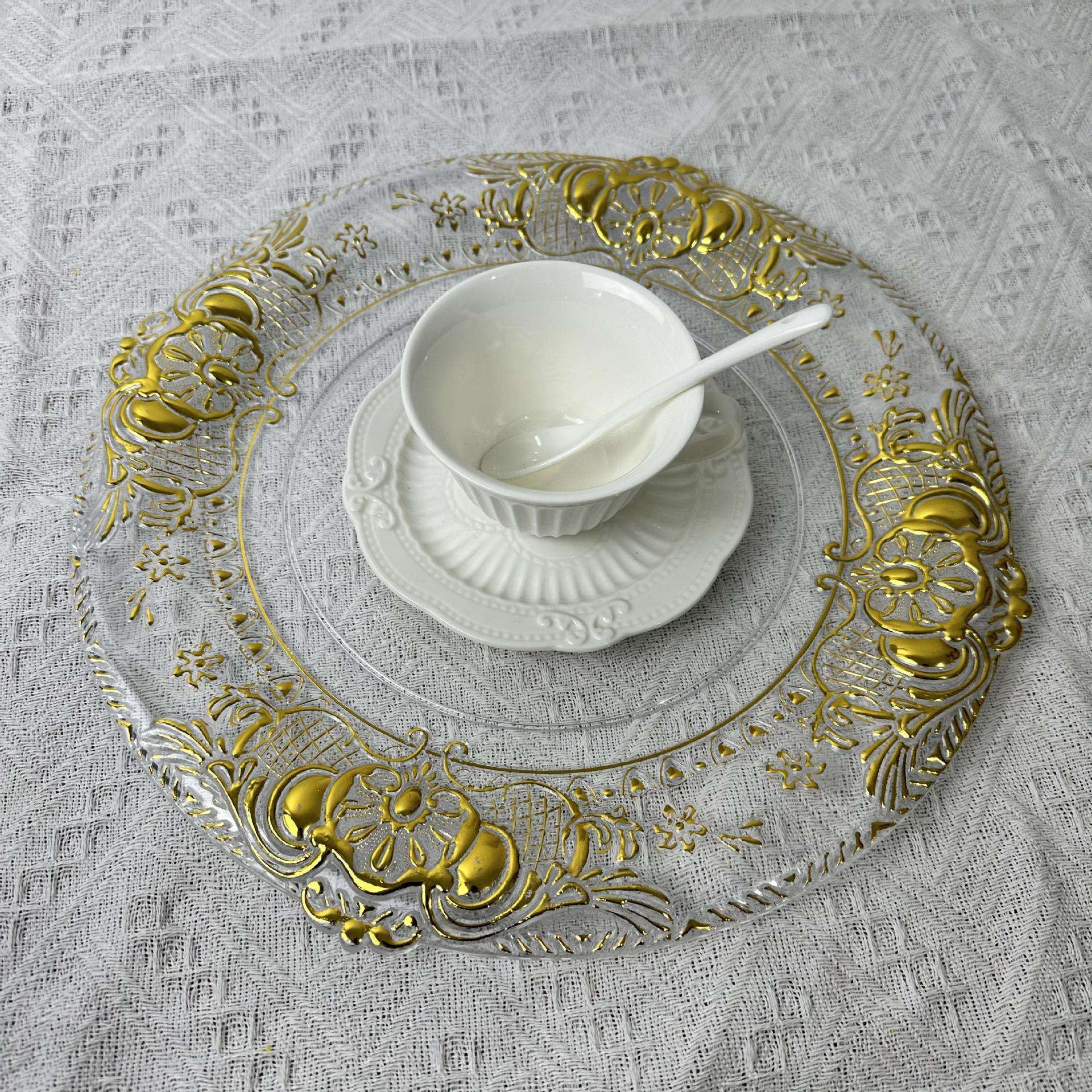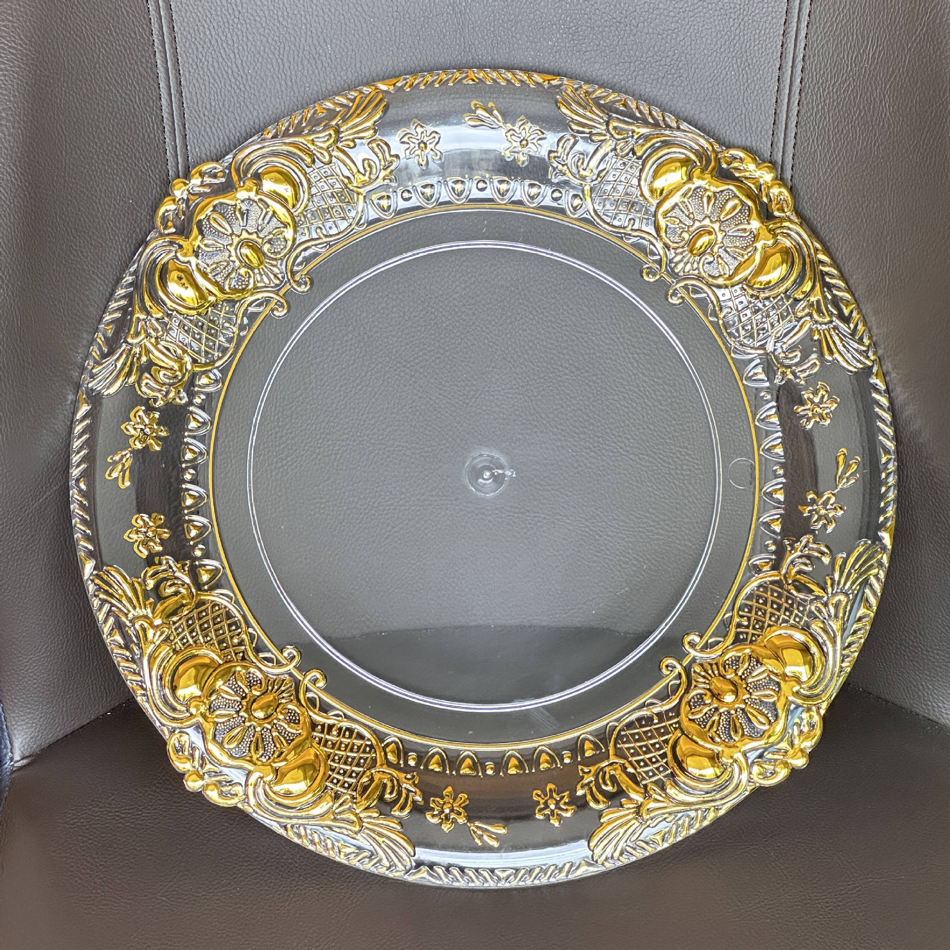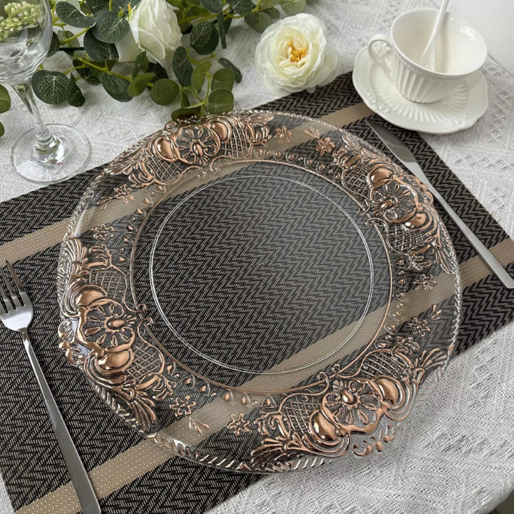 Cargador de plástico retro al por mayor decoración de fiesta de bodas 13 pulgadas oro plata borde cargador transparente