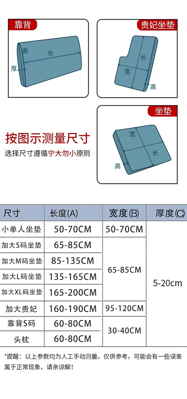 respaldo tamaño S [ancho 40 - 50cm * largo 60 - 80cm * espesor 5 - 20cm]