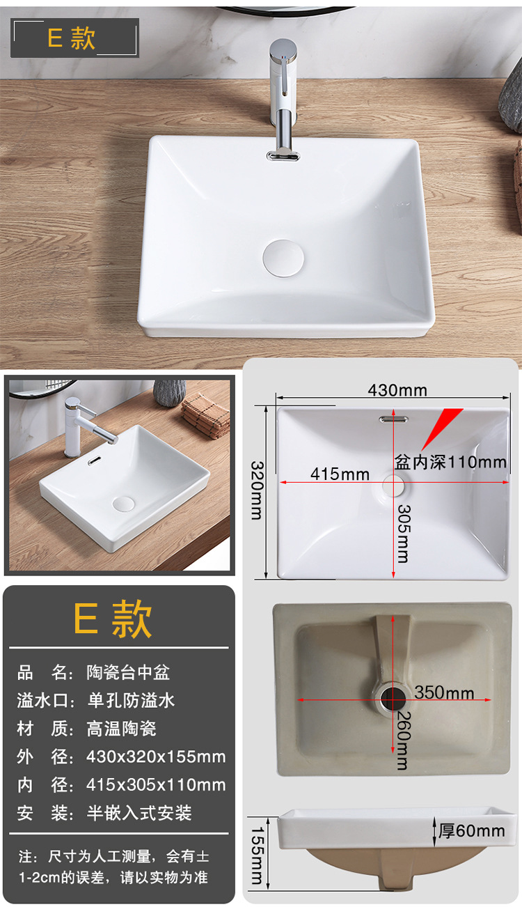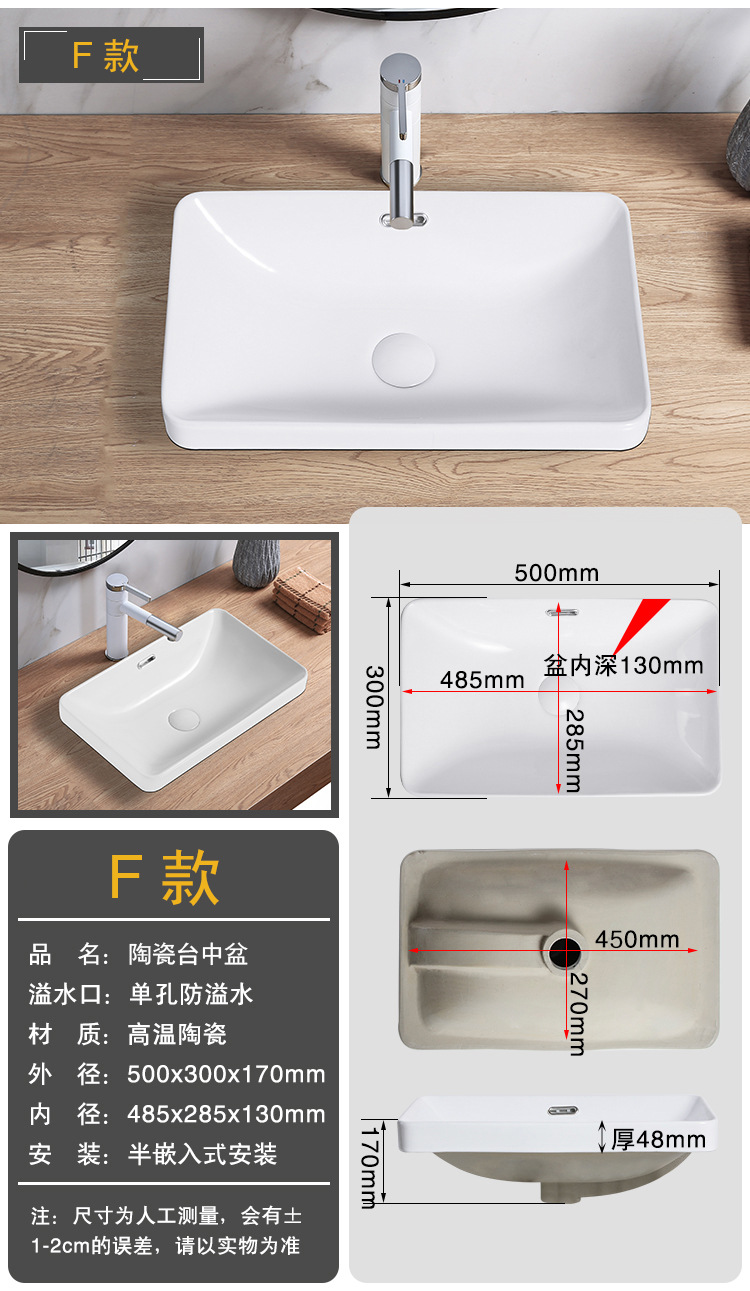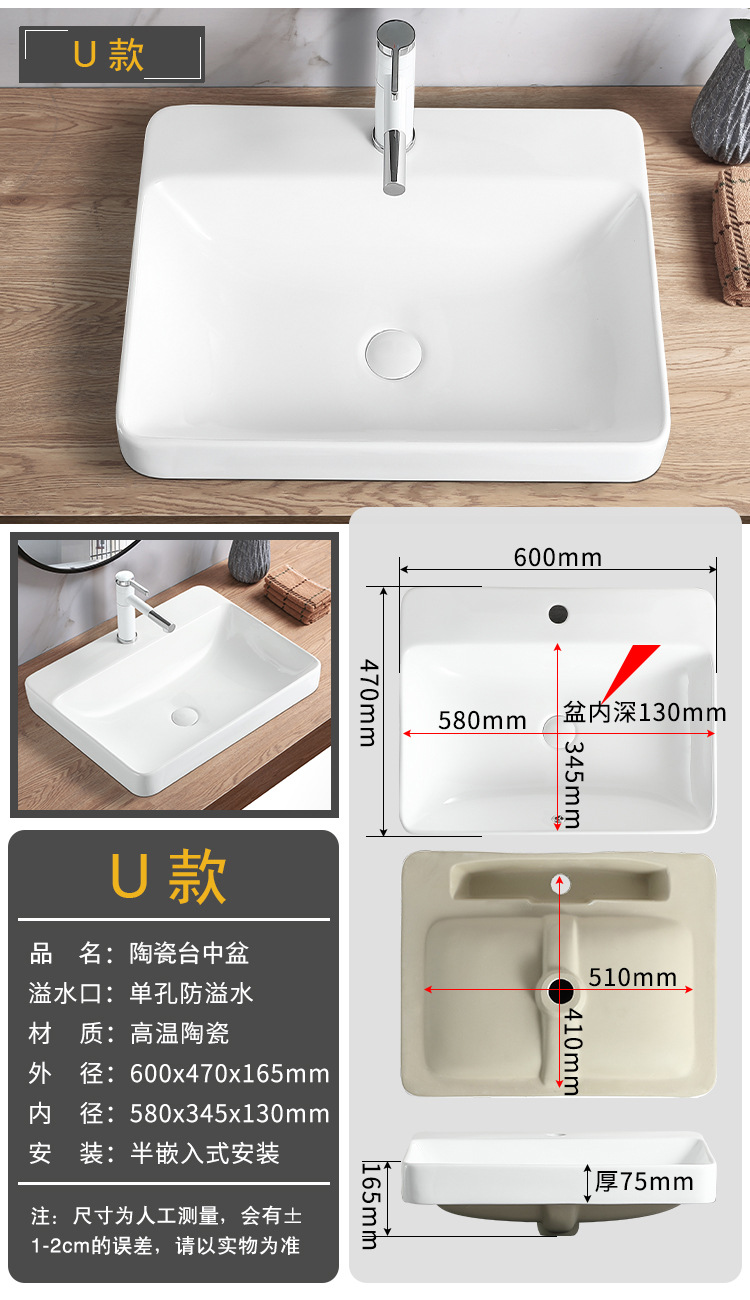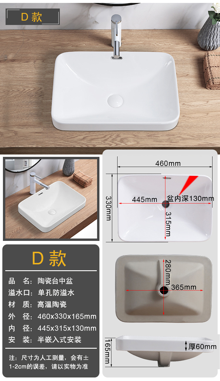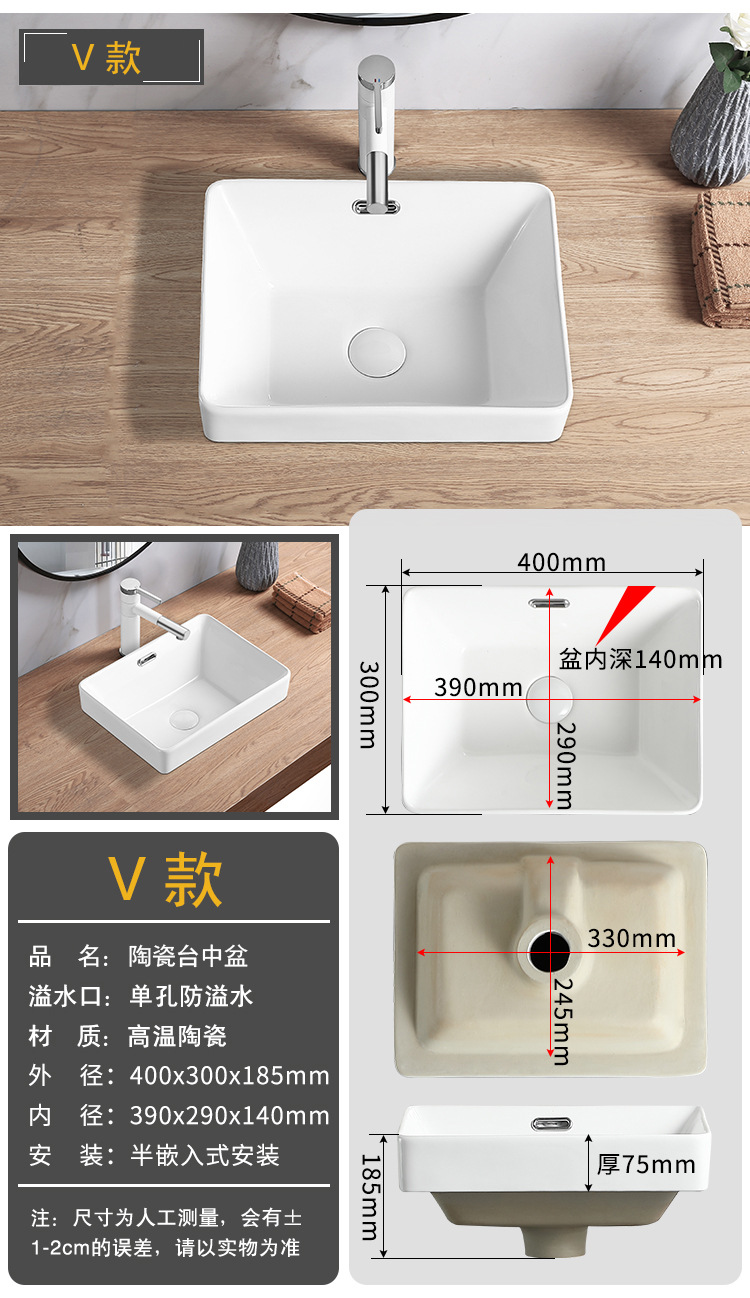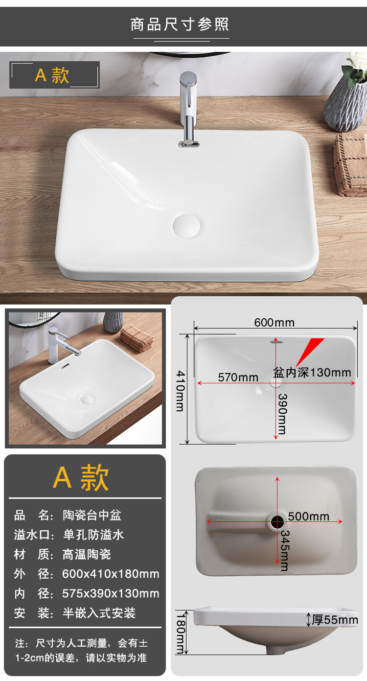 Taizhong cuenca semicrumpida en cerámica cuenca de mesa lavabo de baño doméstico lavabo rectangular lavabo elíptico lavabo