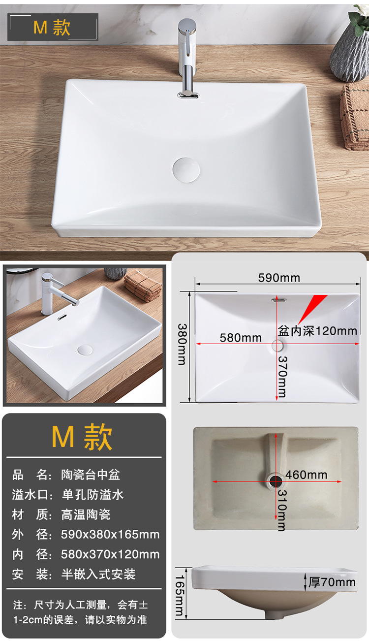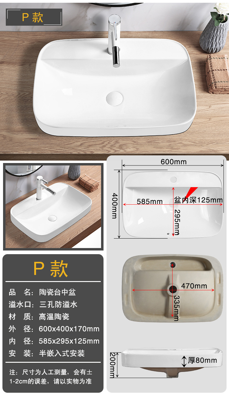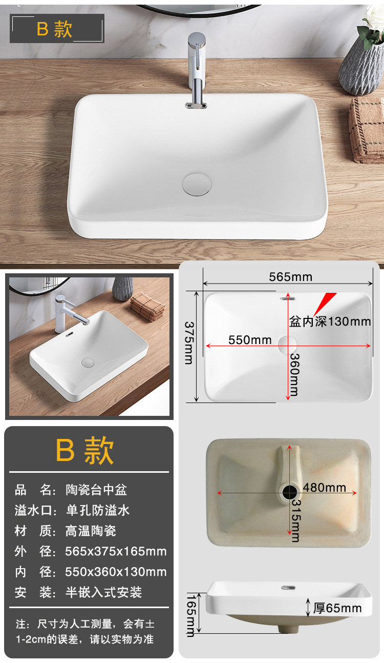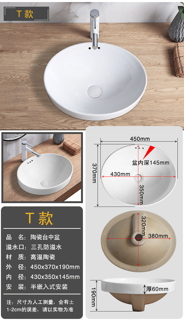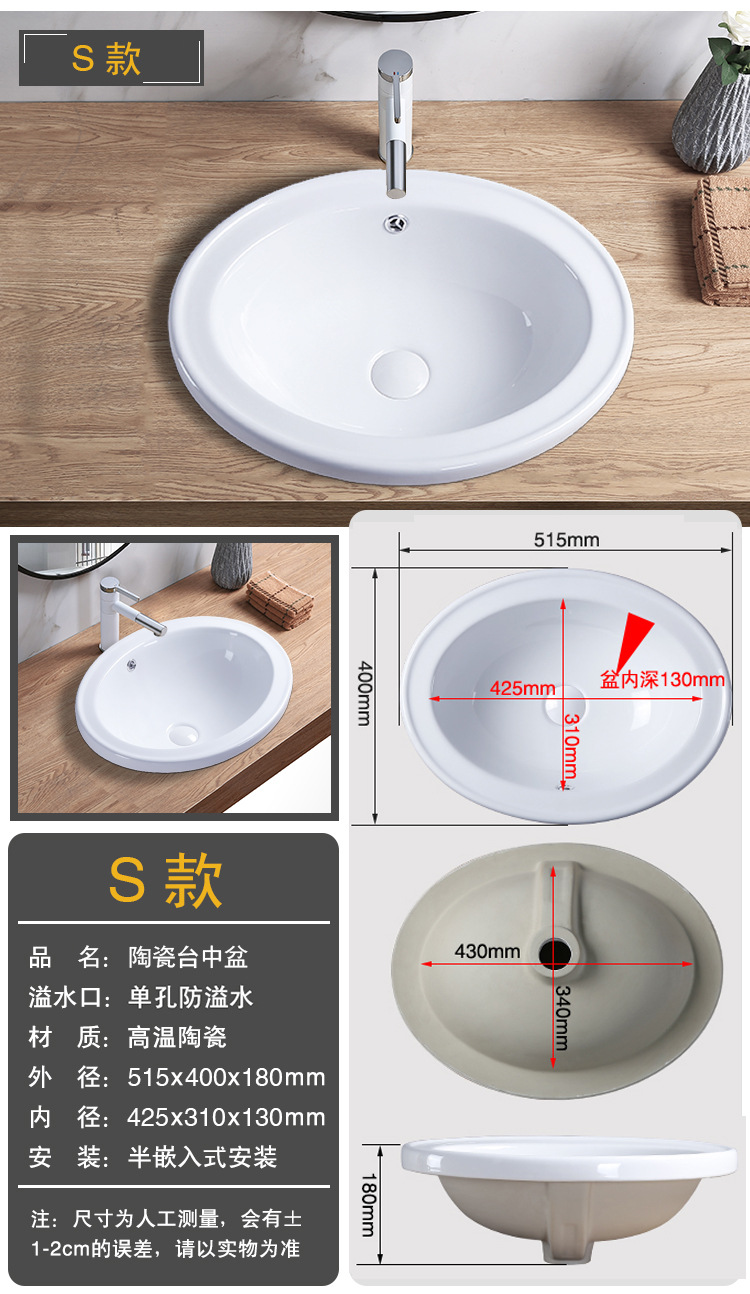 Taizhong cuenca semicrumpida en cerámica cuenca de mesa lavabo de baño doméstico lavabo rectangular lavabo elíptico lavabo