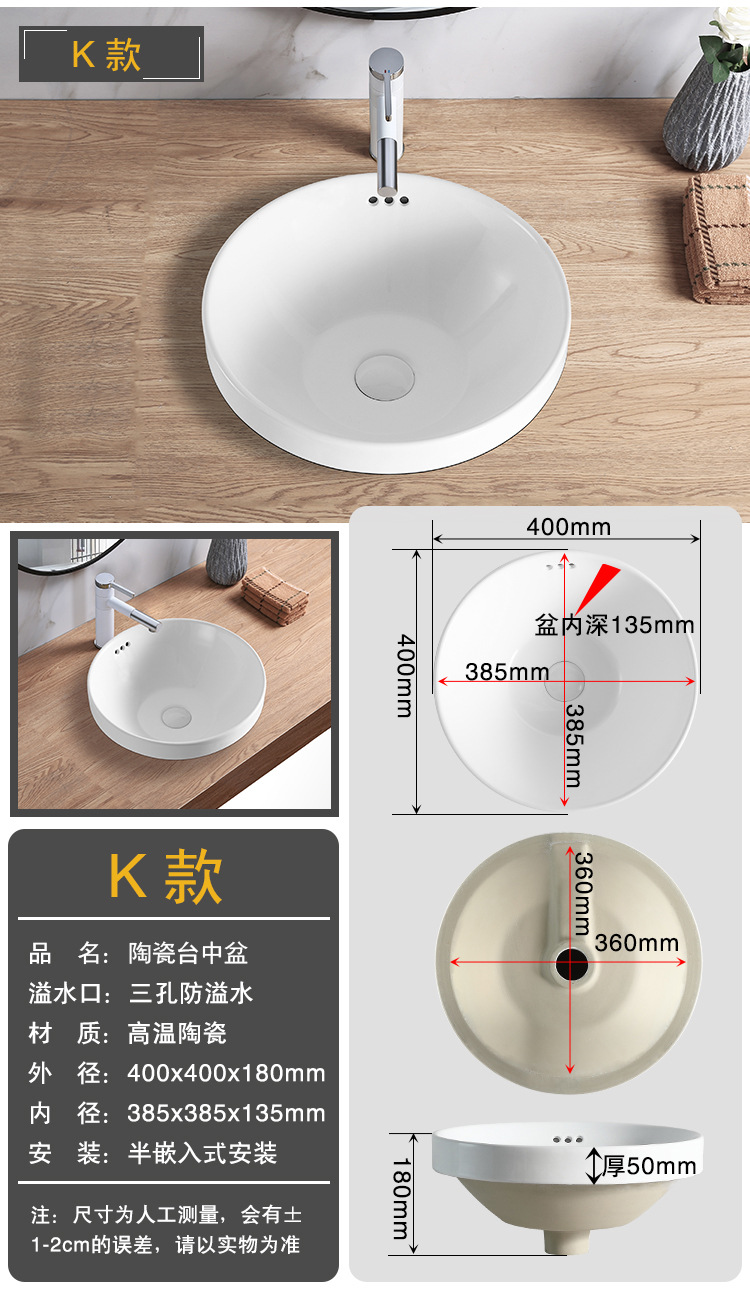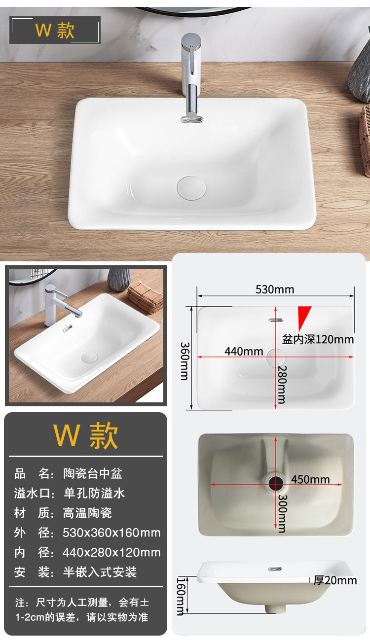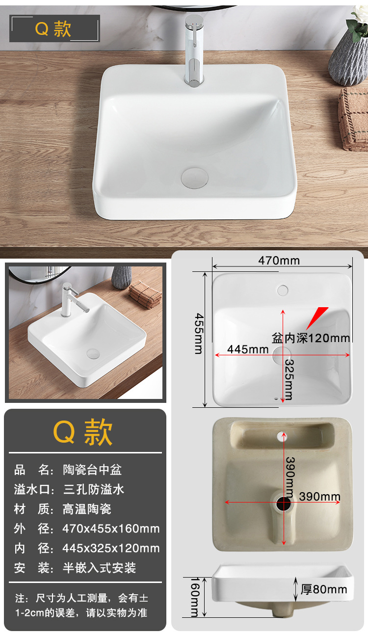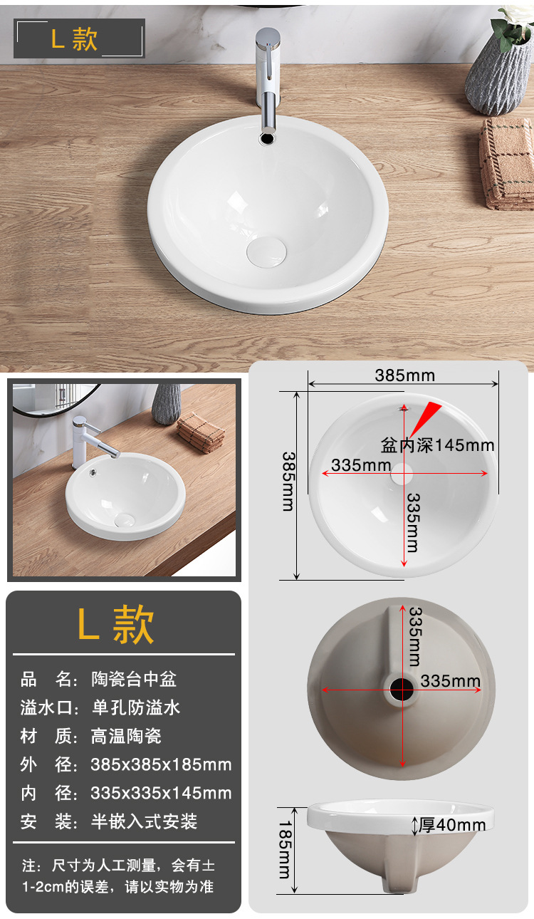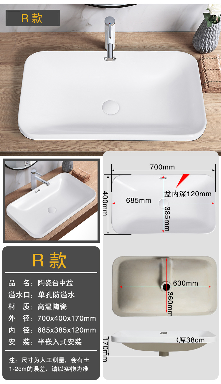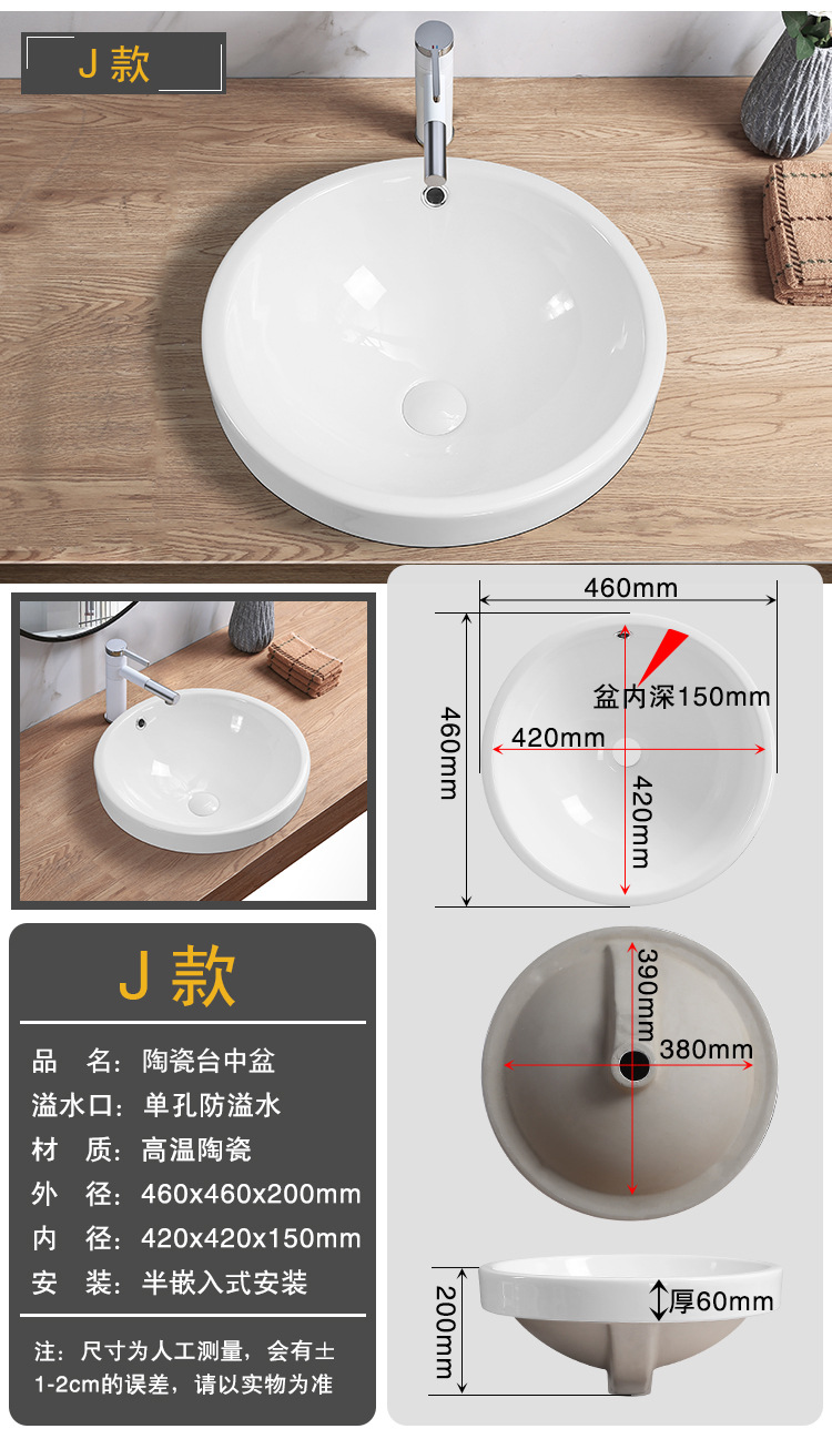 Taizhong cuenca semicrumpida en cerámica cuenca de mesa lavabo de baño doméstico lavabo rectangular lavabo elíptico lavabo