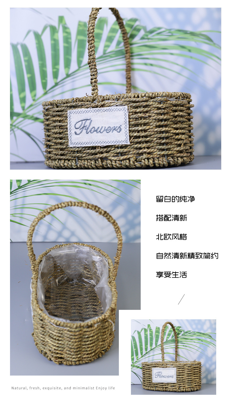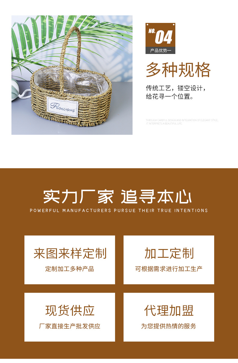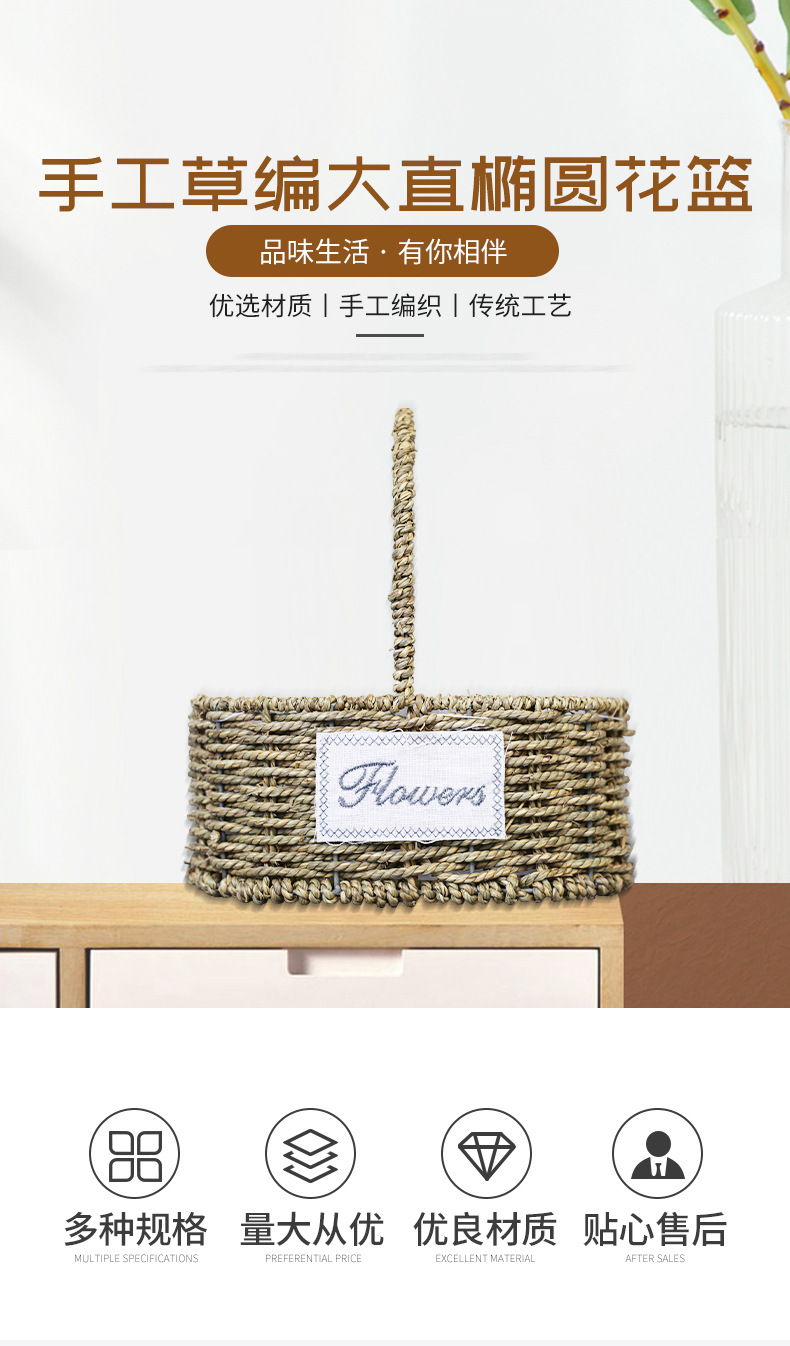 Fabricantes de cestas de flores ovales rectas de paja hechas a mano en stock al por mayor cestas de flores de paja portátiles decoración de viento pastoral