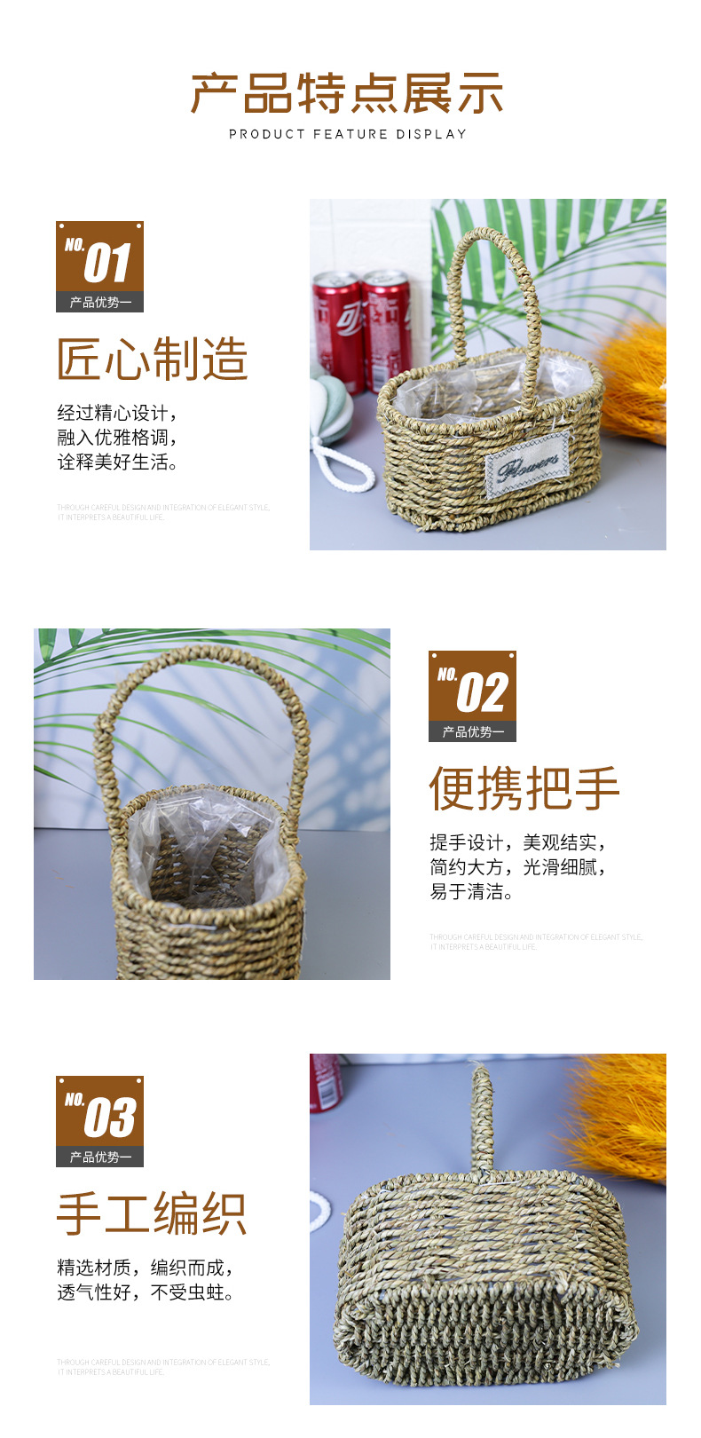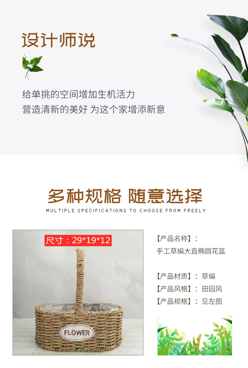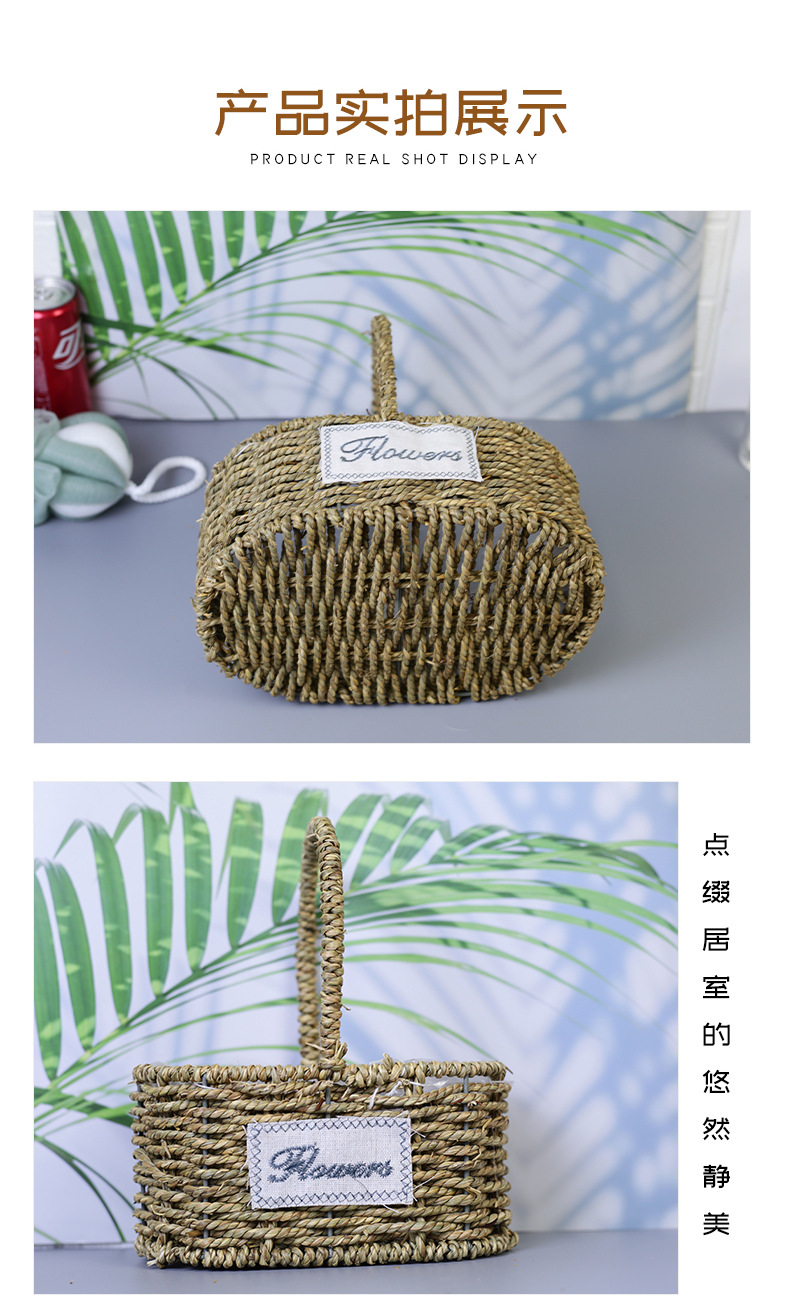 Fabricantes de cestas de flores ovales rectas de paja hechas a mano en stock al por mayor cestas de flores de paja portátiles decoración de viento pastoral